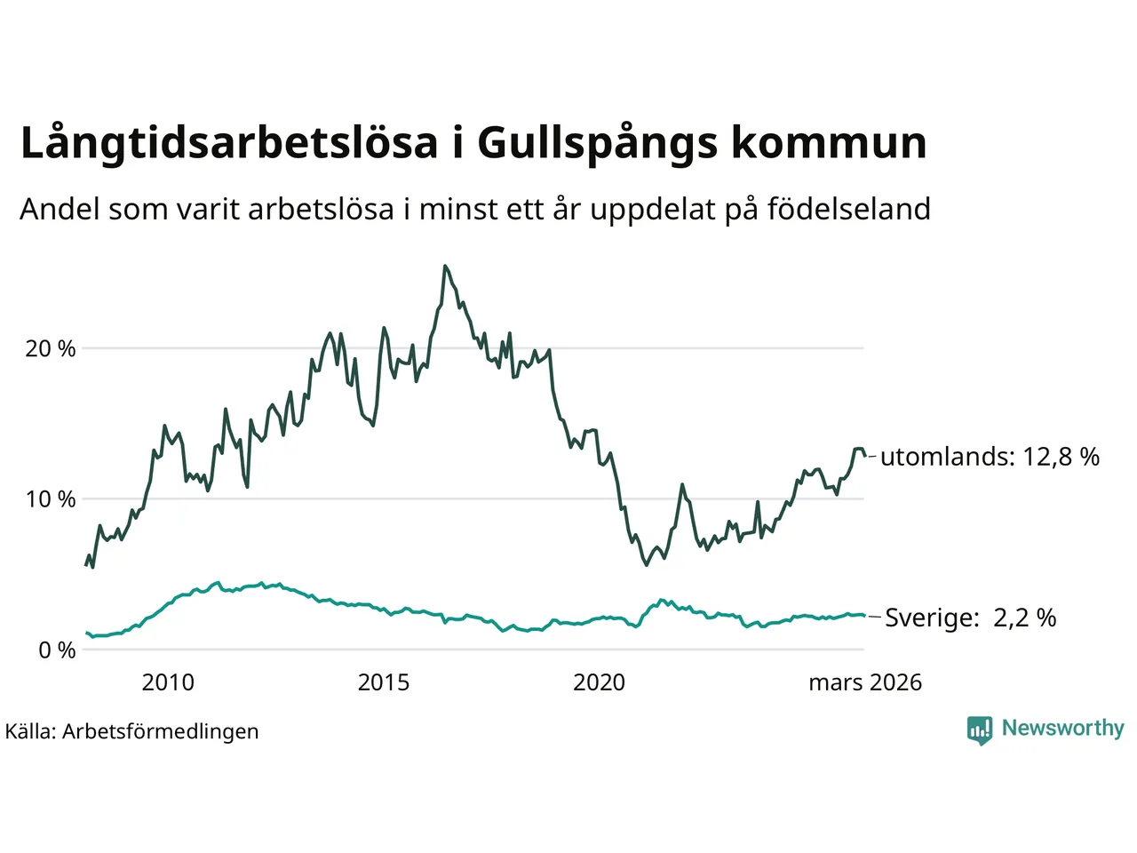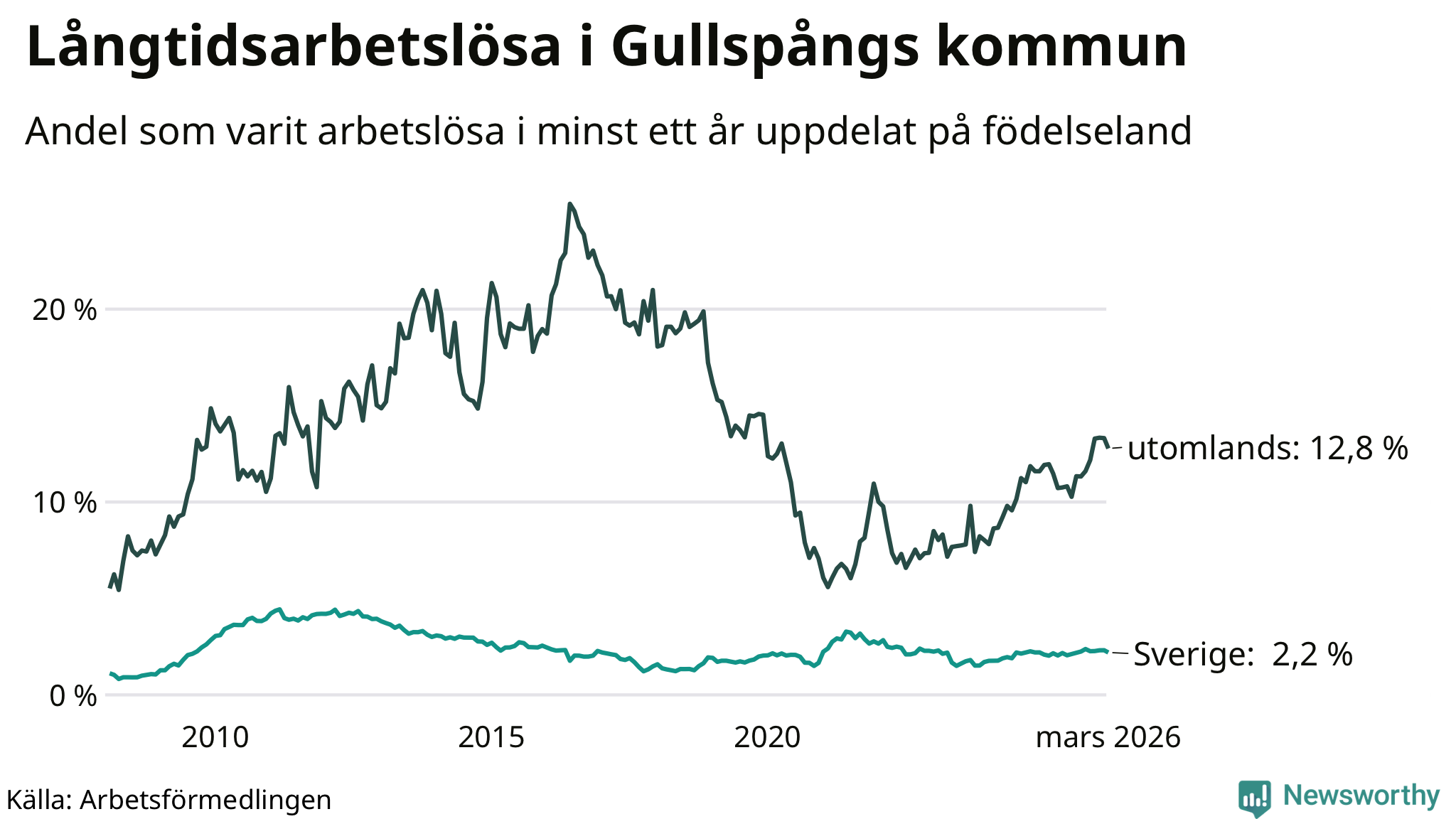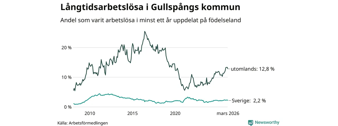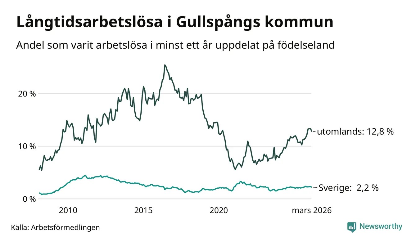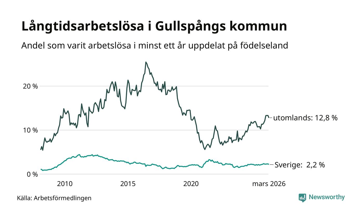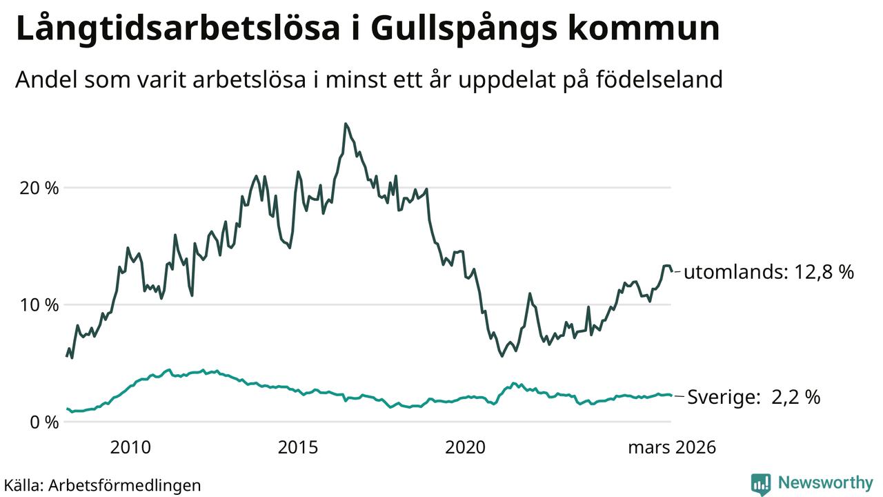 36 av de långtidsarbetslösa i Gullspång är födda i Sverige, medan 48 är födda utomlands. Det innebär att långtidsarbetslösheten bland Sverigefödda är 2,2 procent, medan den är sex gånger så hög – 12,8 procent – bland födda utomlands. Även i riket som helhet är arbetslösheten högre bland utrikesfödda.