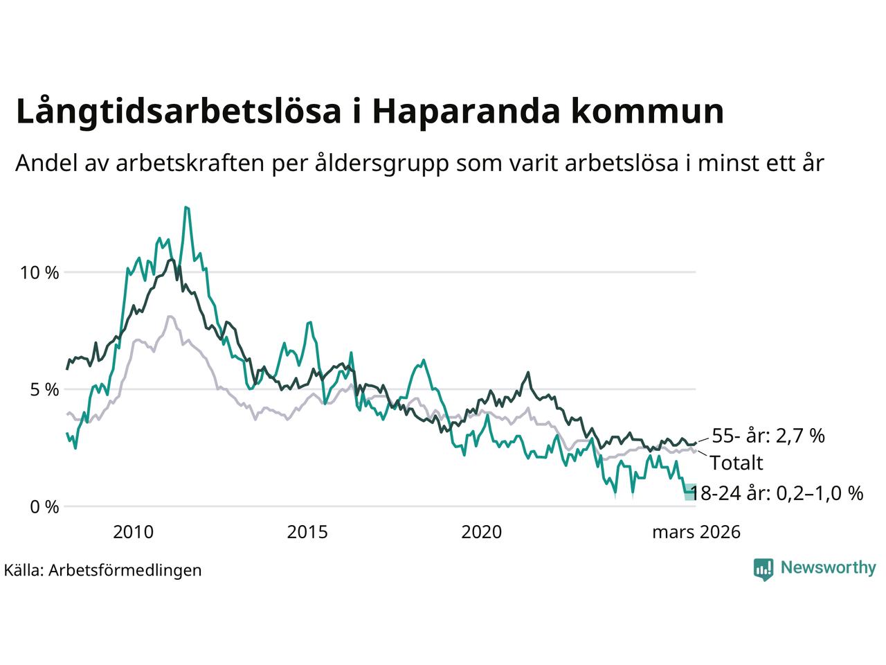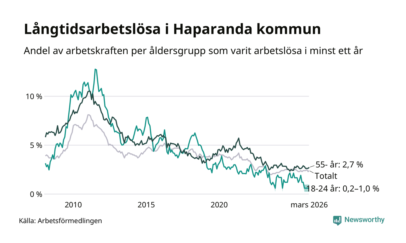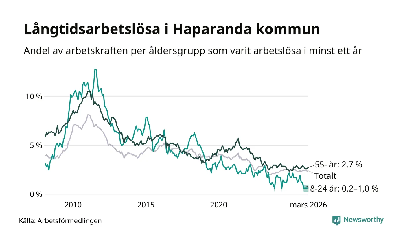 Av de 90 personerna som varit arbetslösa i mer än ett år i Haparanda kommun är 29 personer mellan 55 och 661 år och mellan en och fyra är mellan 18 och 24 år. För den äldre gruppen är andelen arbetslösa 2,7 procent medan den i den yngre gruppen är mellan 0,2 och 1,0 procent. Även i riket som helhet är långtidsarbetslösheten högre i gruppen äldre.