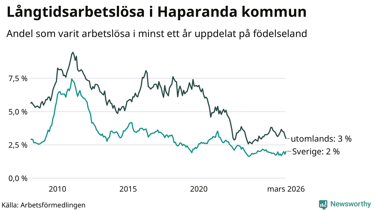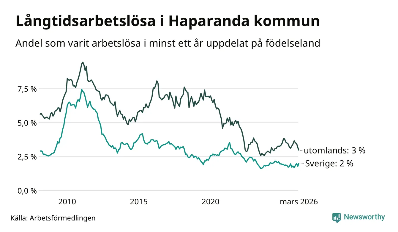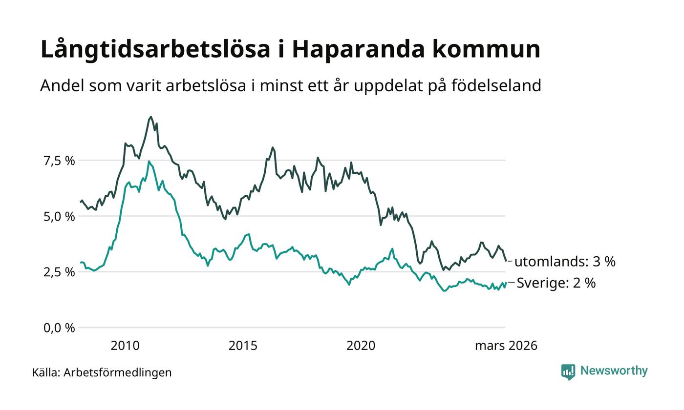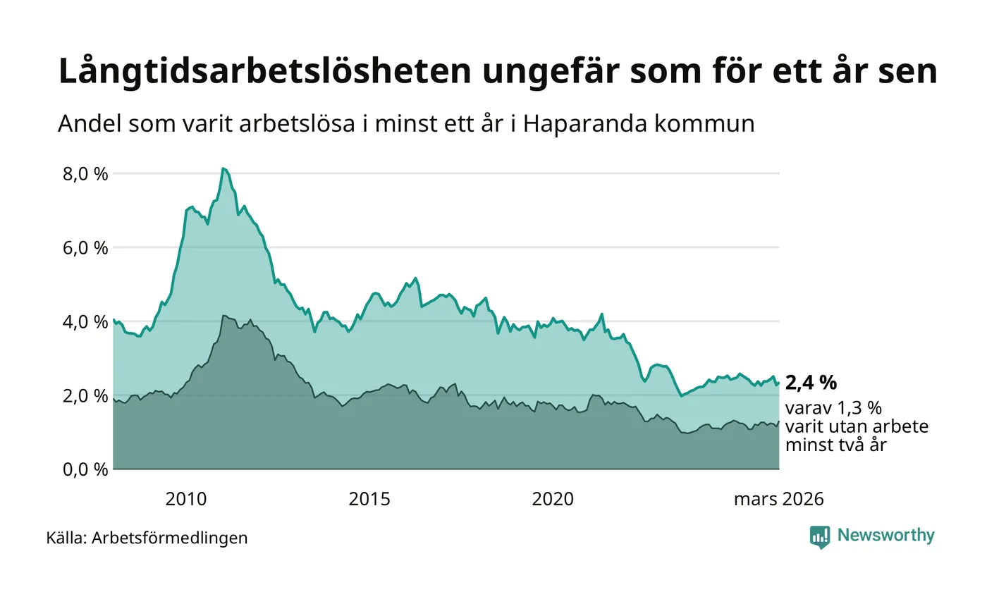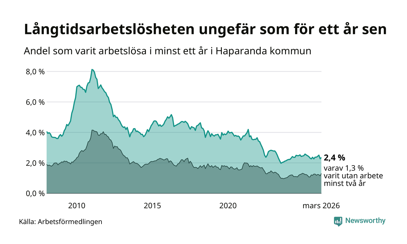 I mars hade 90 Haparandabor varit arbetslösa i minst ett år, vilket är tre fler än månaden innan. 90 personer motsvarar 2,4 procent av arbetskraften i kommunen – andelen långtidsarbetslösa är ungefär på samma nivå som för ett år sedan.