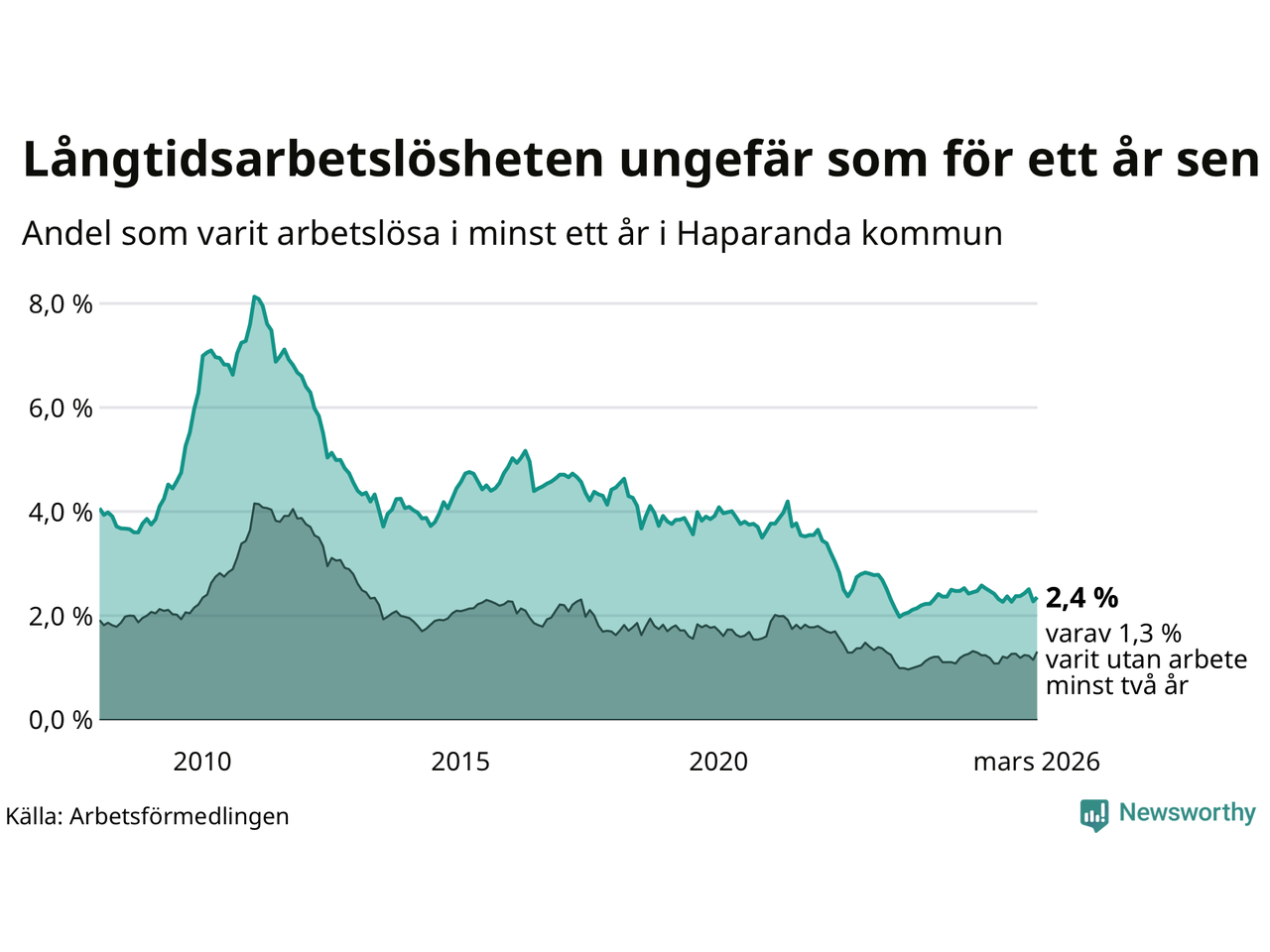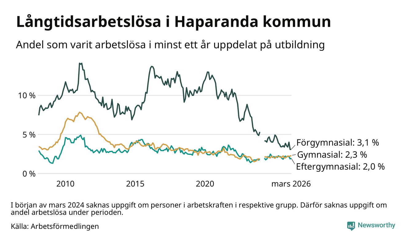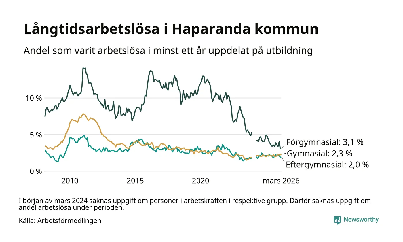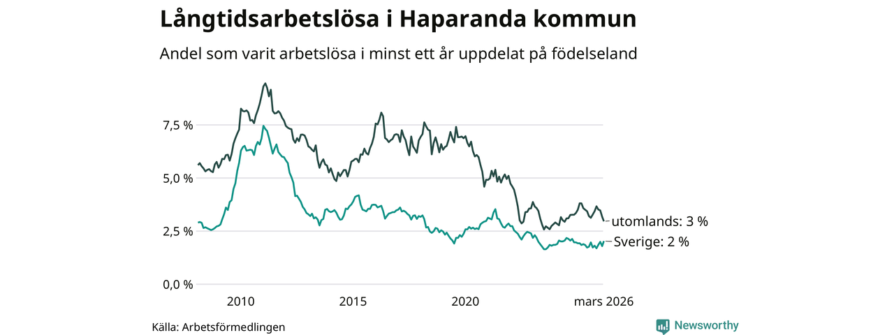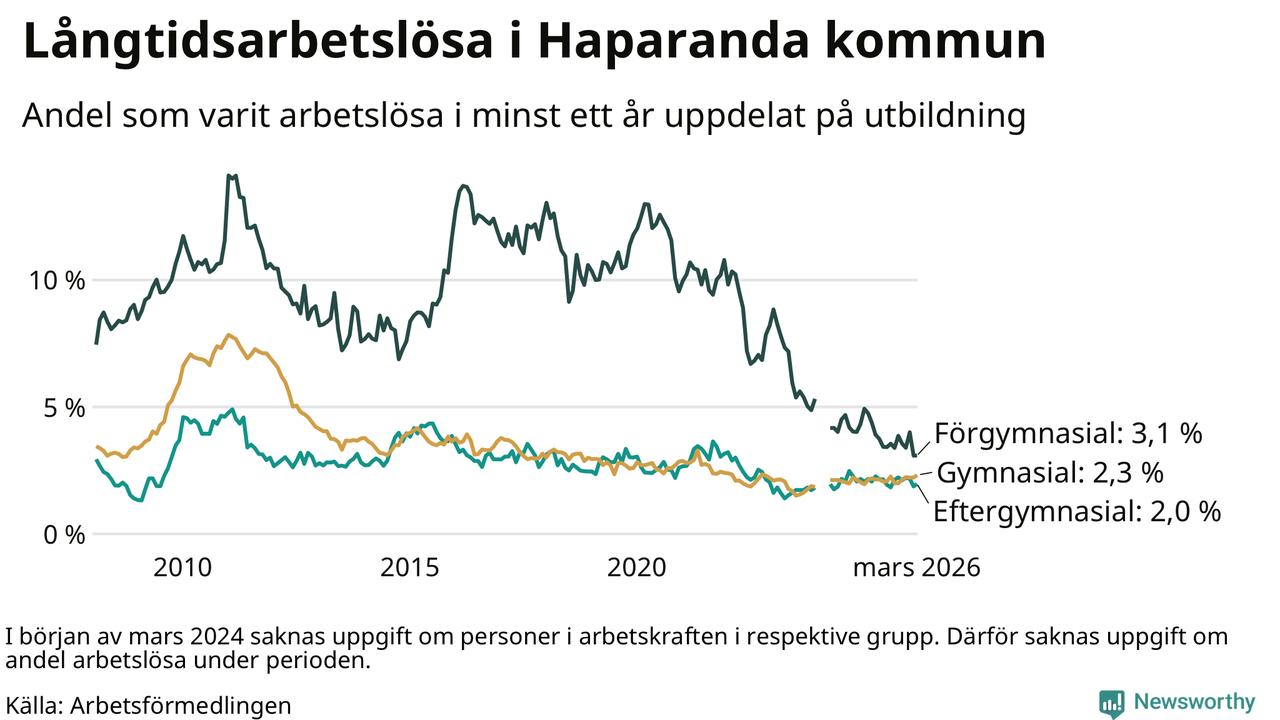 I mars hade 90 Haparandabor varit arbetslösa i minst ett år, vilket är tre fler än månaden innan. 90 personer motsvarar 2,4 procent av arbetskraften i kommunen – andelen långtidsarbetslösa är ungefär på samma nivå som för ett år sedan.