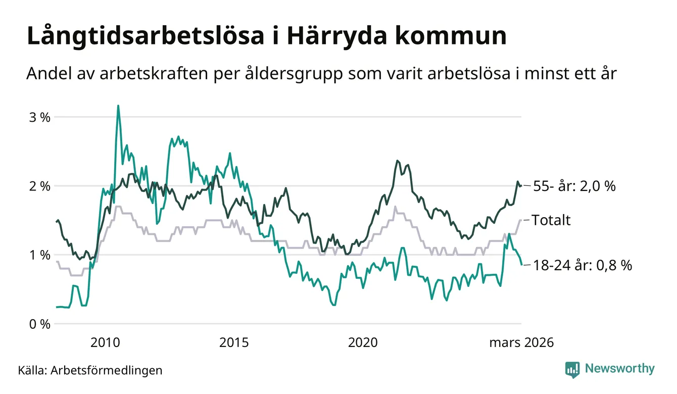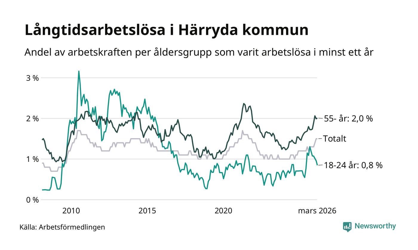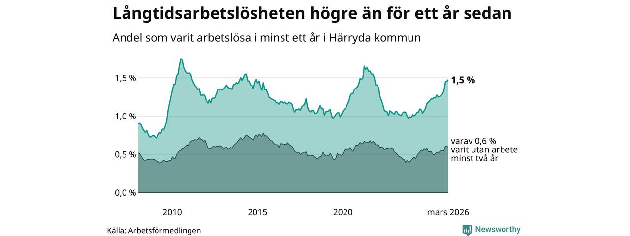 I mars hade 305 Härrydabor varit arbetslösa i minst ett år, vilket är fyra fler än månaden innan. Det är den sjunde månaden i rad med ökande antal långtidsarbetslösa. 305 personer motsvarar 1,5 procent av arbetskraften i kommunen – andelen långtidsarbetslösa är 0,3 procentenheter högre än samma månad för ett år sedan.
