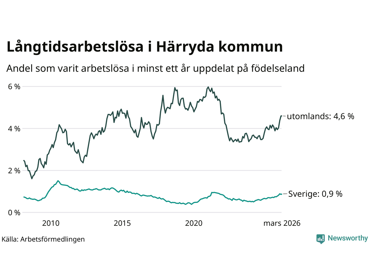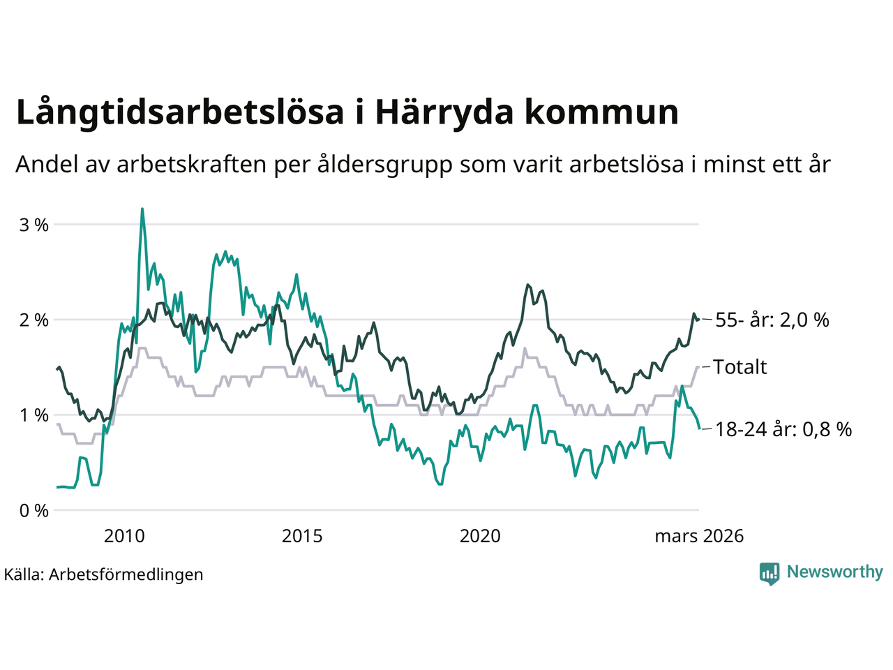 | Andel arbetslösa i minst två år | 0,6 % | 1,3 % | 1,6 % |