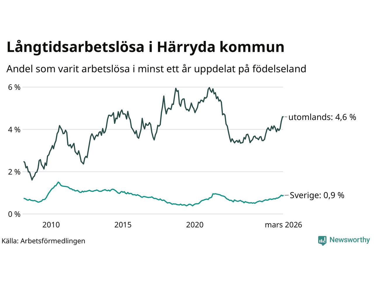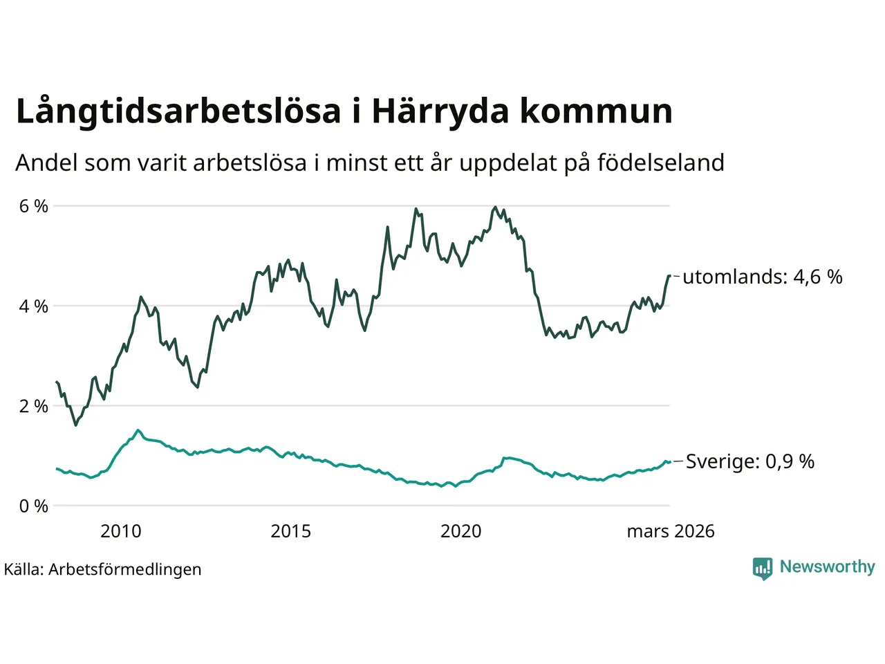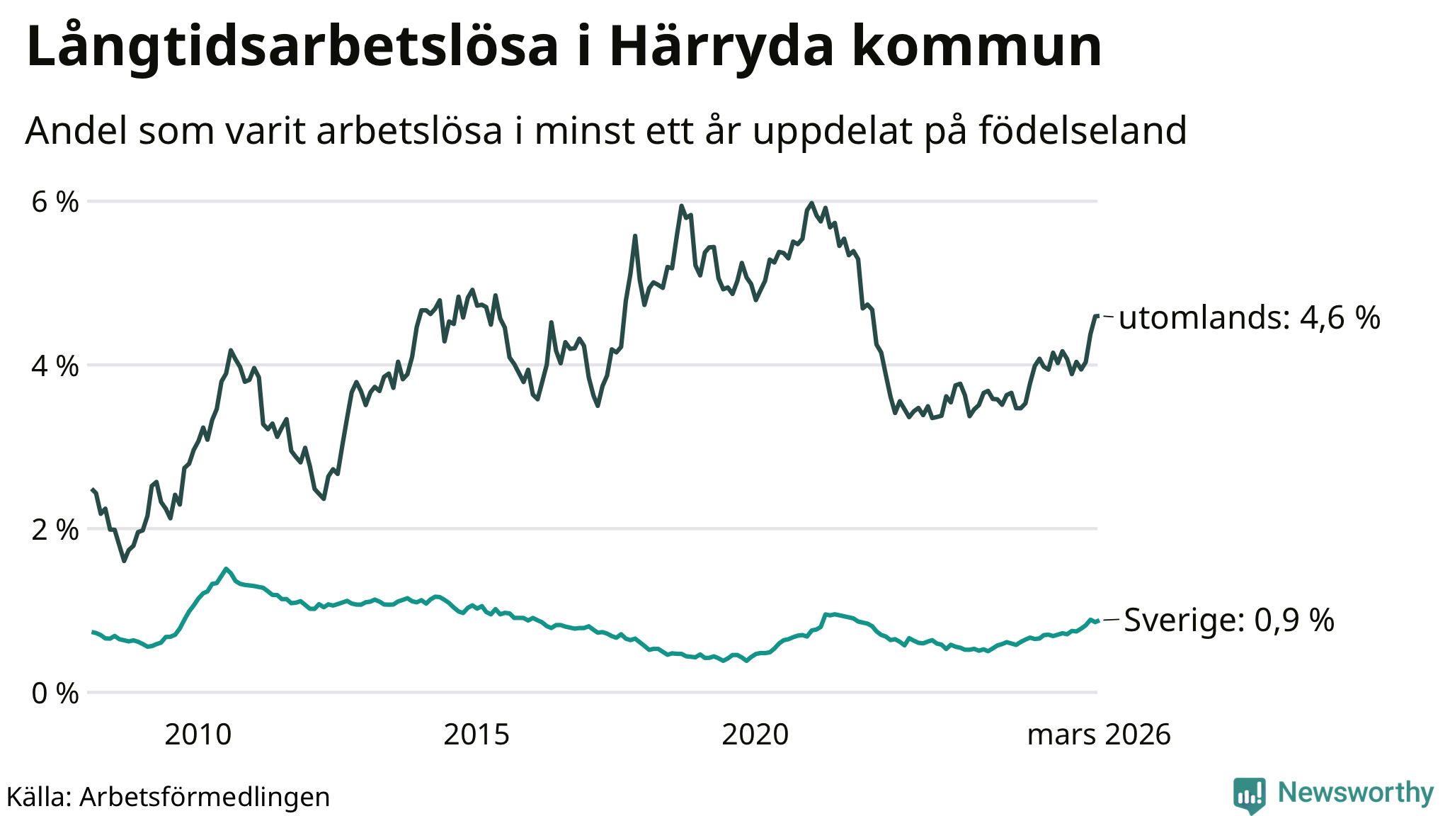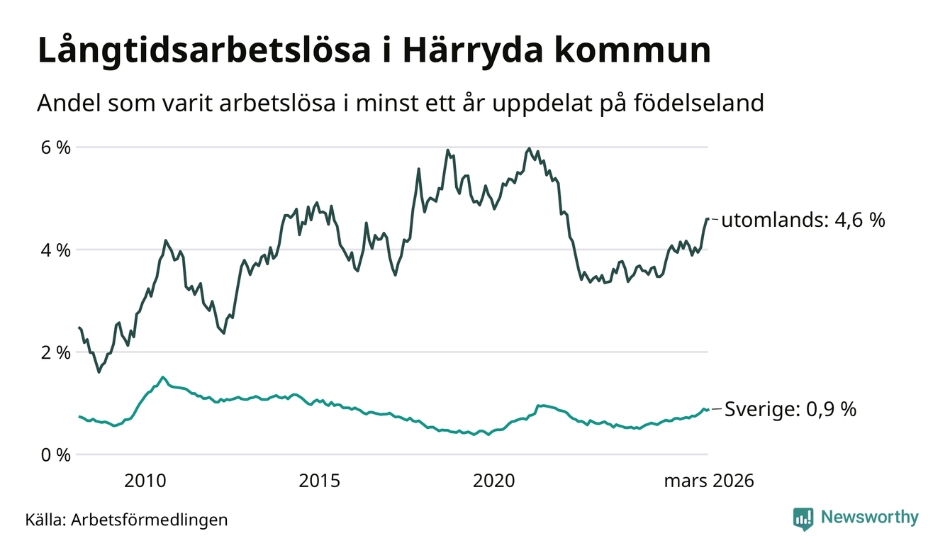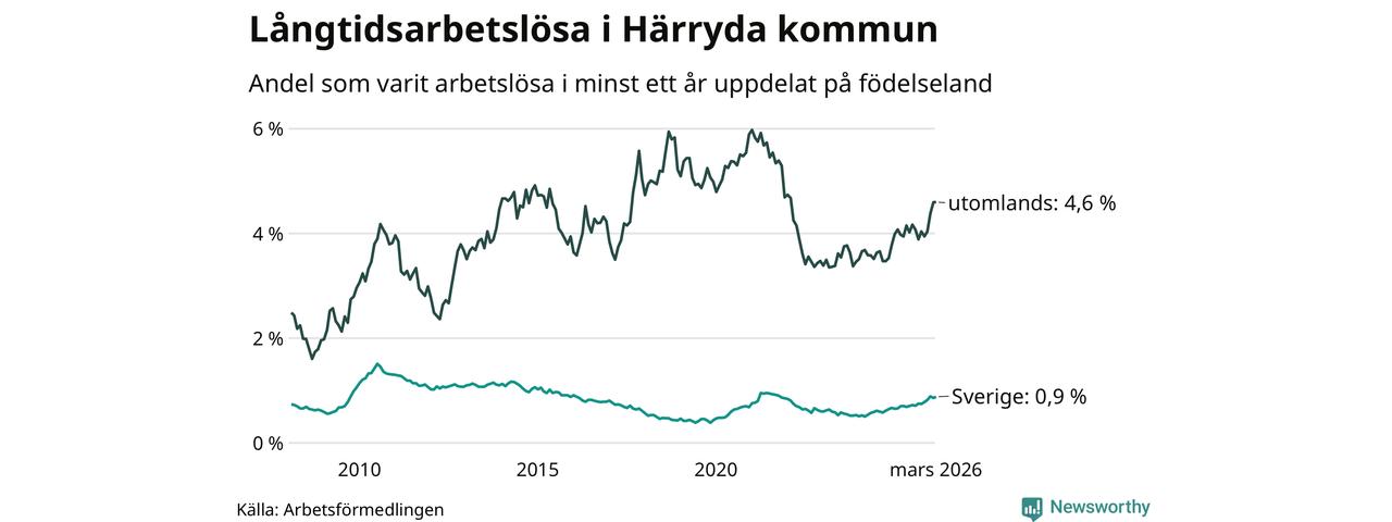 153 av de långtidsarbetslösa i Härryda är födda i Sverige, medan 152 är födda utomlands. Det innebär att långtidsarbetslösheten bland Sverigefödda är 0,9 procent, medan den är fem gånger så hög – 4,6 procent – bland födda utomlands. Även i riket som helhet är arbetslösheten högre bland utrikesfödda.