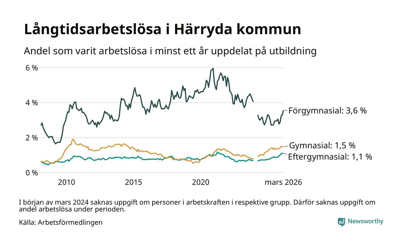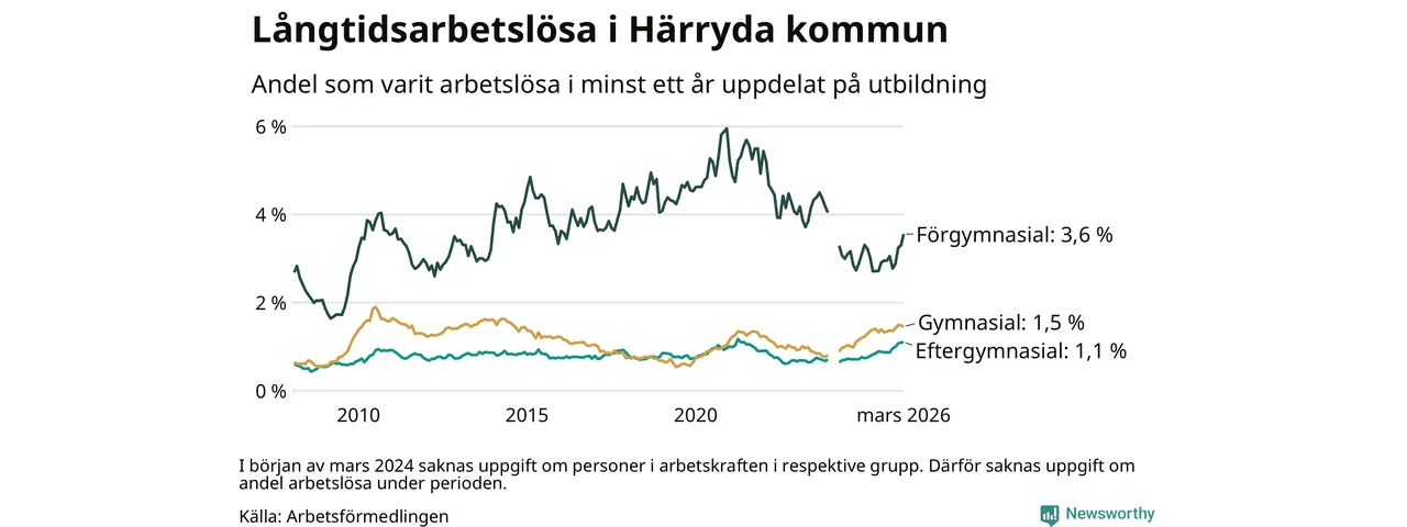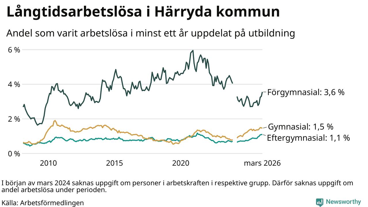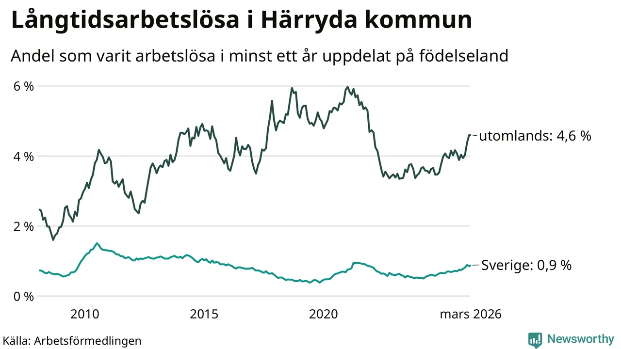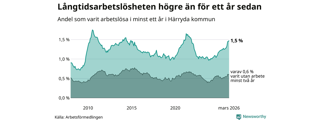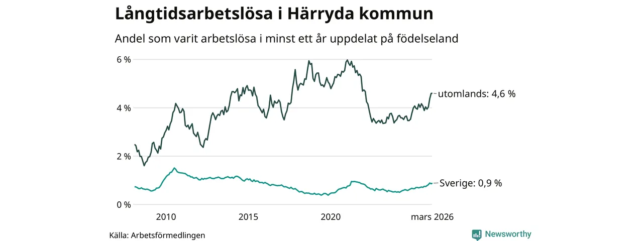 Inte sedan november 2021 har andelen långtidsarbetslösa varit så hög i Härryda. Det visar Arbetsförmedlingens senaste månadsstatistik.