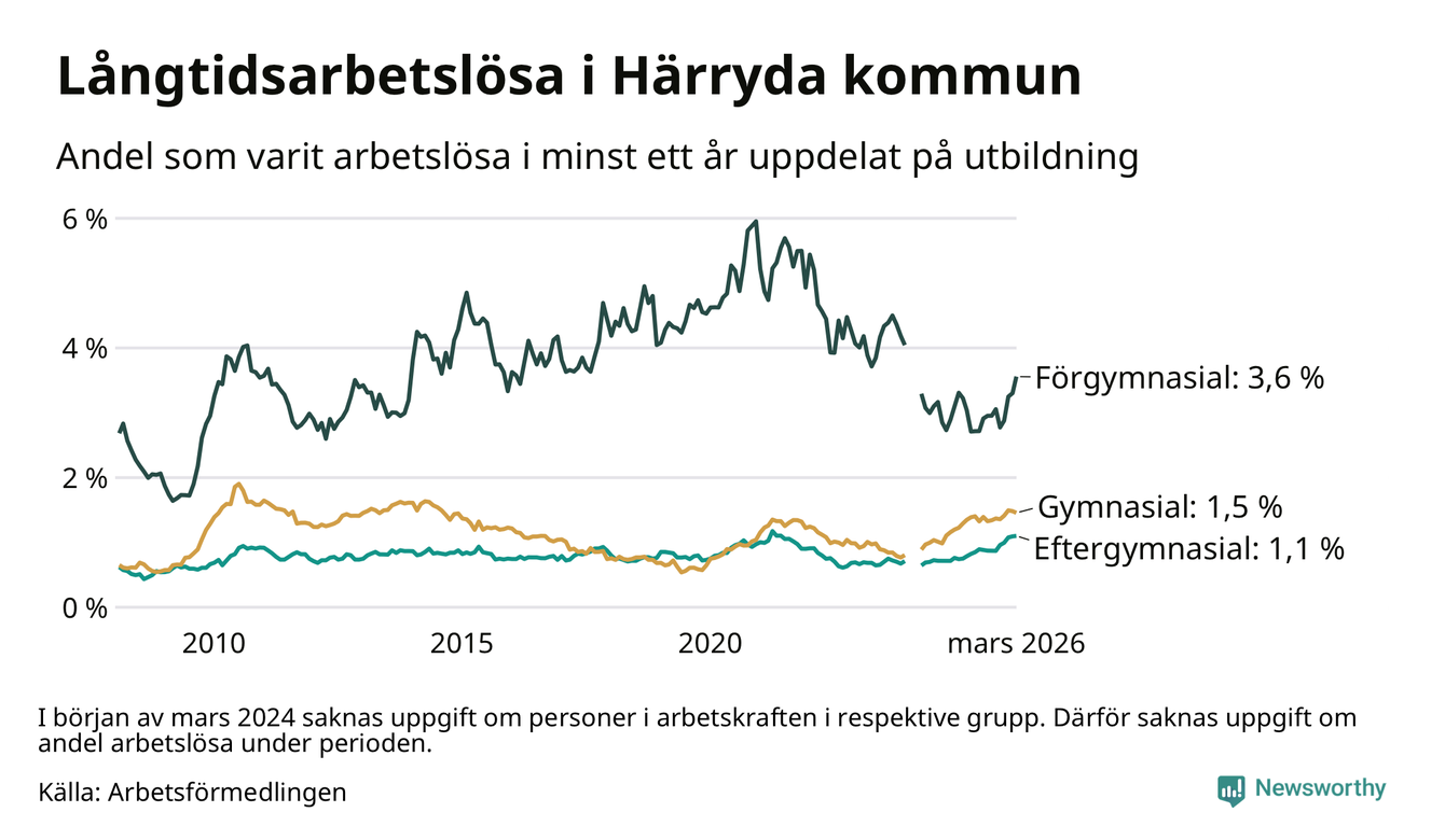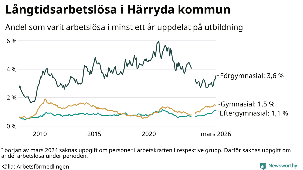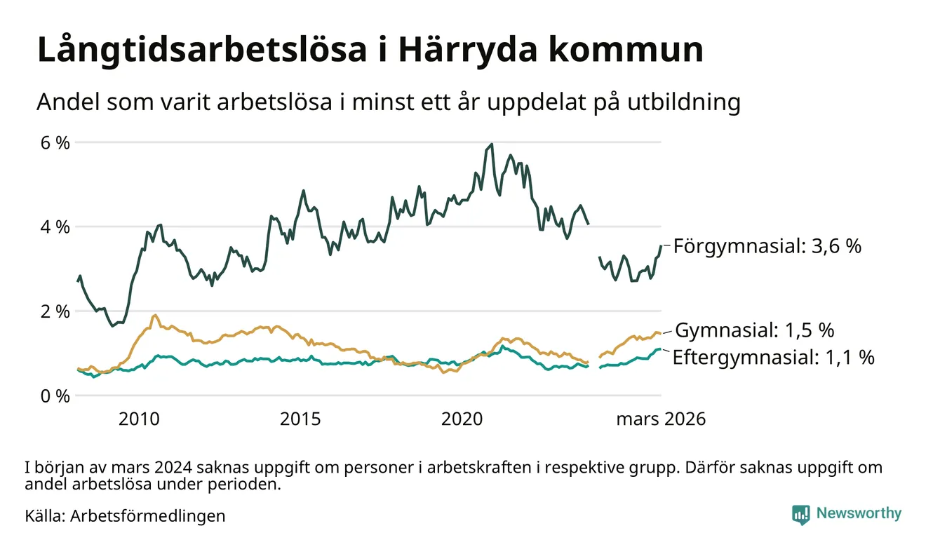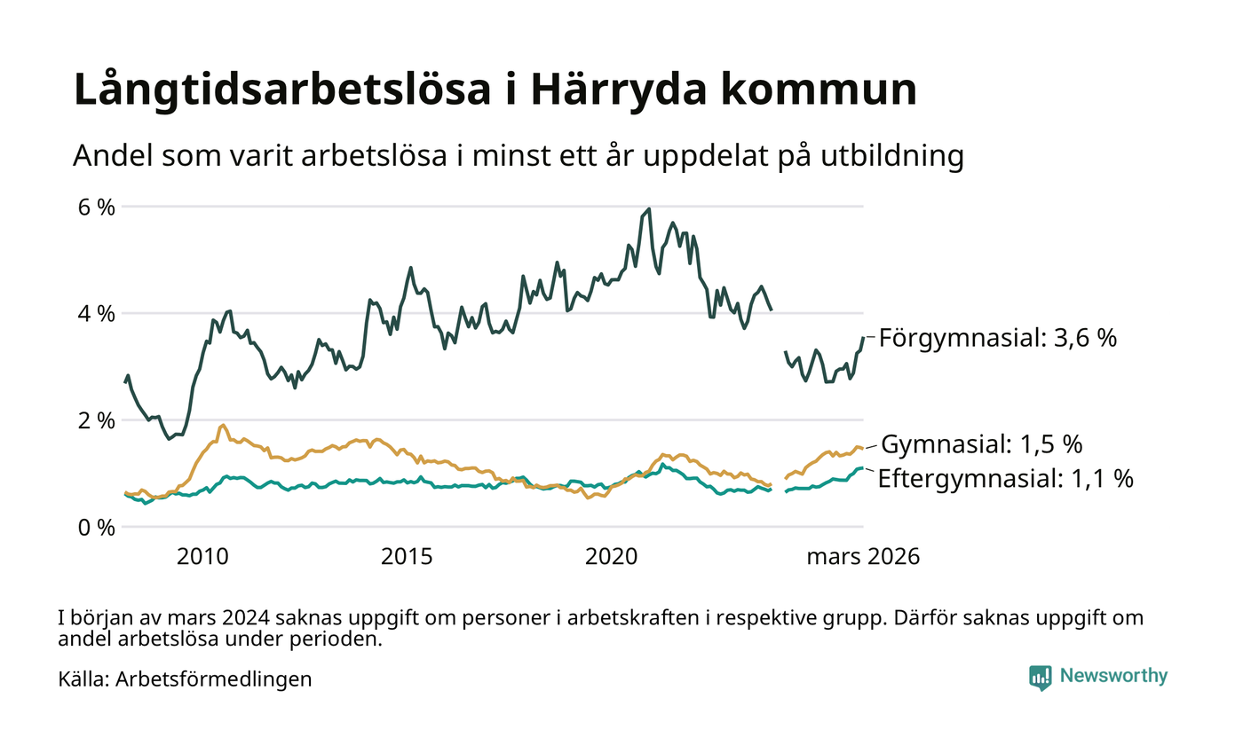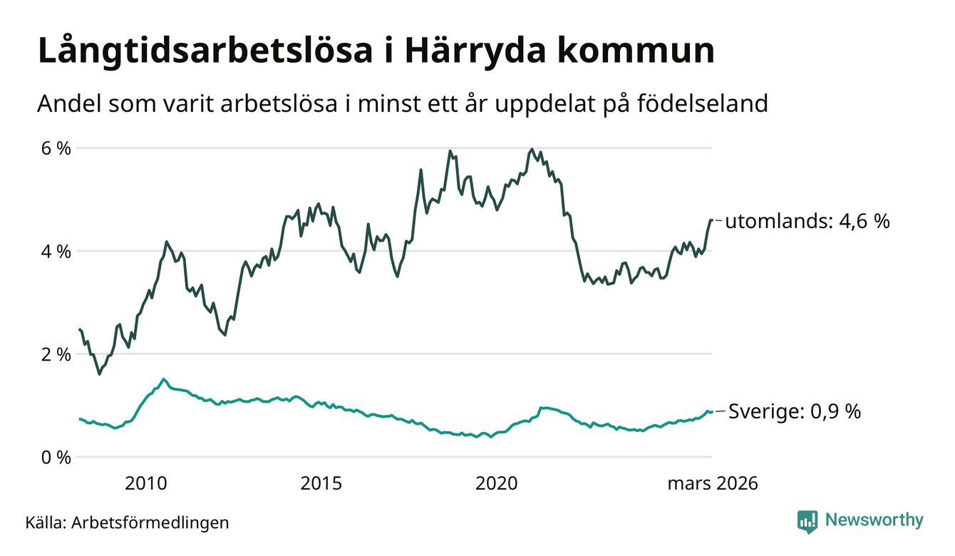 Inte sedan november 2021 har andelen långtidsarbetslösa varit så hög i Härryda. Det visar Arbetsförmedlingens senaste månadsstatistik.