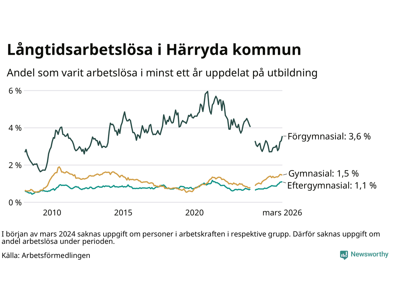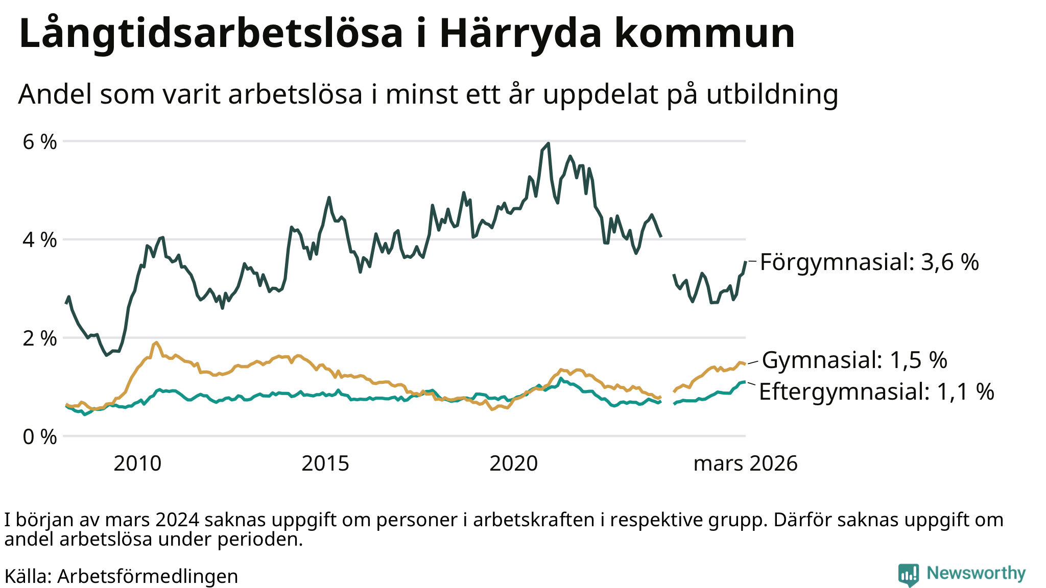| Andel arbetslösa i minst ett år | 1,5 % | 2,5 % | 2,9 % |