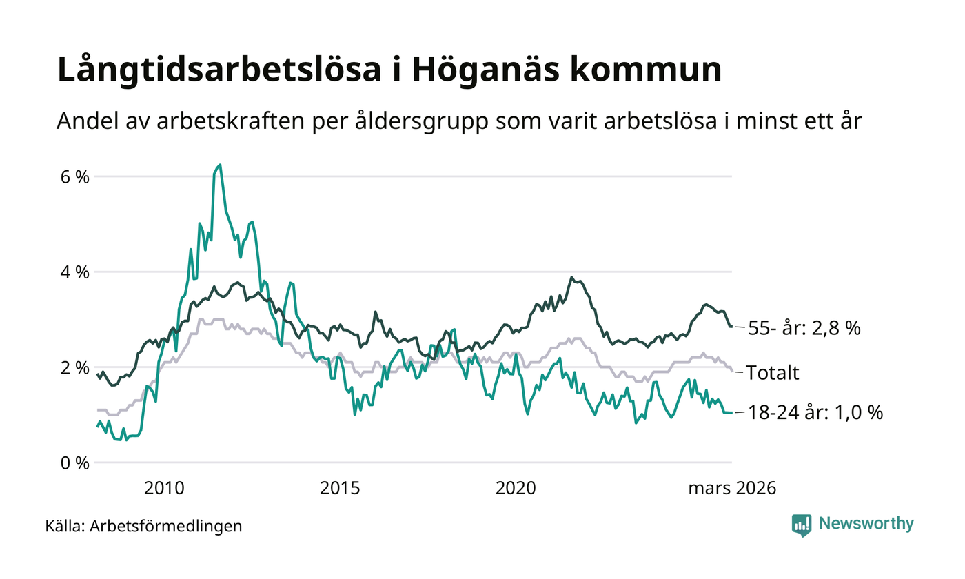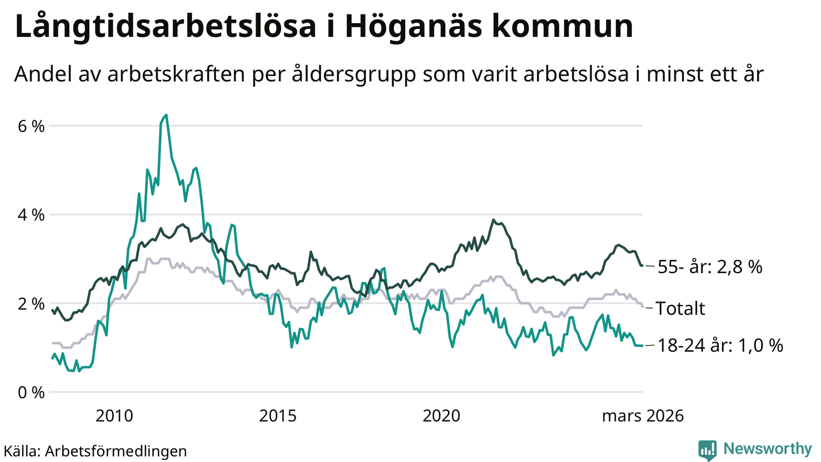 Av de 249 personerna som varit arbetslösa i mer än ett år i Höganäs kommun är 94 personer mellan 55 och 661 år och tolv är mellan 18 och 24 år. För den äldre gruppen är andelen arbetslösa 2,8 procent medan den i den yngre gruppen är 1,0 procent. Även i riket som helhet är långtidsarbetslösheten högre i gruppen äldre.
