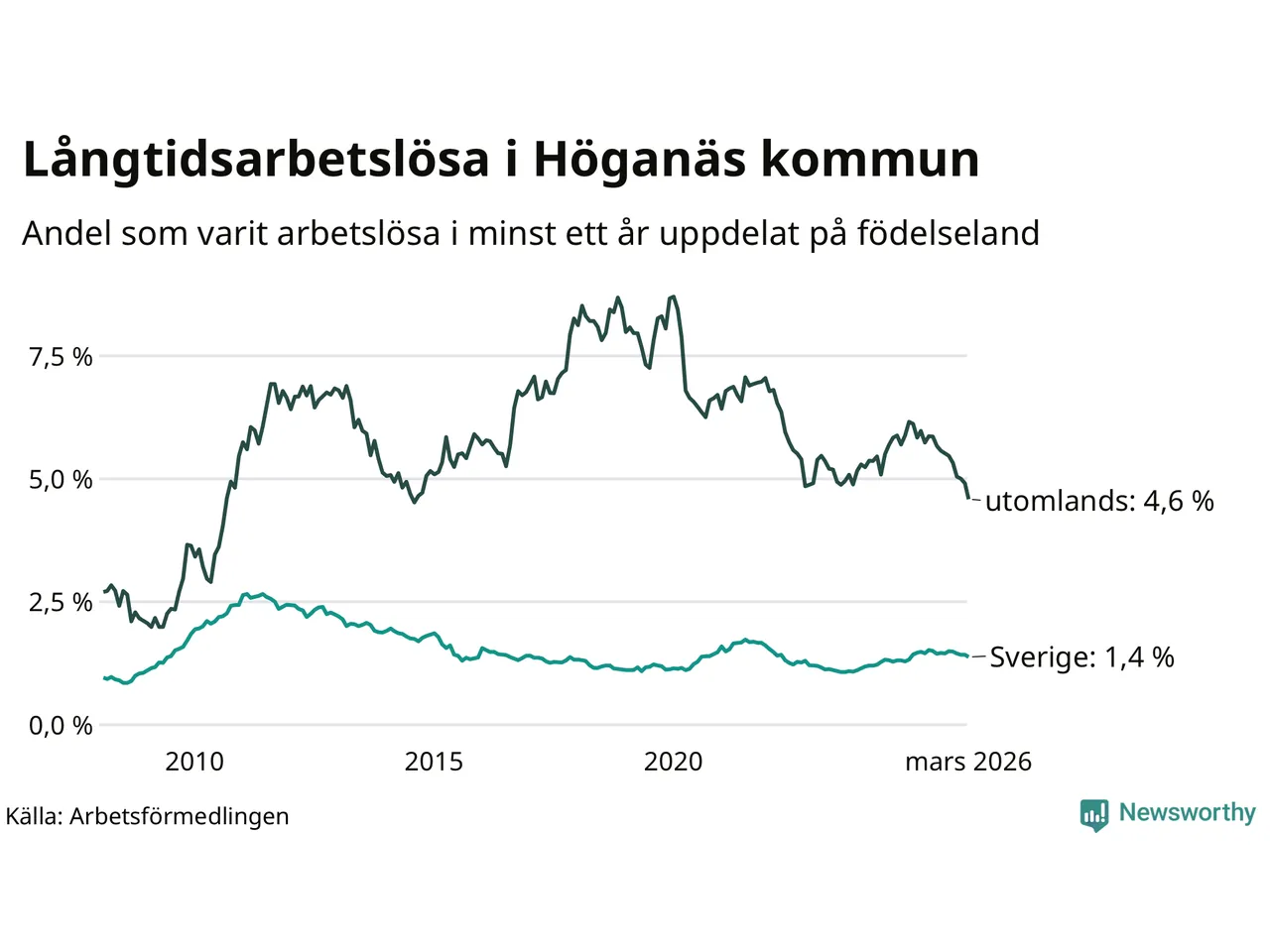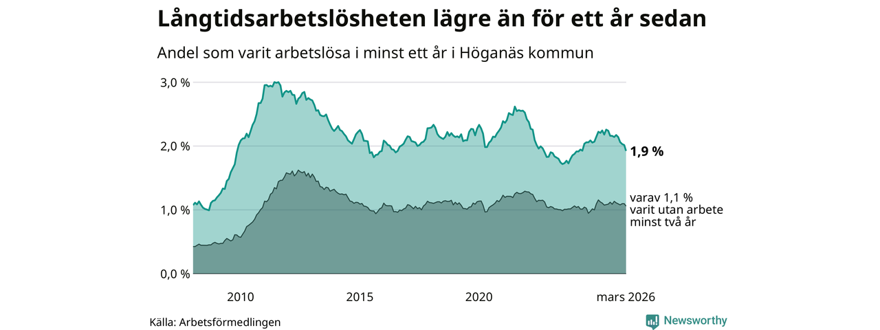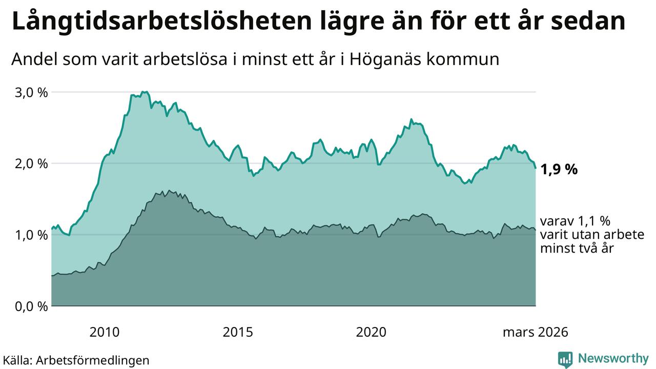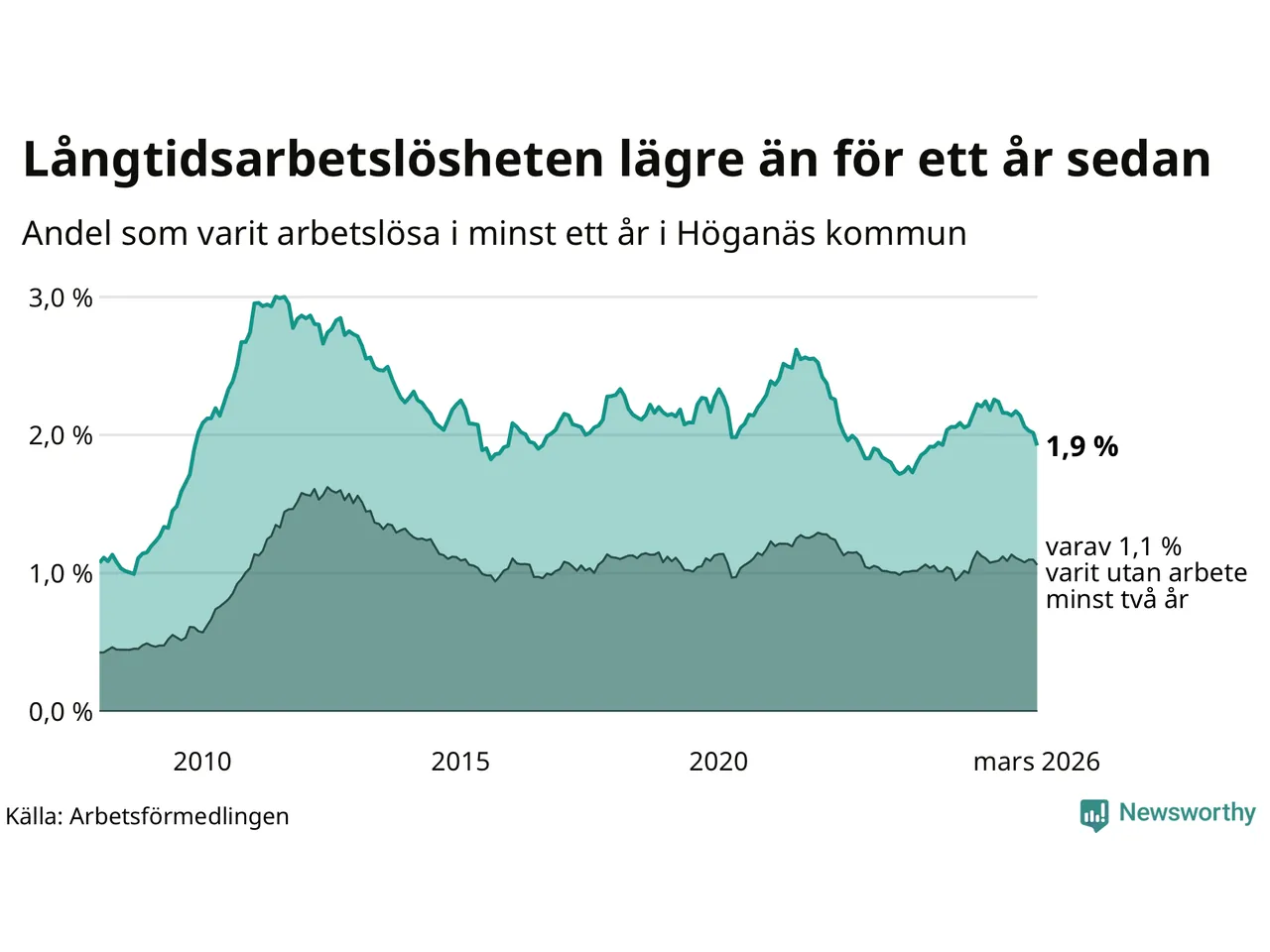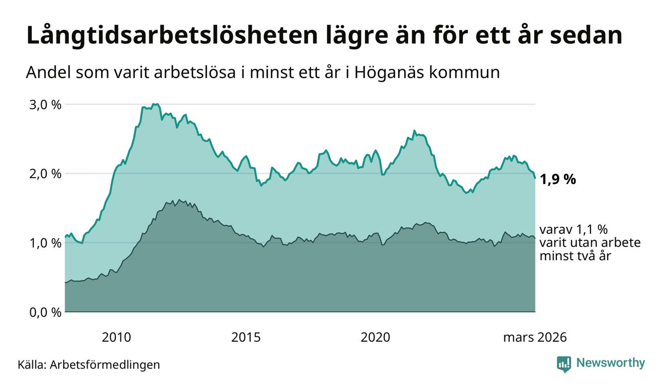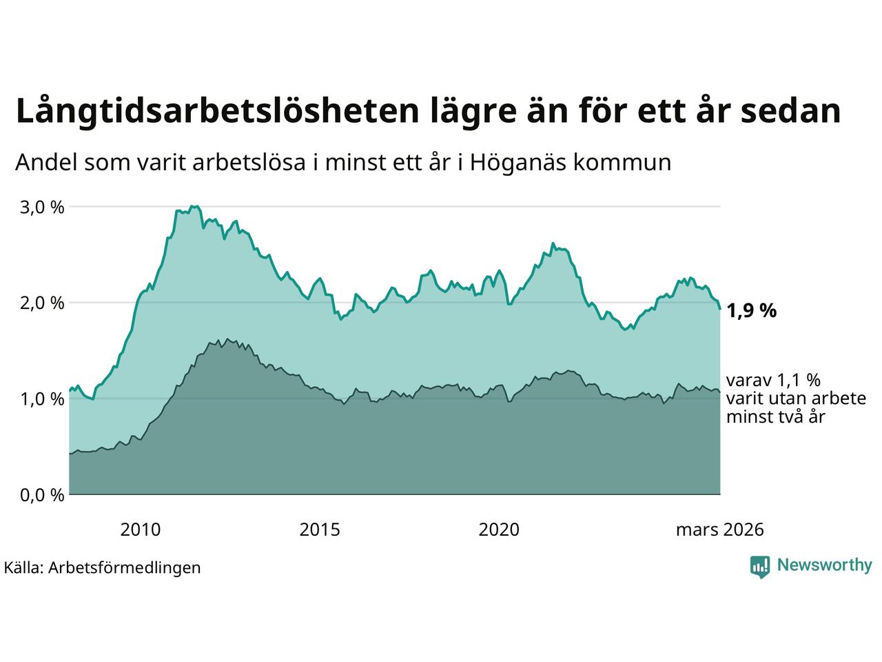 I mars hade 249 Höganäsbor varit arbetslösa i minst ett år, vilket är tolv färre än månaden innan. Det är den femte månaden i rad med minskande antal långtidsarbetslösa. 249 personer motsvarar 1,9 procent av arbetskraften i kommunen – andelen långtidsarbetslösa är 0,3 procentenheter lägre än samma månad för ett år sedan.