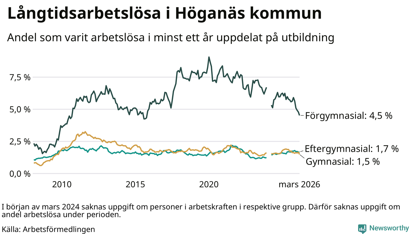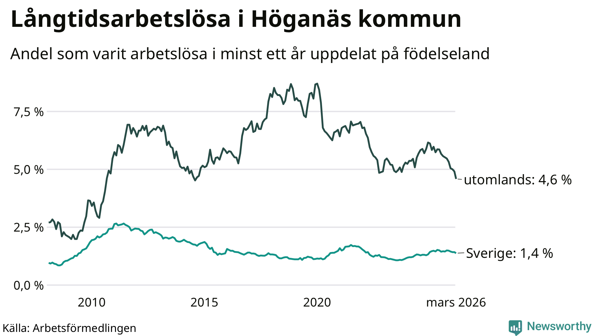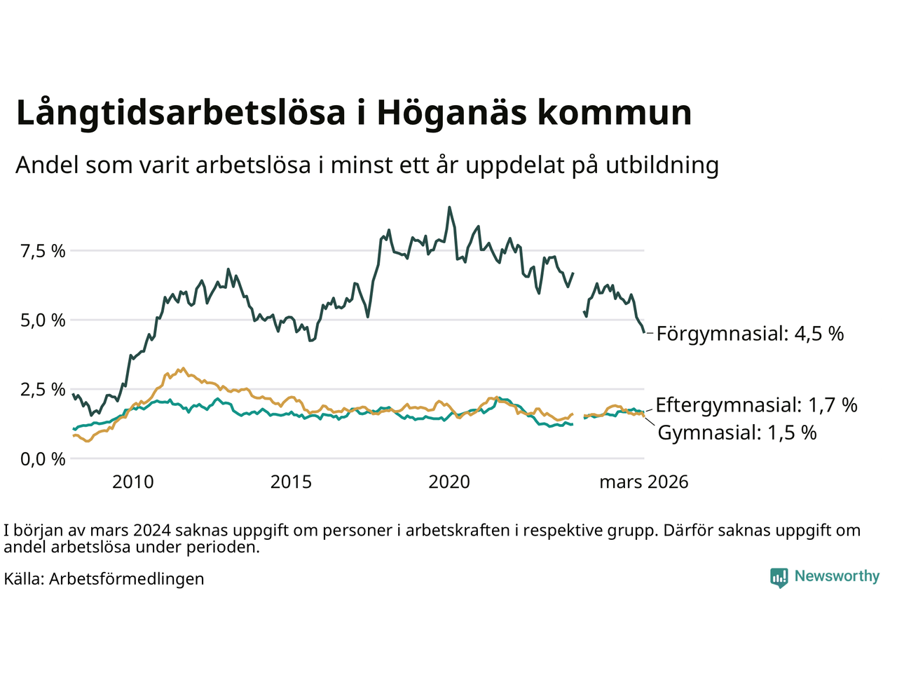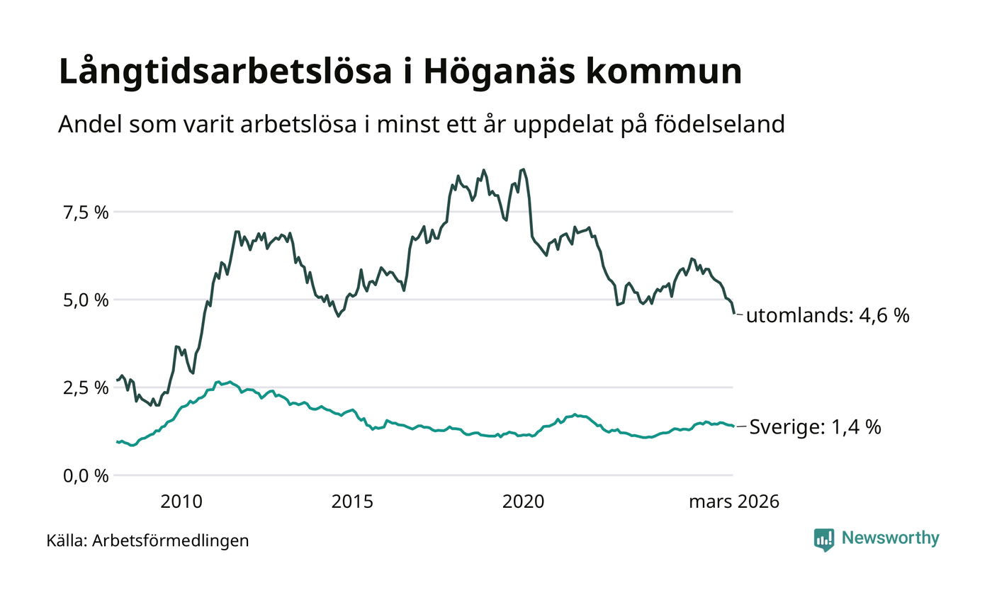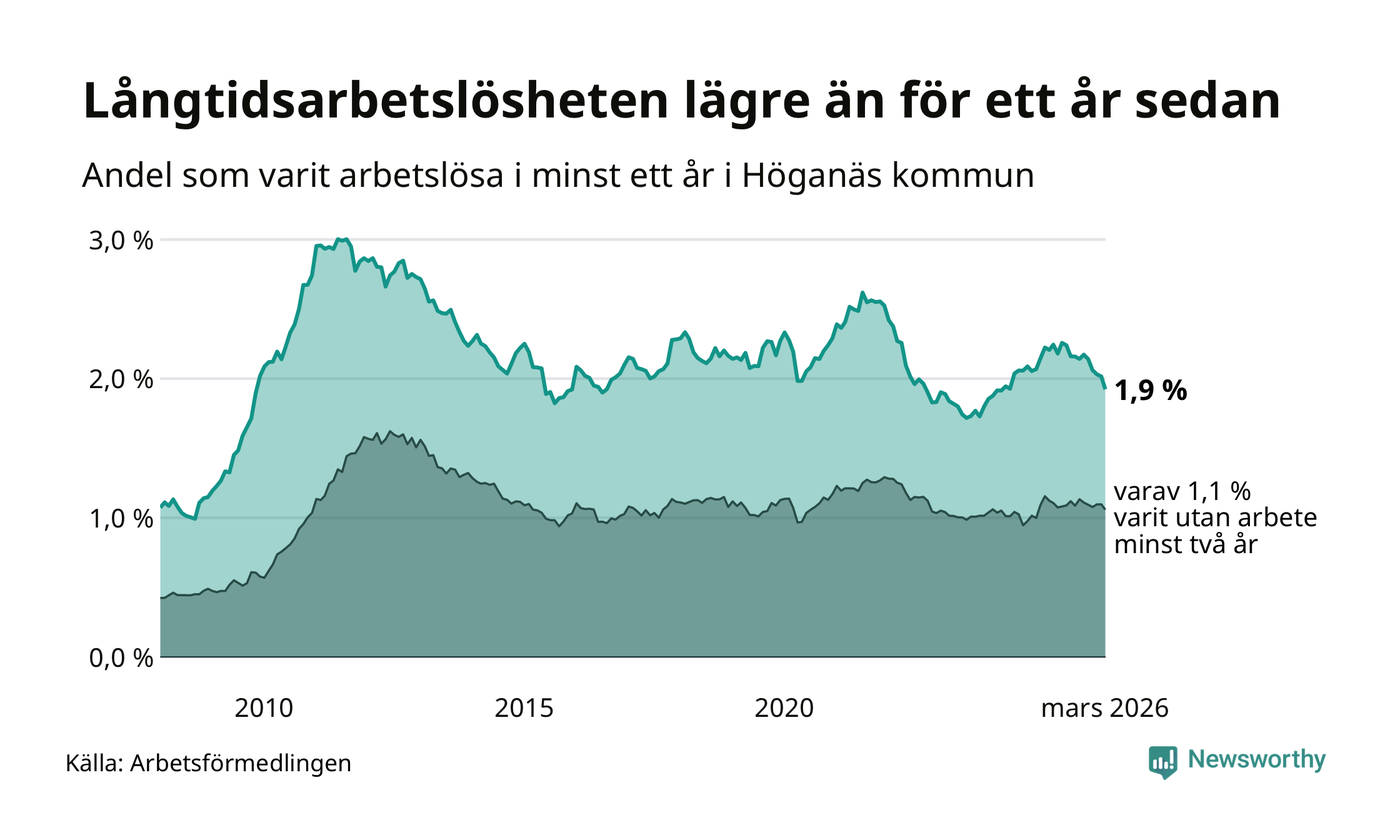 I mars hade 249 Höganäsbor varit arbetslösa i minst ett år, vilket är tolv färre än månaden innan. Det är den femte månaden i rad med minskande antal långtidsarbetslösa. 249 personer motsvarar 1,9 procent av arbetskraften i kommunen – andelen långtidsarbetslösa är 0,3 procentenheter lägre än samma månad för ett år sedan.
