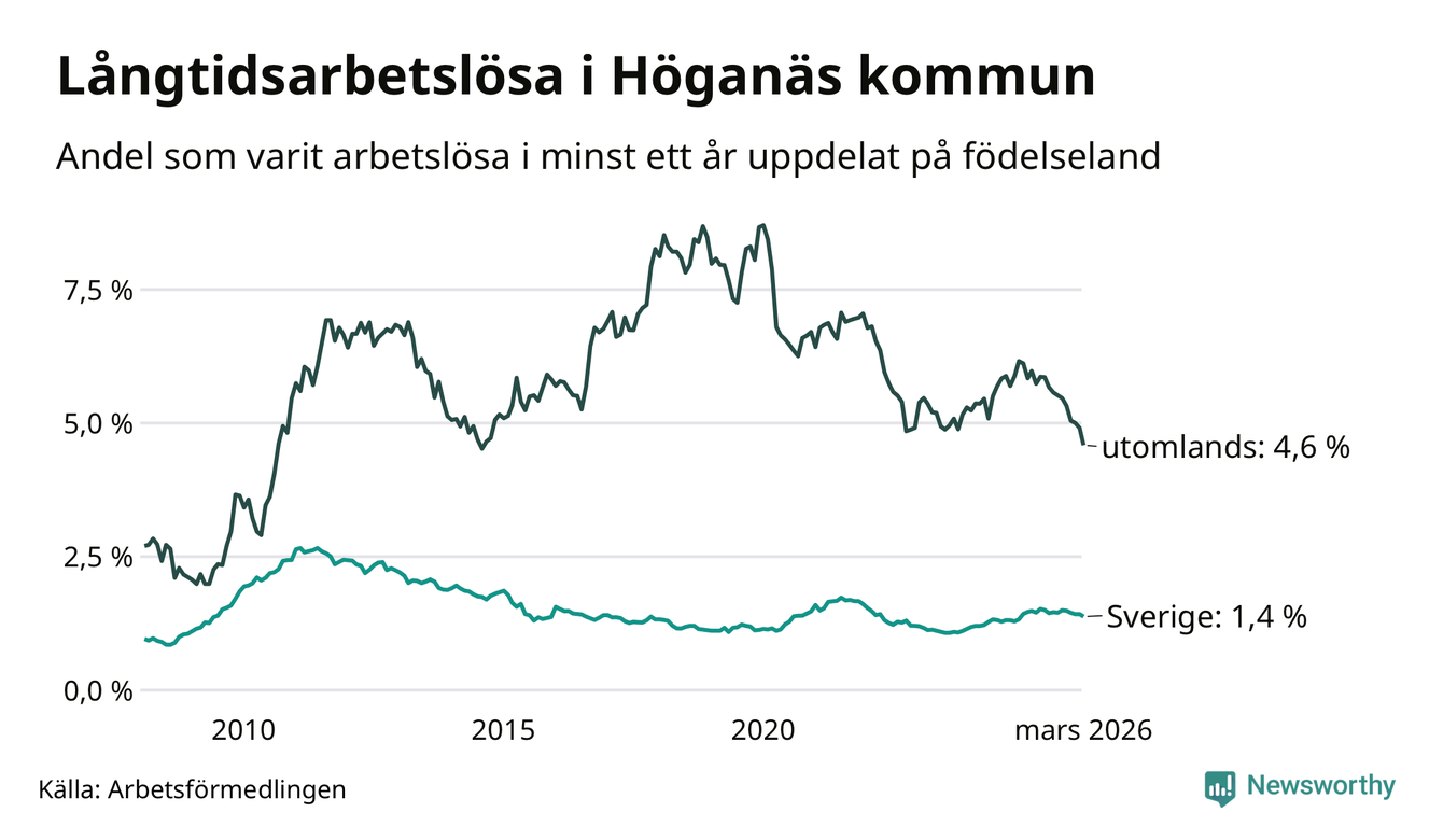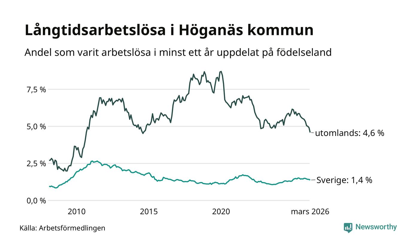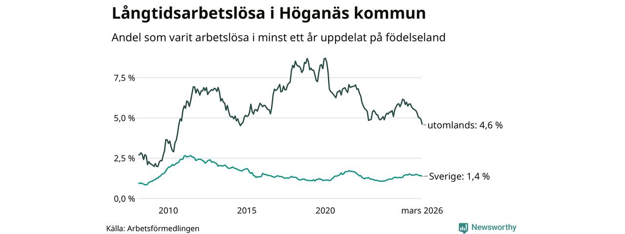 148 av de långtidsarbetslösa i Höganäs är födda i Sverige, medan 101 är födda utomlands. Det innebär att långtidsarbetslösheten bland Sverigefödda är 1,4 procent, medan den är tre gånger så hög – 4,6 procent – bland födda utomlands. Även i riket som helhet är arbetslösheten högre bland utrikesfödda.