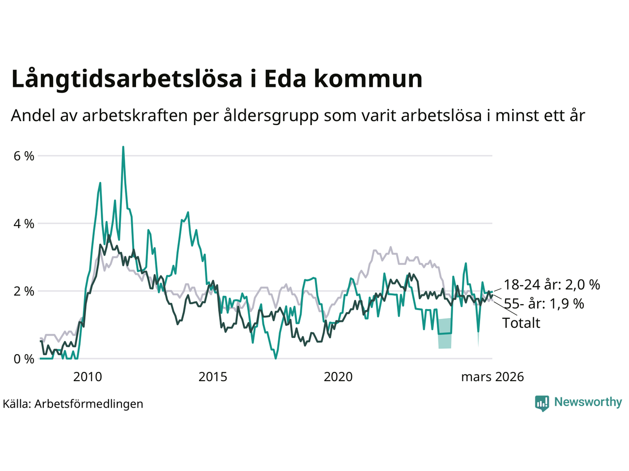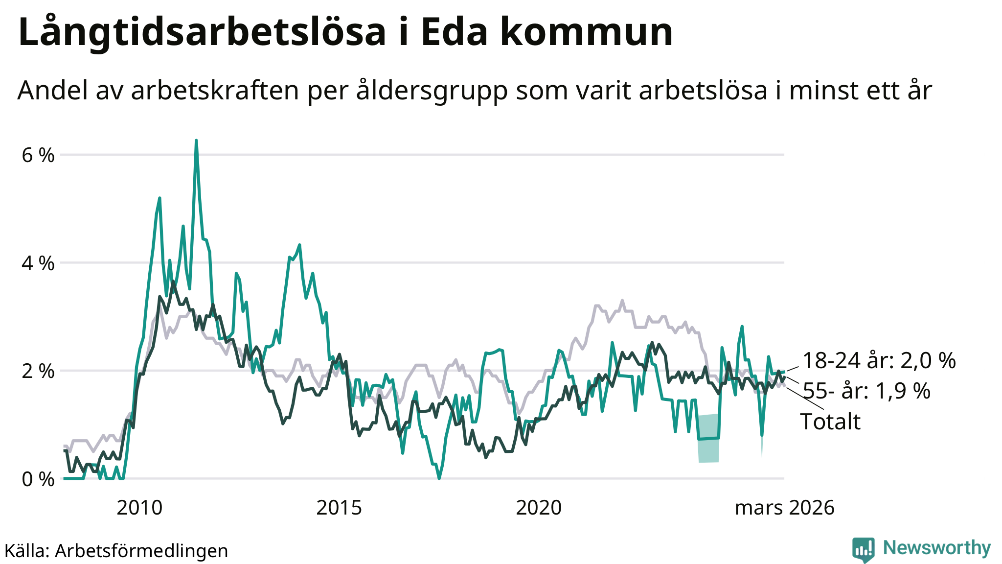 | Andel arbetslösa i minst två år | 0,6 % | 1,3 % | 1,6 % |