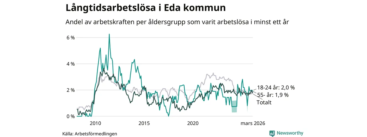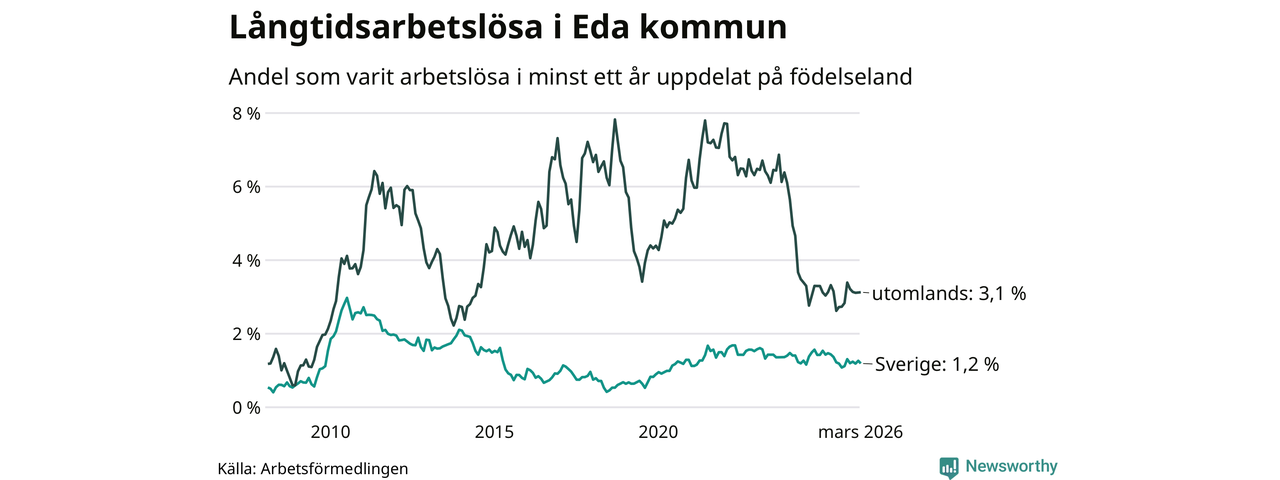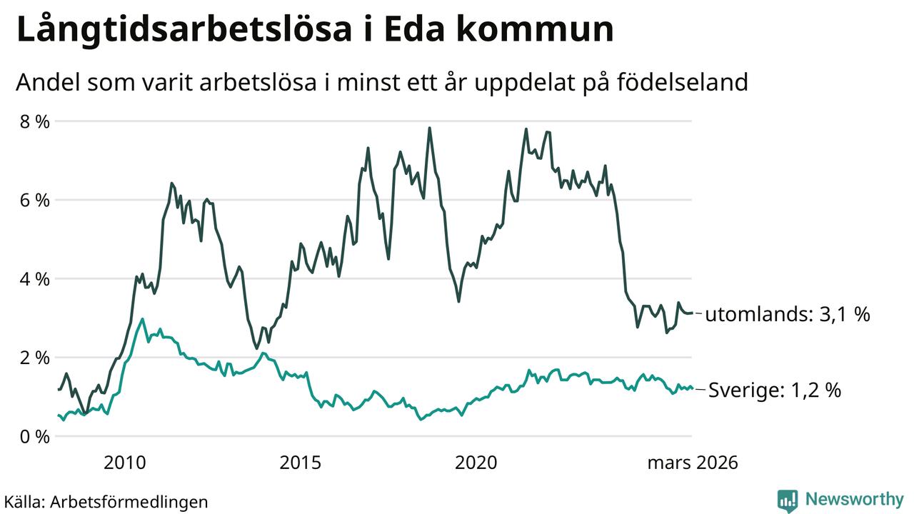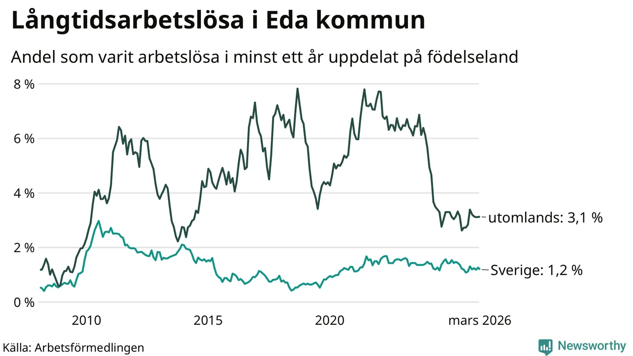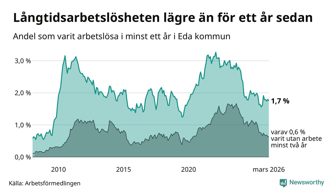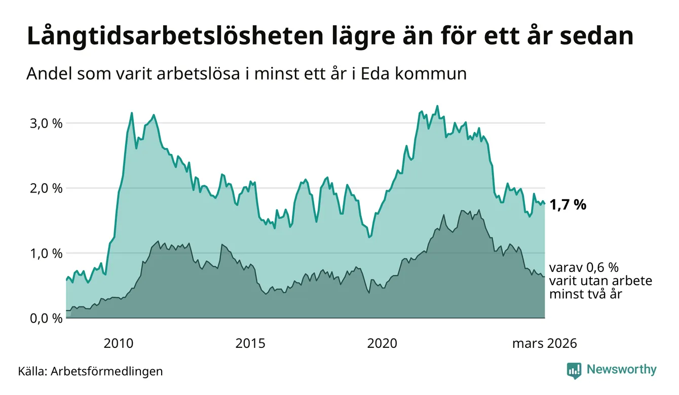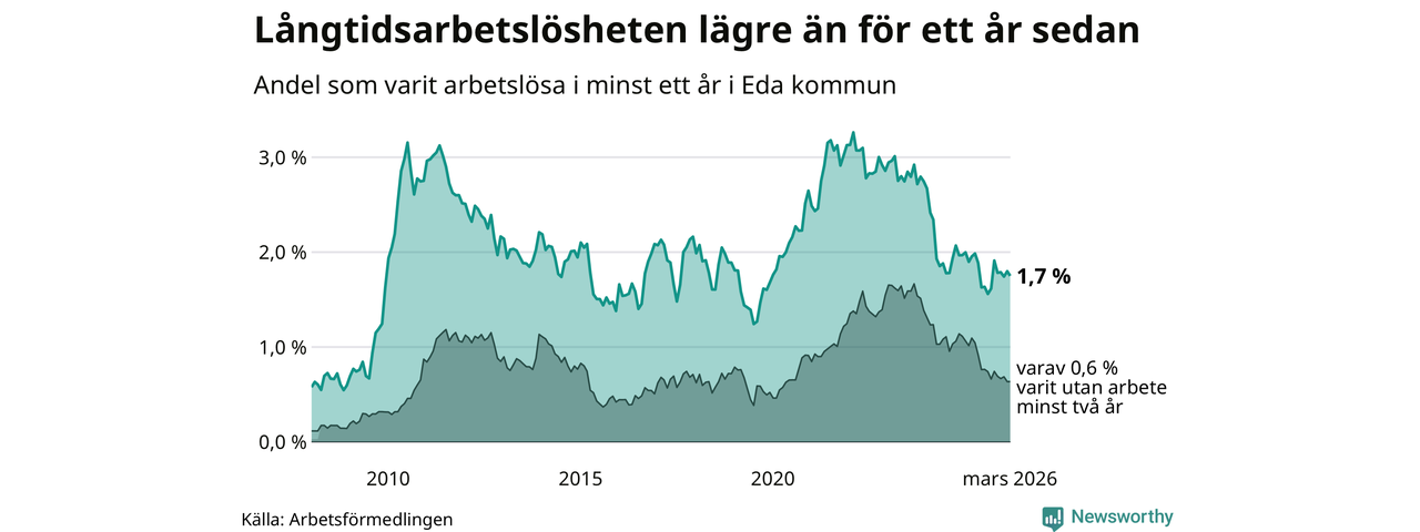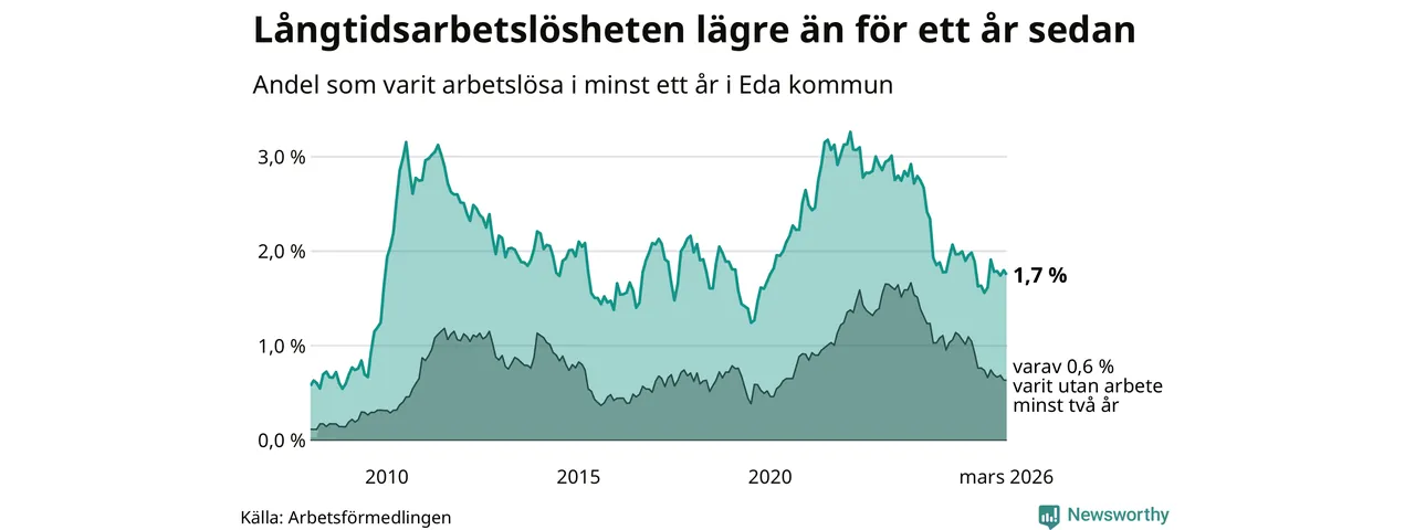 Andelen som varit utan arbete i minst ett år i Eda var lägre i mars jämfört med samma månad för ett år sedan. Det visar Arbetsfömedlingens senaste månadsstatistik.