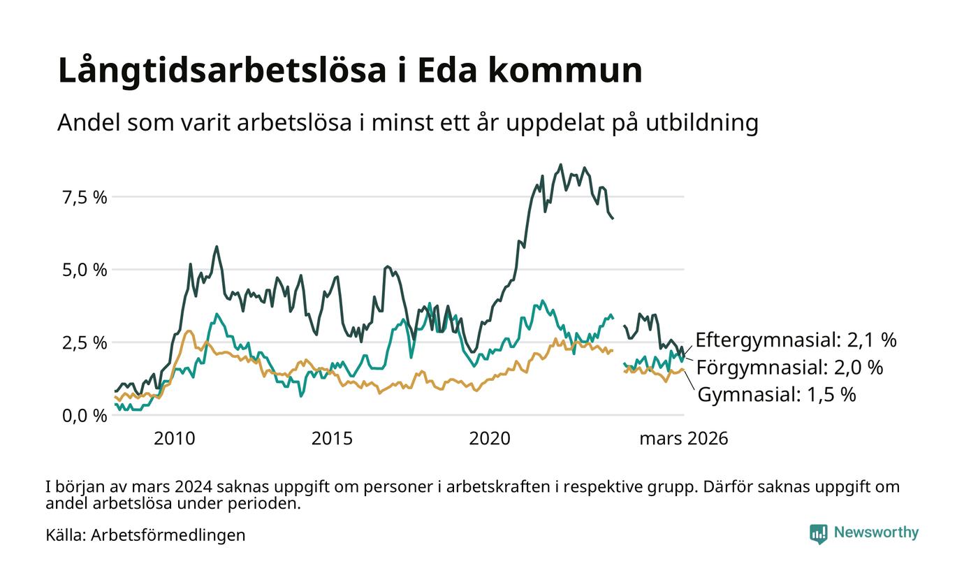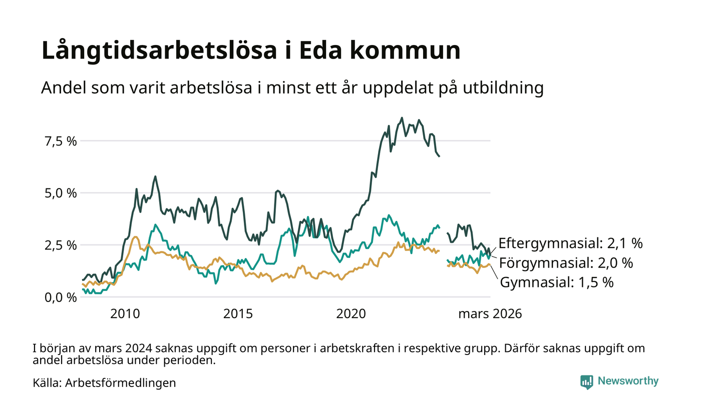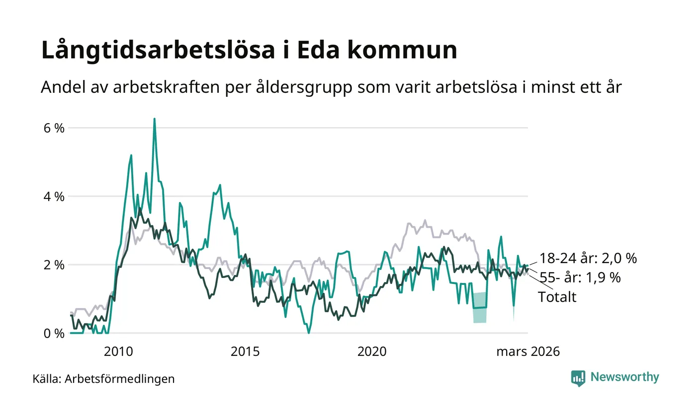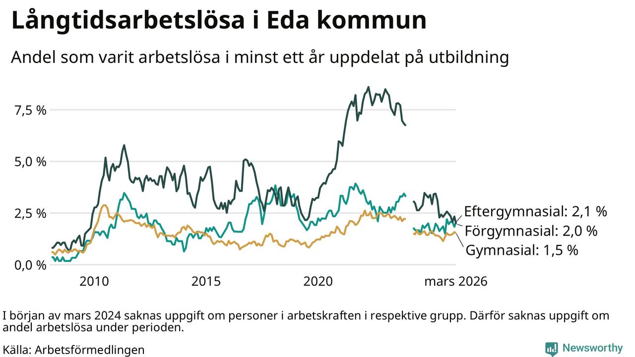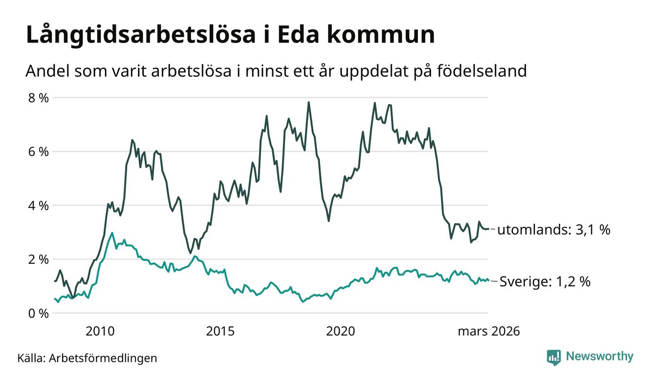 Andelen som varit utan arbete i minst ett år i Eda var lägre i mars jämfört med samma månad för ett år sedan. Det visar Arbetsfömedlingens senaste månadsstatistik.