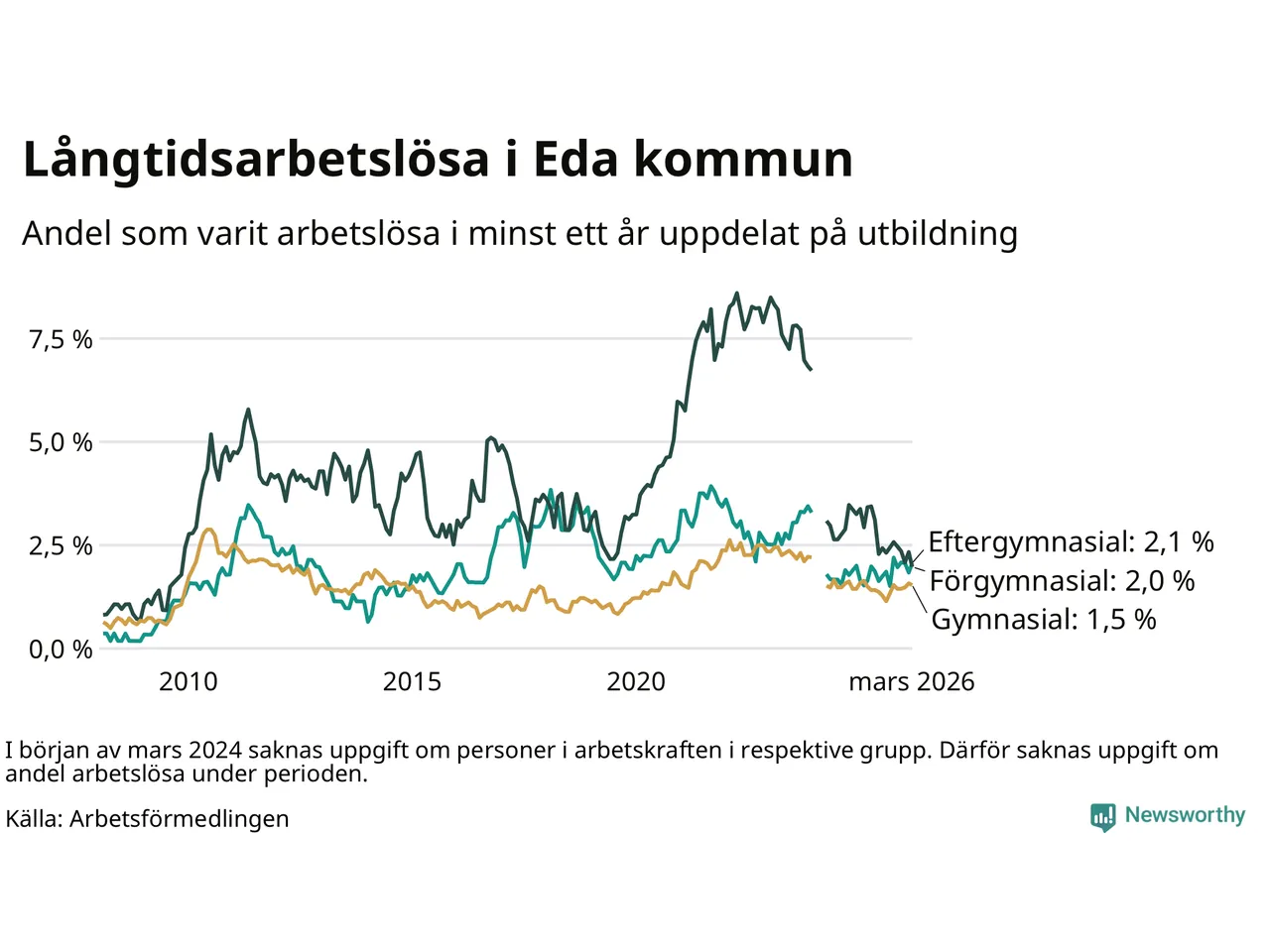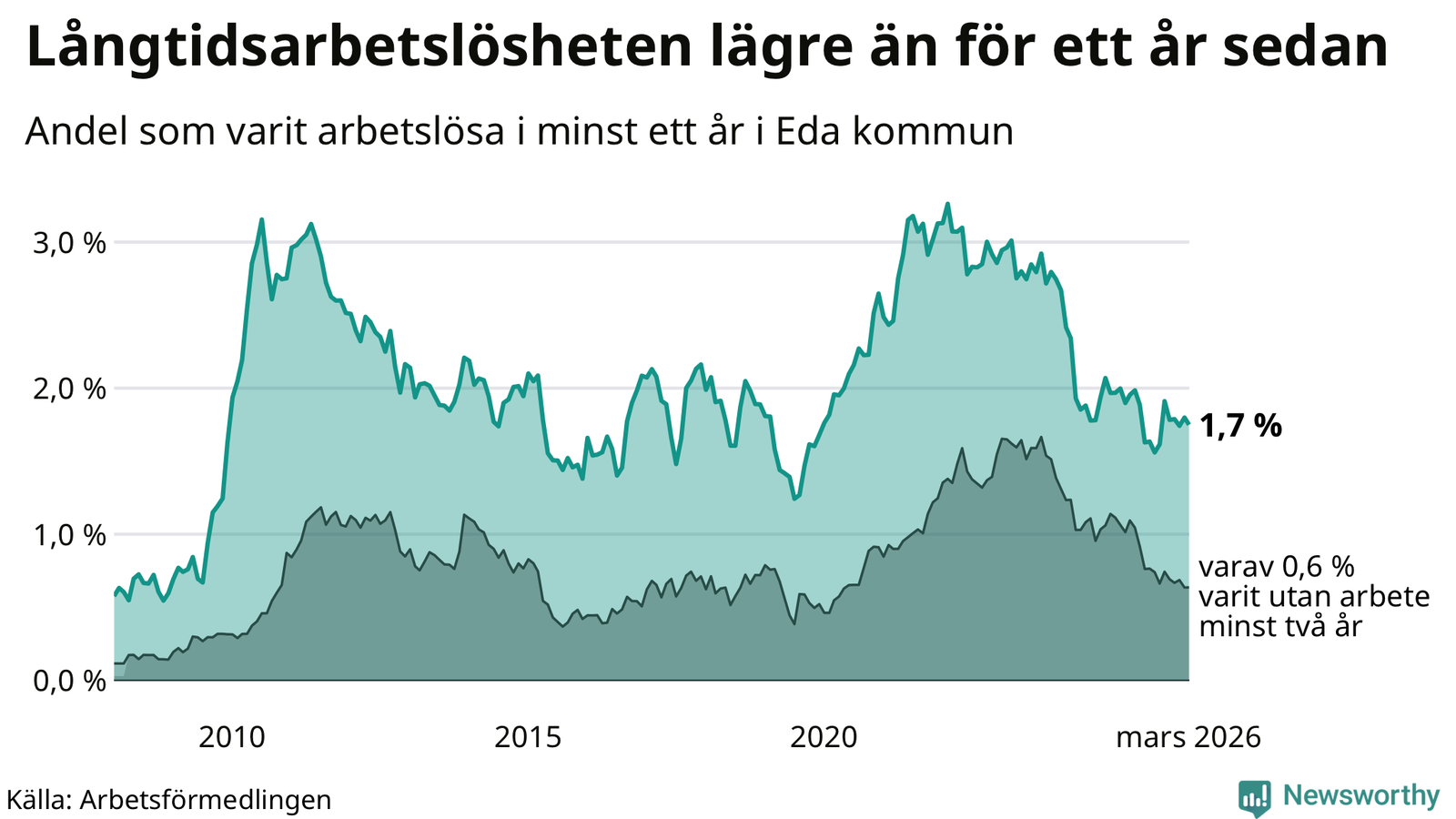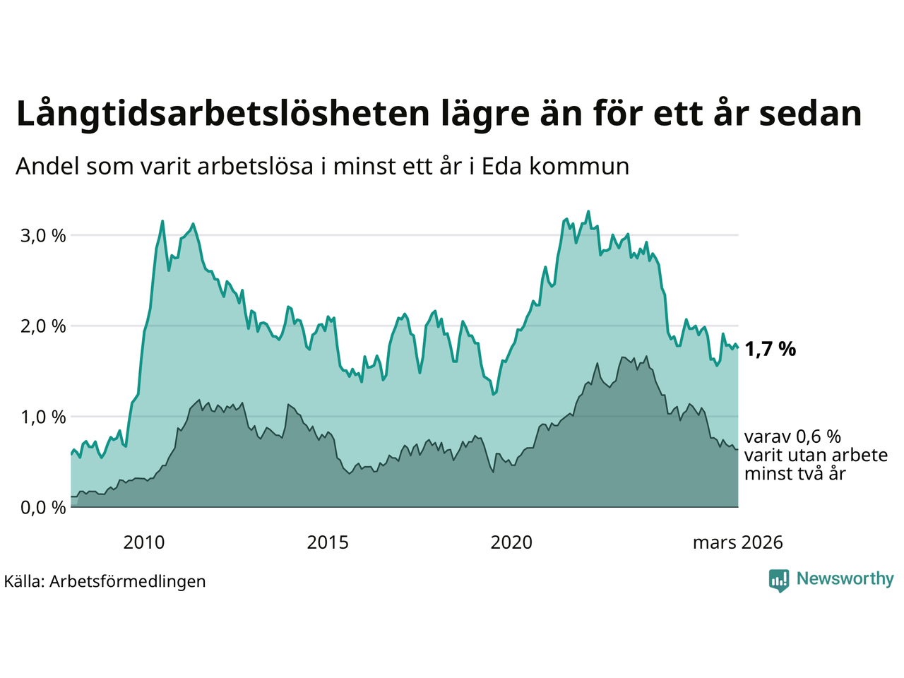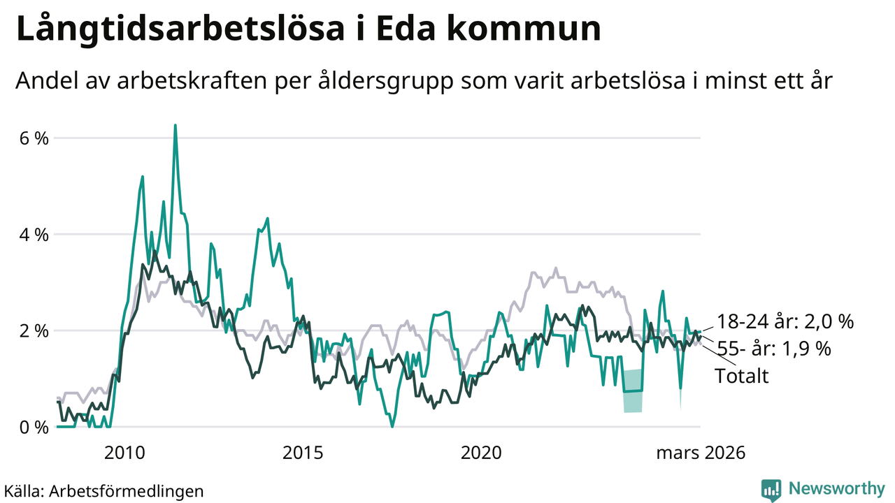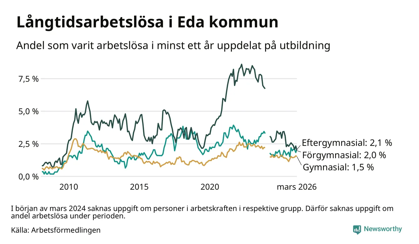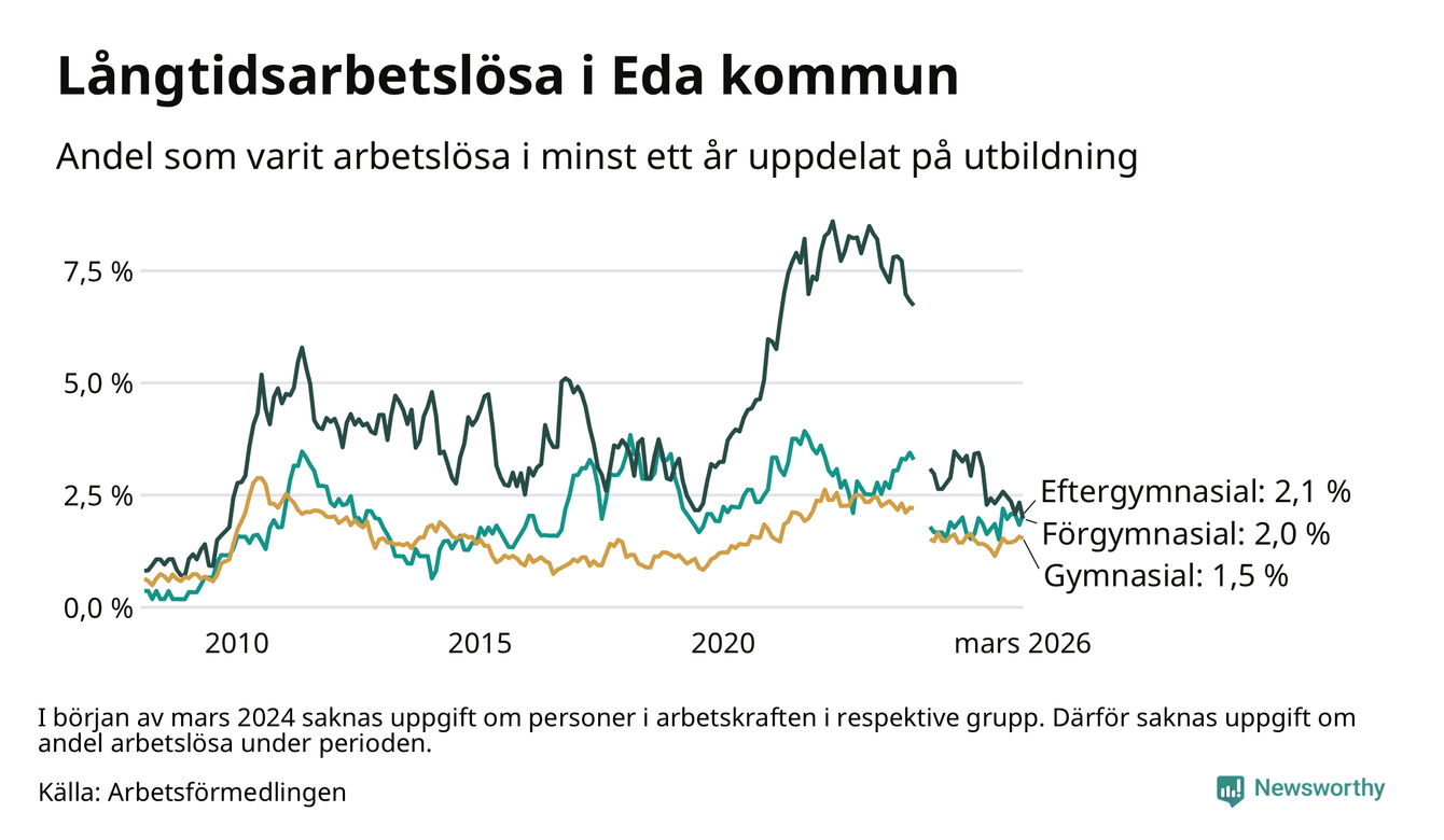 Andelen som varit utan arbete i minst ett år i Eda var lägre i mars jämfört med samma månad för ett år sedan. Det visar Arbetsfömedlingens senaste månadsstatistik.