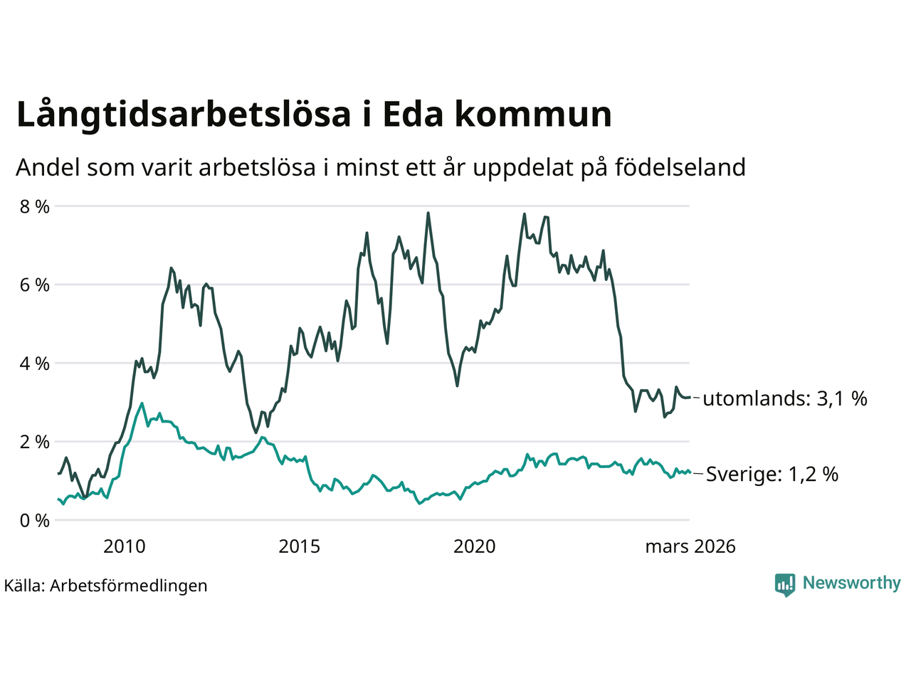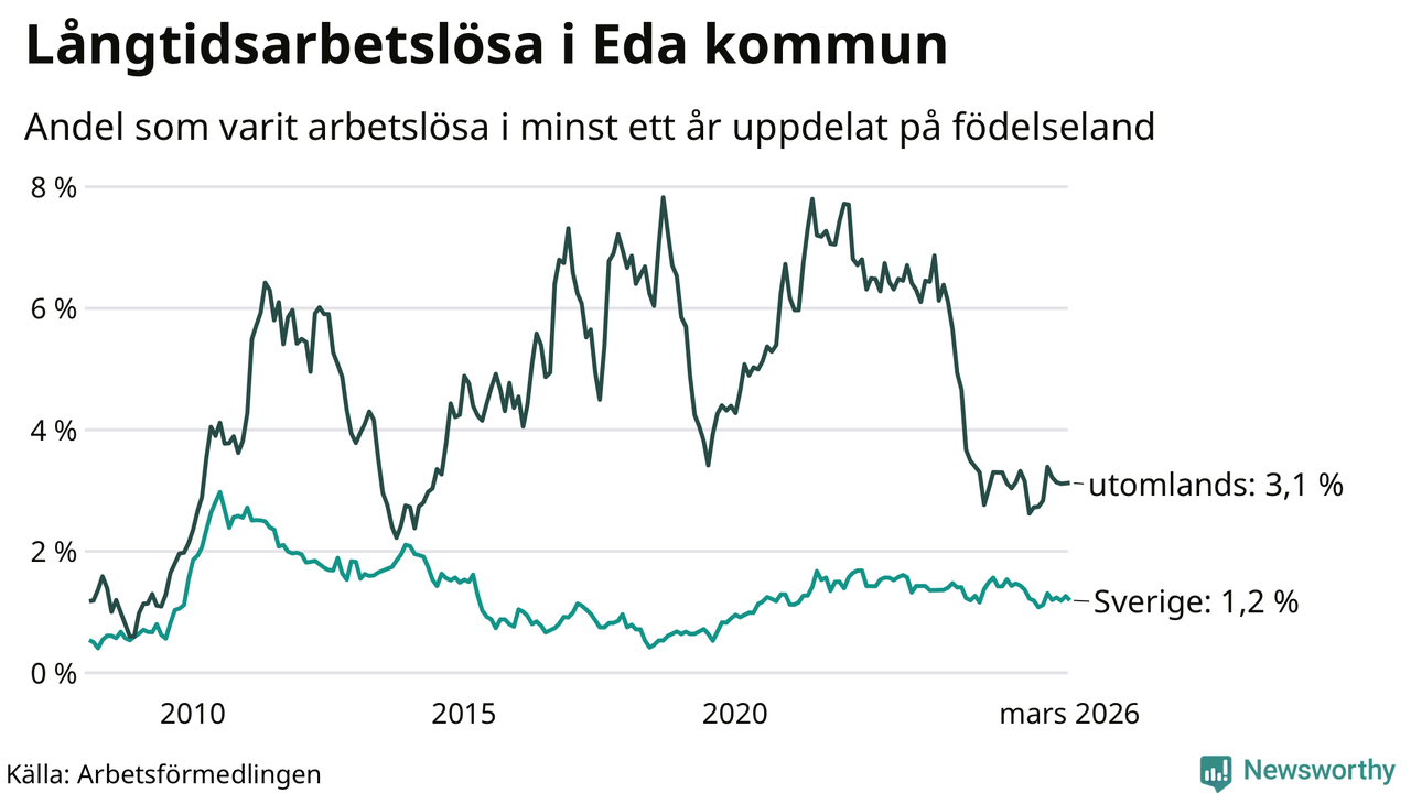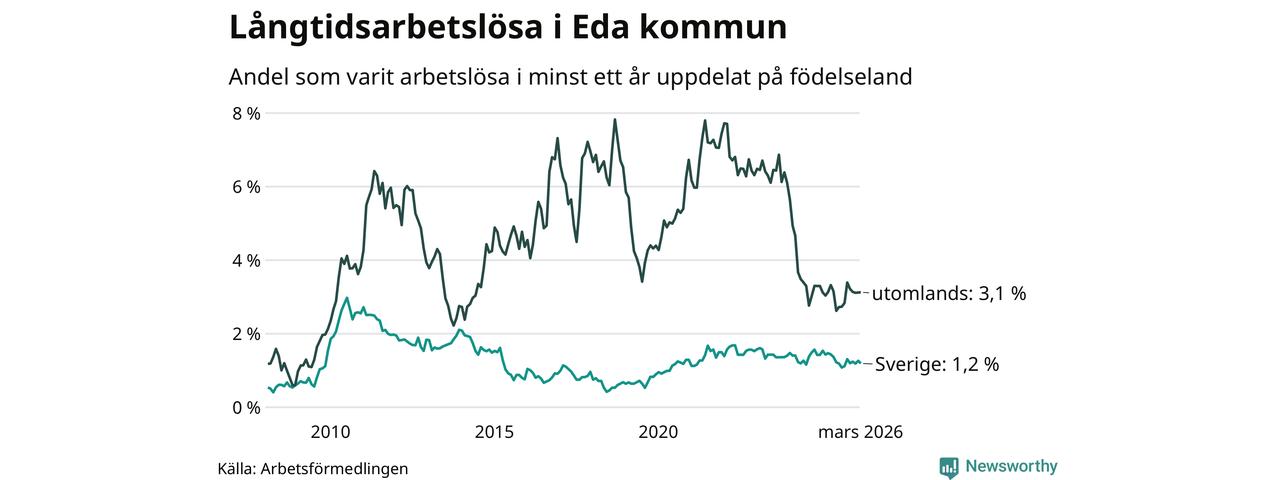 32 av de långtidsarbetslösa i Eda är födda i Sverige, medan 34 är födda utomlands. Det innebär att långtidsarbetslösheten bland Sverigefödda är 1,2 procent, medan den är tre gånger så hög – 3,1 procent – bland födda utomlands. Även i riket som helhet är arbetslösheten högre bland utrikesfödda.