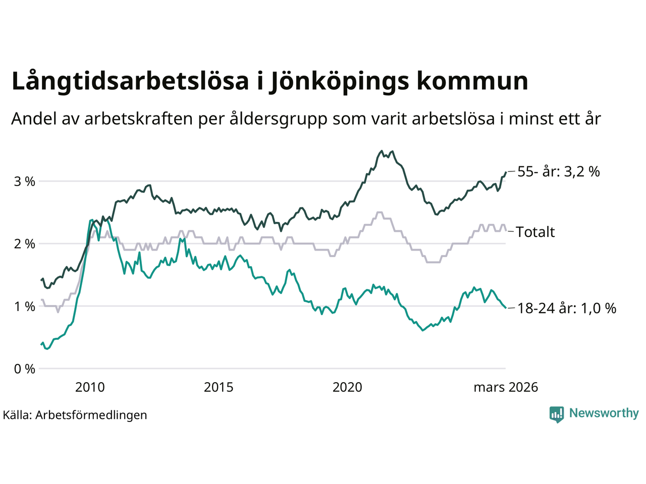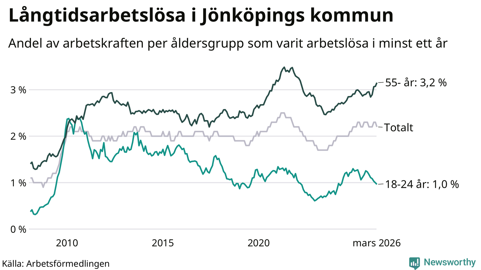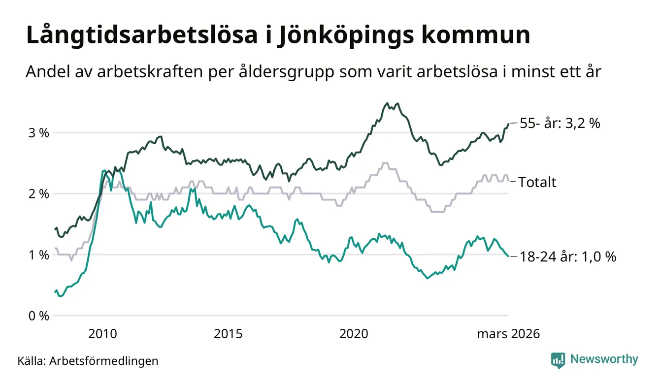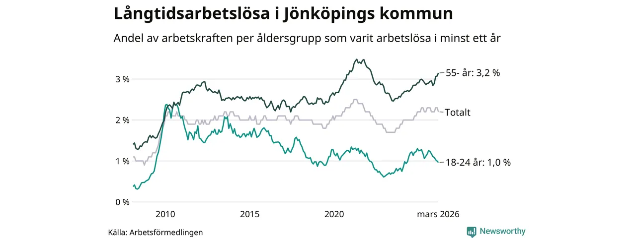 Av de 1 727 personerna som varit arbetslösa i mer än ett år i Jönköpings kommun är 468 personer mellan 55 och 661 år och 90 är mellan 18 och 24 år. För den äldre gruppen är andelen arbetslösa 3,2 procent medan den i den yngre gruppen är 1,0 procent. Även i riket som helhet är långtidsarbetslösheten högre i gruppen äldre.