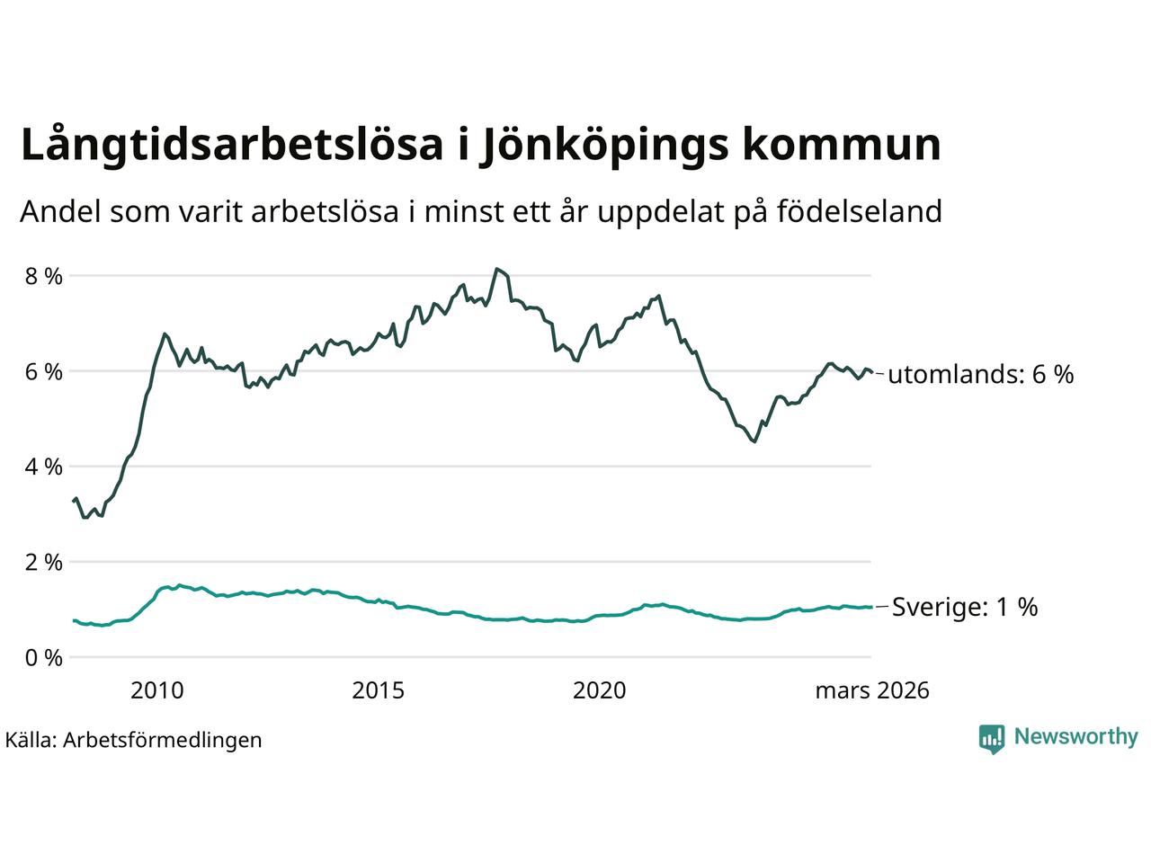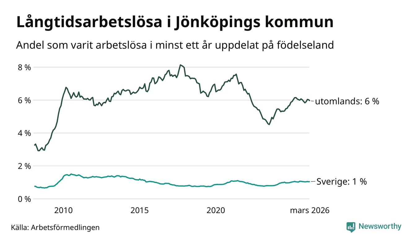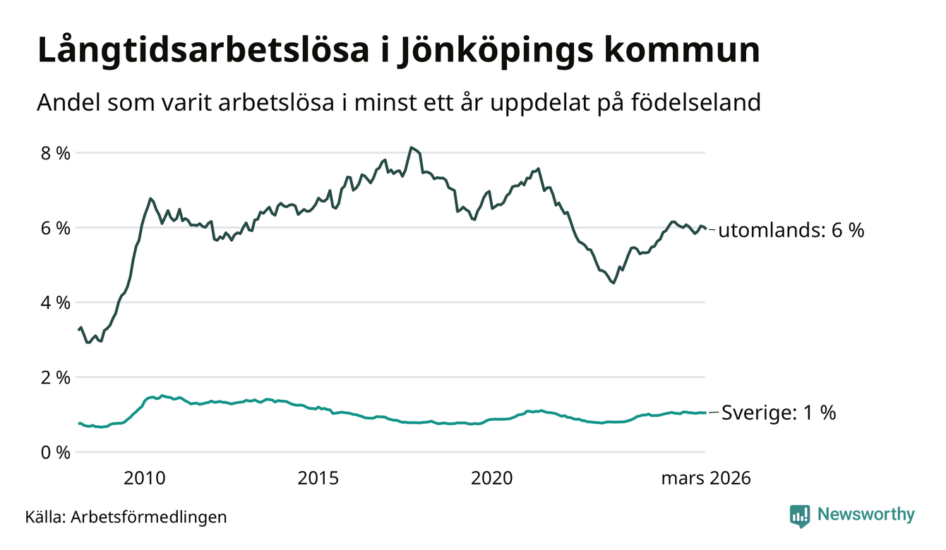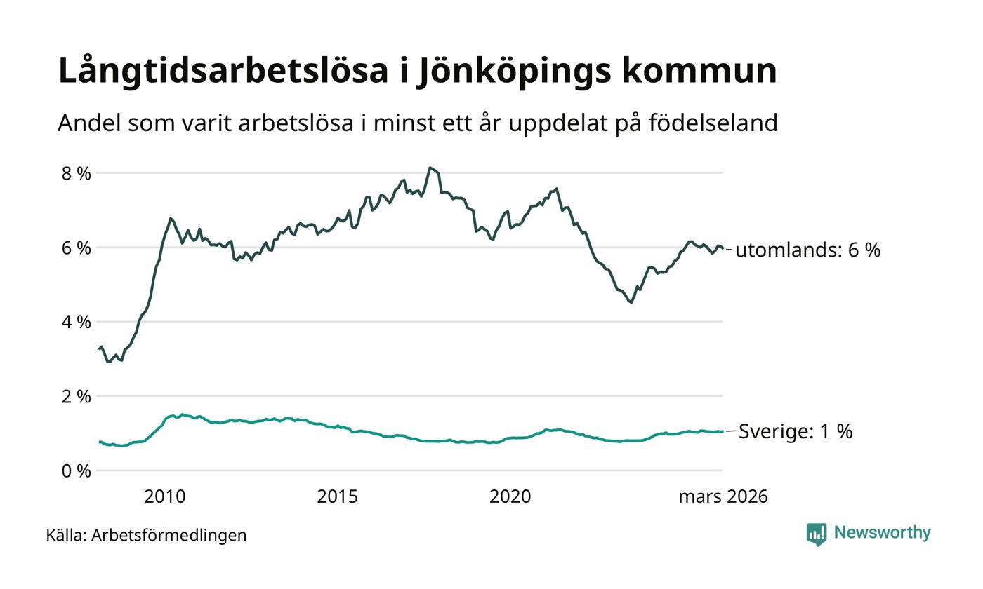 611 av de långtidsarbetslösa i Jönköpings kommun är födda i Sverige, medan 1 116 är födda utomlands. Det innebär att långtidsarbetslösheten bland Sverigefödda är 1,0 procent, medan den är sex gånger så hög – 6,0 procent – bland födda utomlands. Även i riket som helhet är arbetslösheten högre bland utrikesfödda.