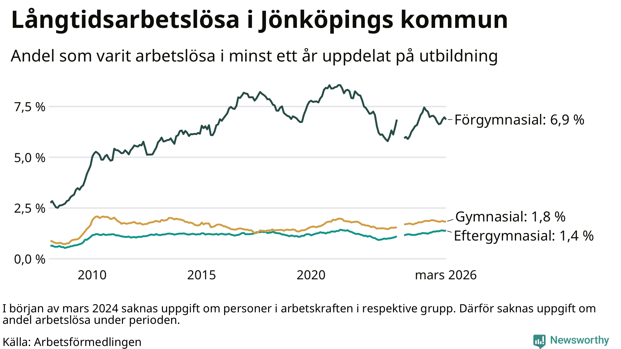 Graf över andel långtidsarbetslösa i Jönköpings kommun uppdelat på utbildningsnivå