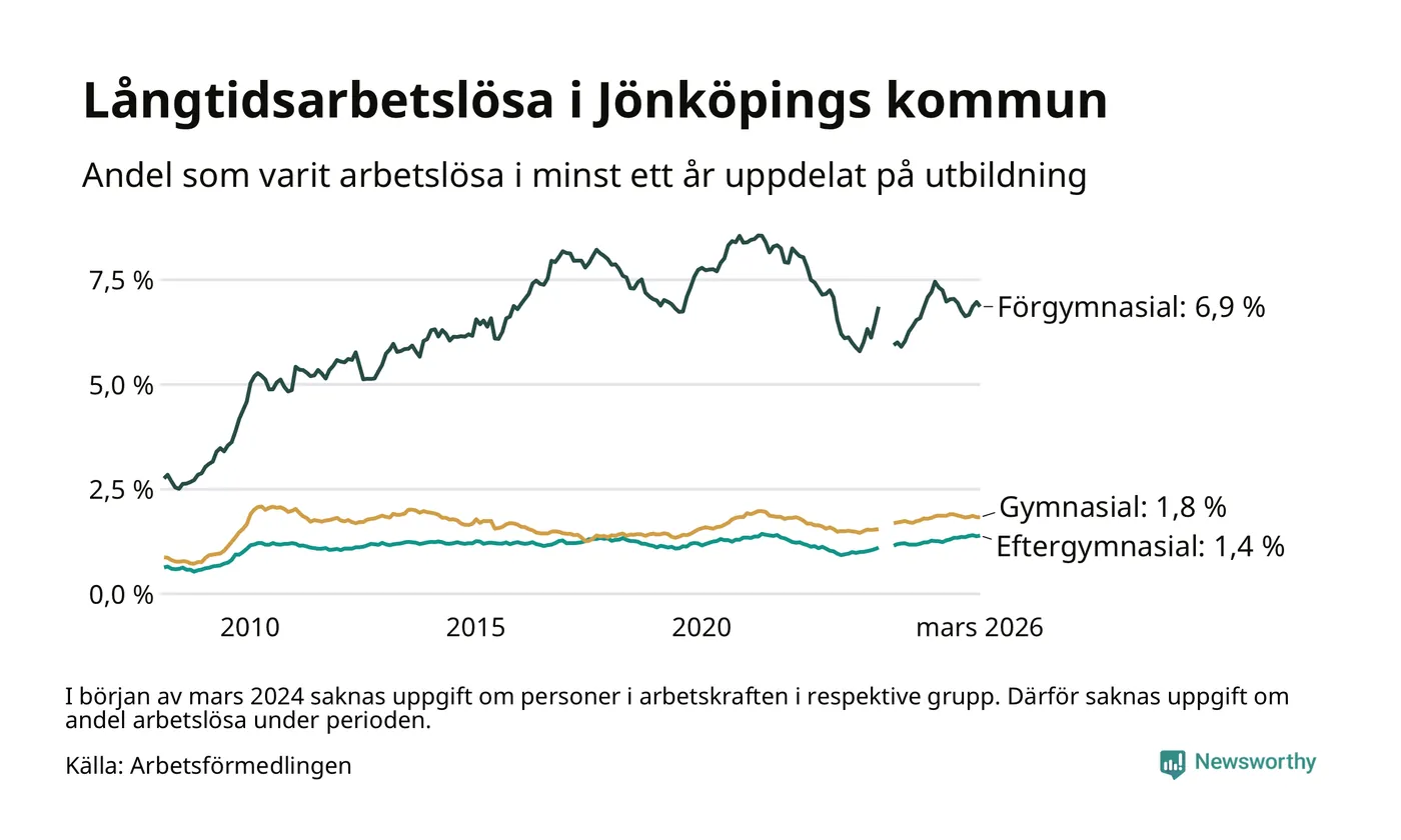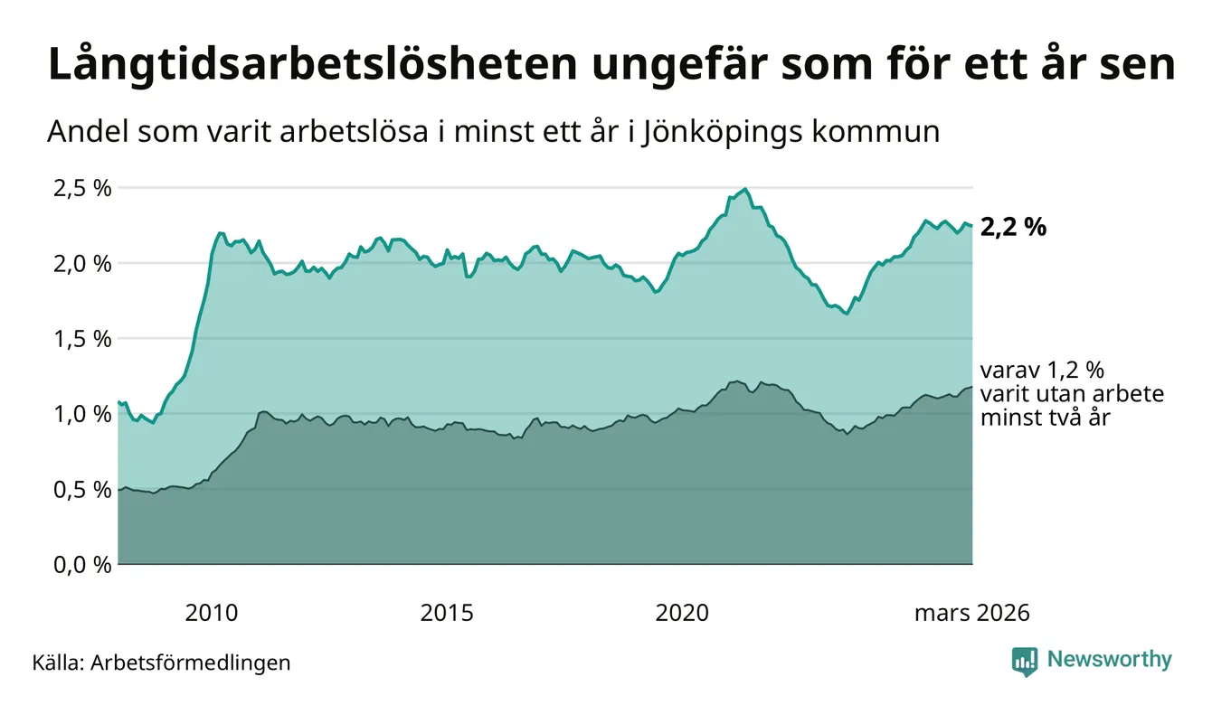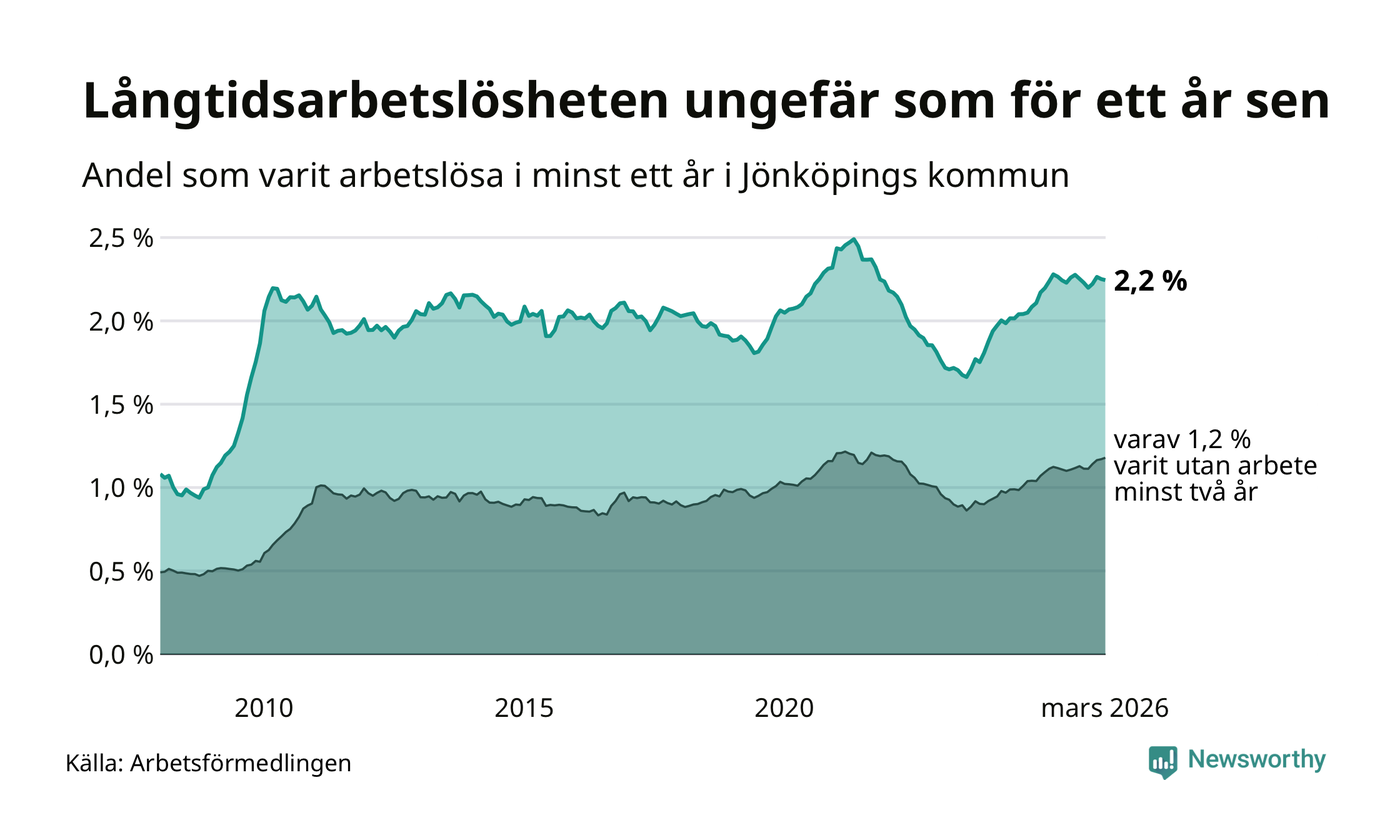 I mars hade 1 727 Jönköpingsbor varit arbetslösa i minst ett år, vilket är fyra färre än månaden innan. 1 727 personer motsvarar 2,2 procent av arbetskraften i kommunen – andelen långtidsarbetslösa är ungefär på samma nivå som för ett år sedan.