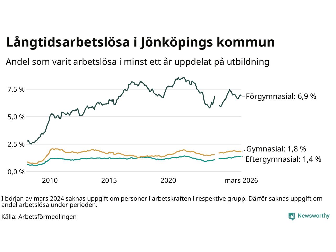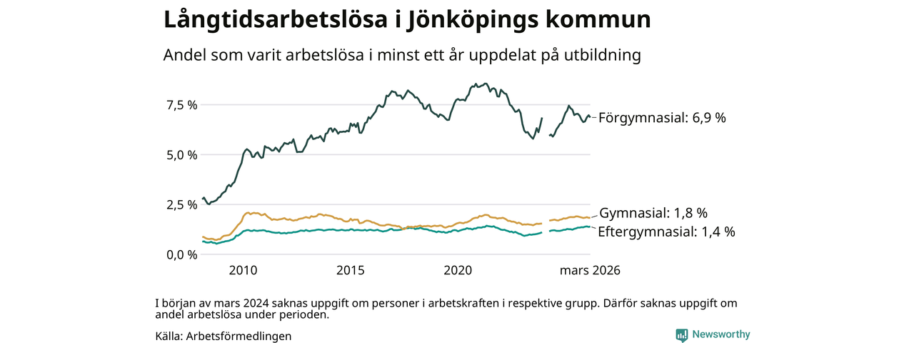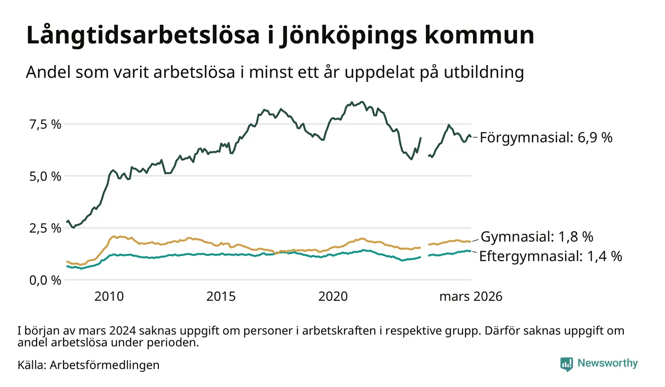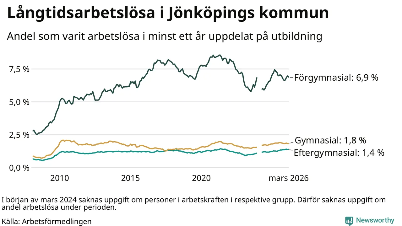 I mars hade 1 727 Jönköpingsbor varit arbetslösa i minst ett år, vilket är fyra färre än månaden innan. 1 727 personer motsvarar 2,2 procent av arbetskraften i kommunen – andelen långtidsarbetslösa är ungefär på samma nivå som för ett år sedan.