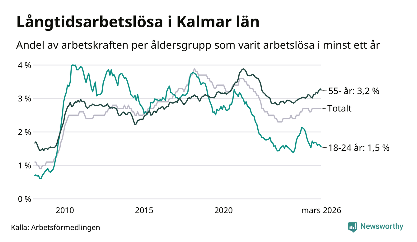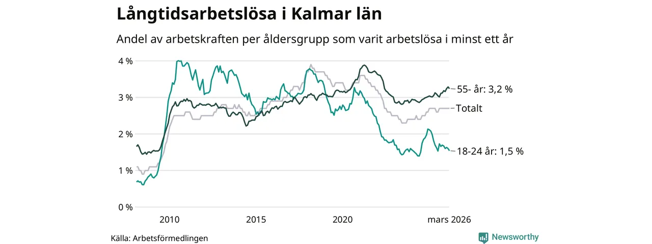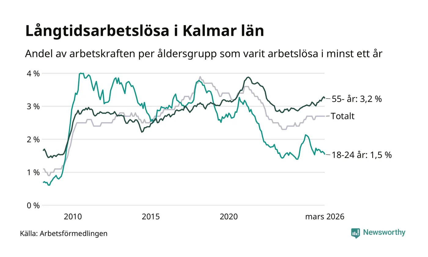 Av de 3 102 personerna som varit arbetslösa i mer än ett år i Kalmar län är 903 personer mellan 55 och 661 år och mellan 179 och 179 är mellan 18 och 24 år. För den äldre gruppen är andelen arbetslösa 3,2 procent medan den i den yngre gruppen är 1,5 procent. Även i riket som helhet är långtidsarbetslösheten högre i gruppen äldre.