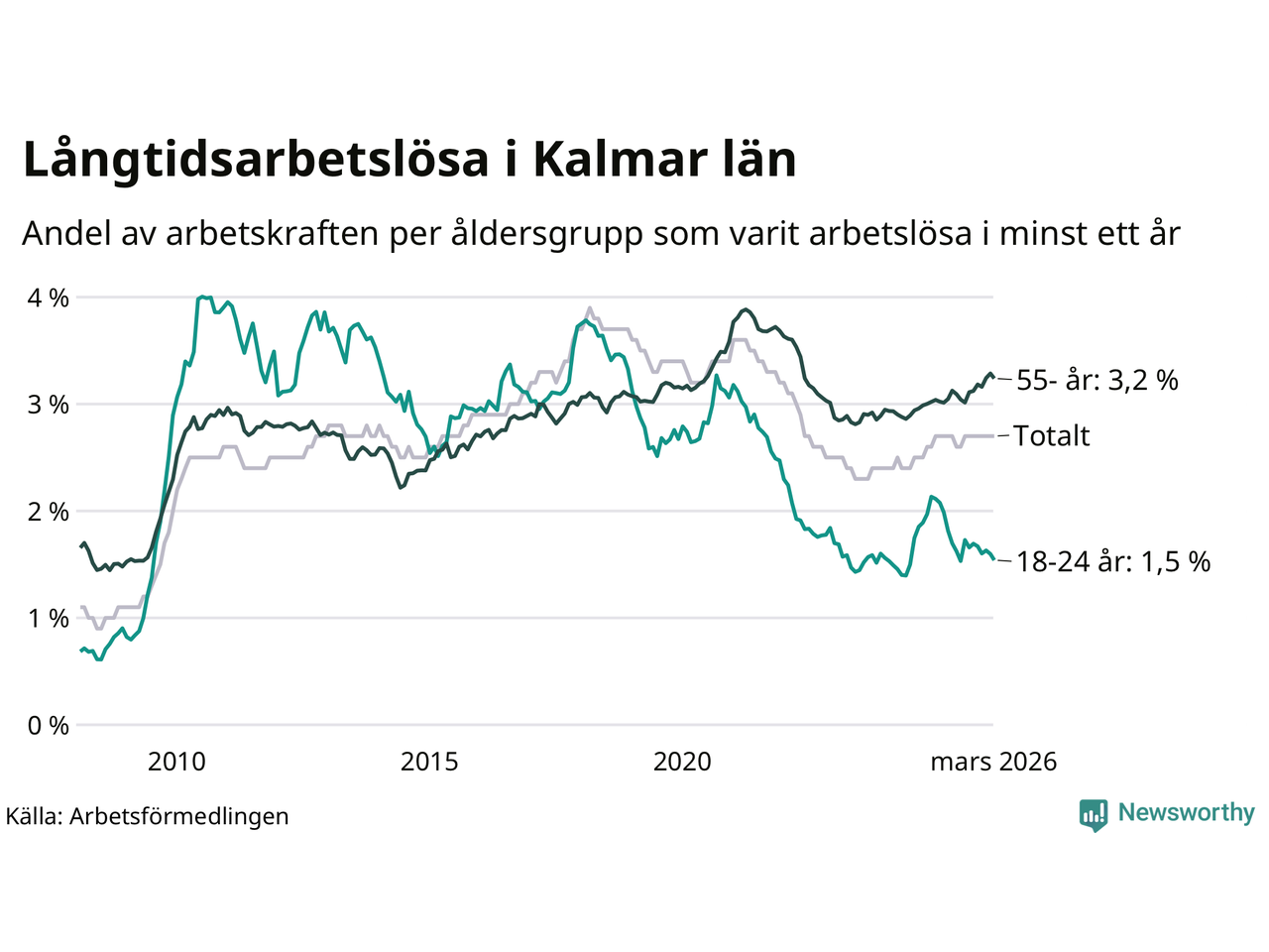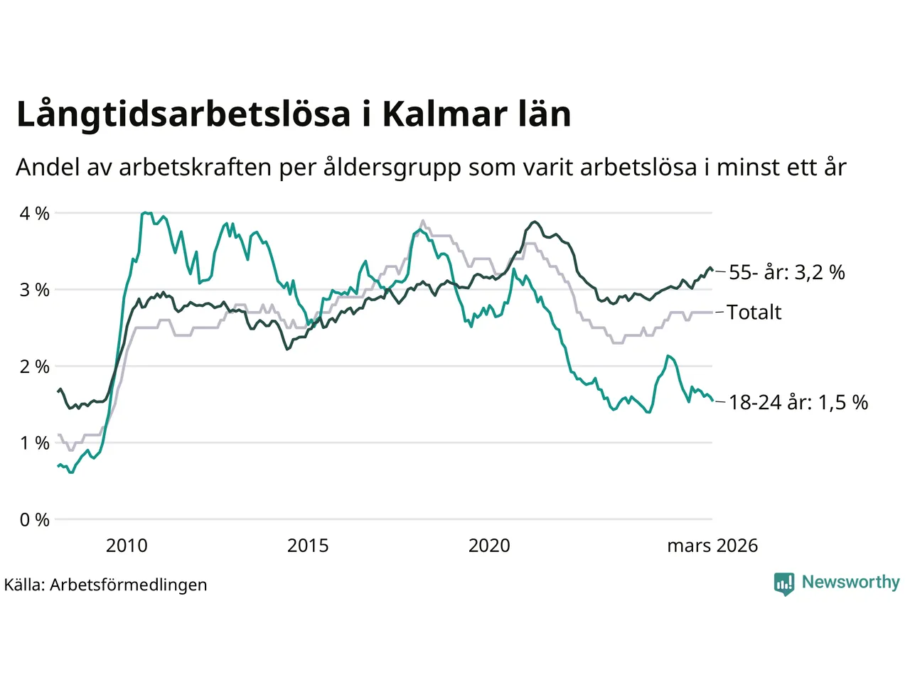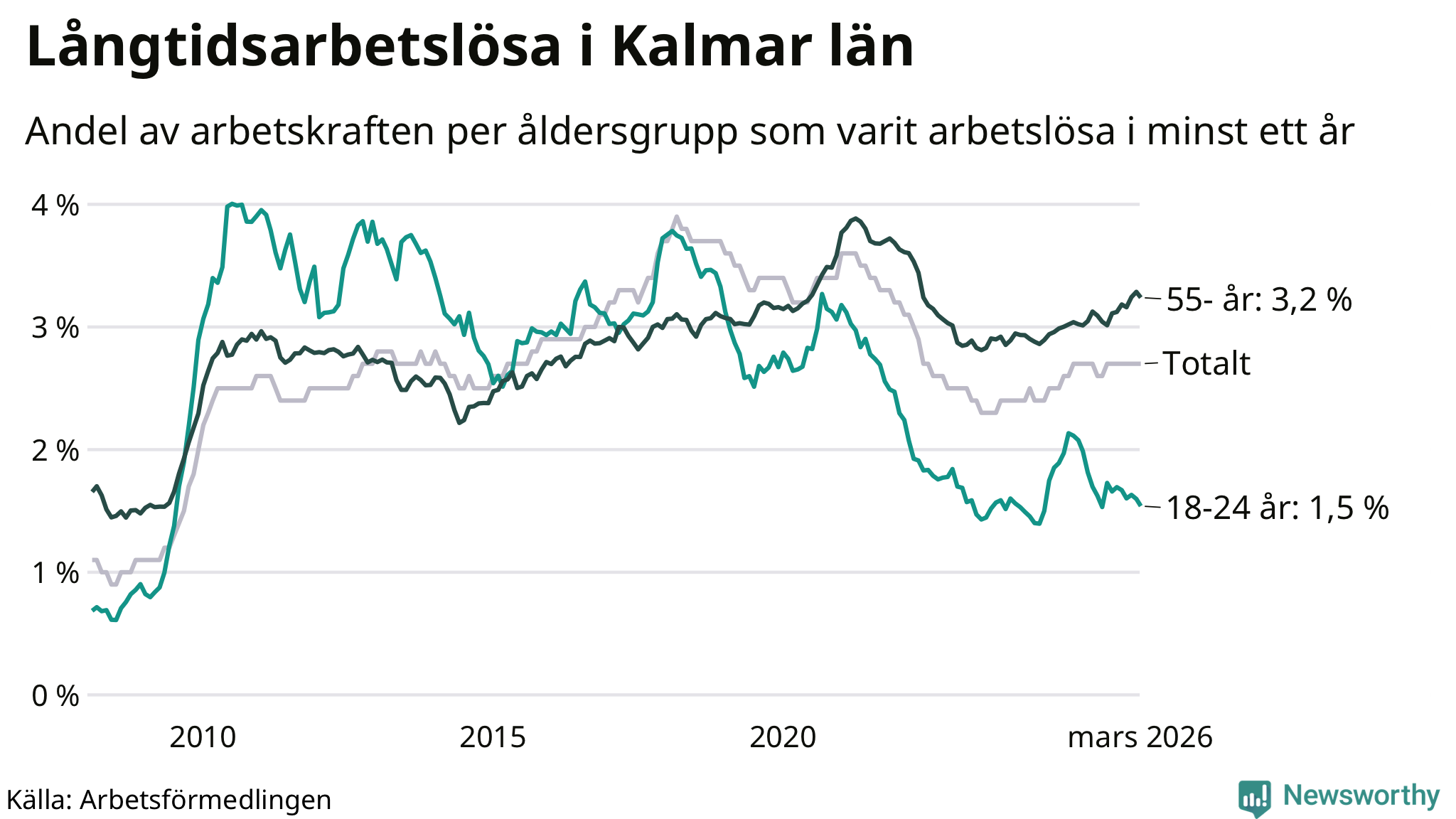 Av de 3 102 personerna som varit arbetslösa i mer än ett år i Kalmar län är 903 personer mellan 55 och 661 år och mellan 179 och 179 är mellan 18 och 24 år. För den äldre gruppen är andelen arbetslösa 3,2 procent medan den i den yngre gruppen är 1,5 procent. Även i riket som helhet är långtidsarbetslösheten högre i gruppen äldre.