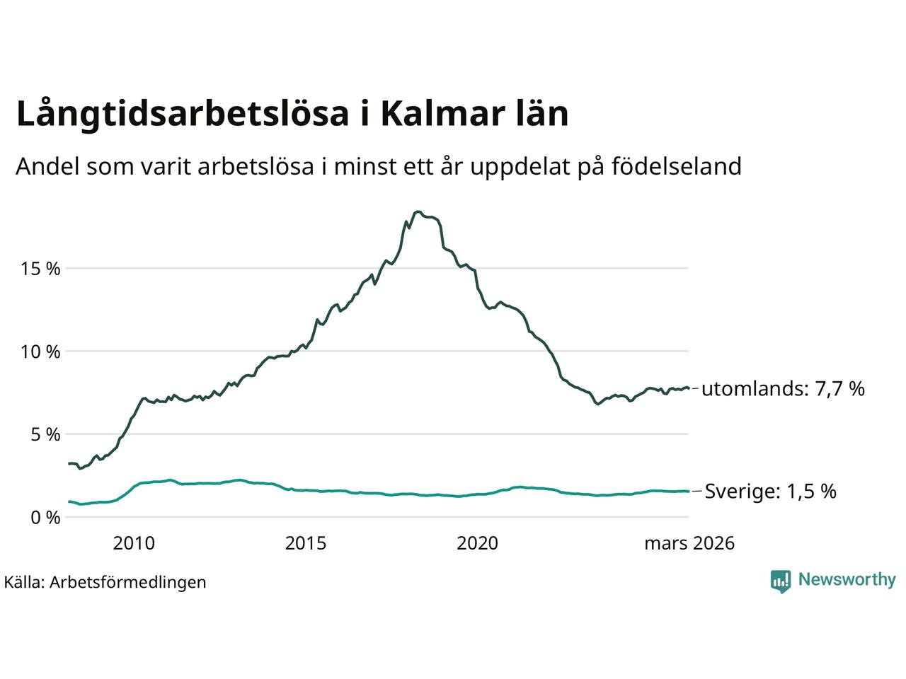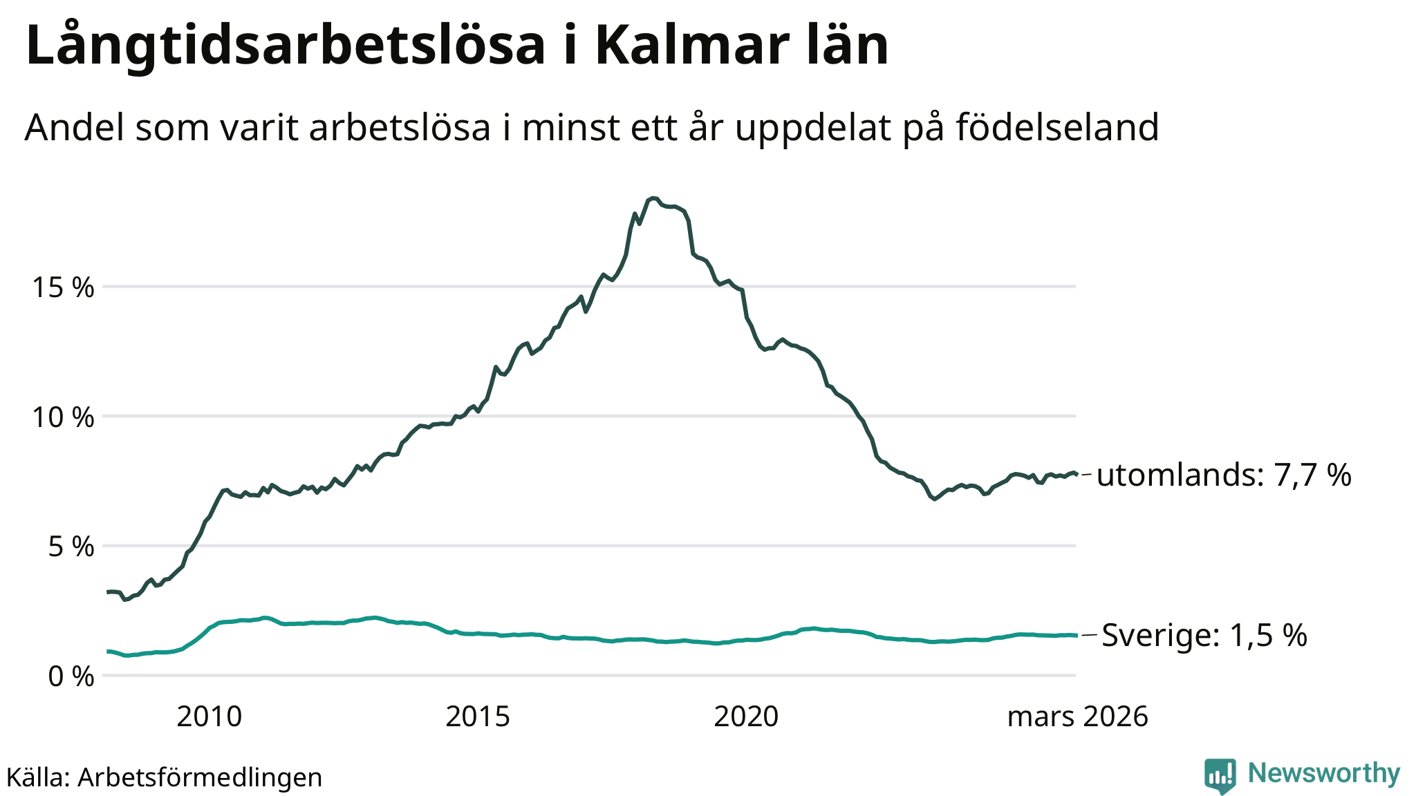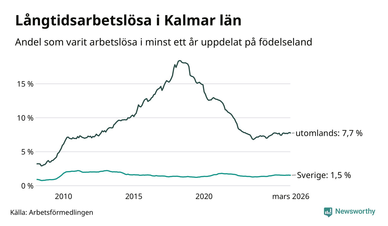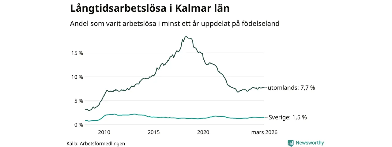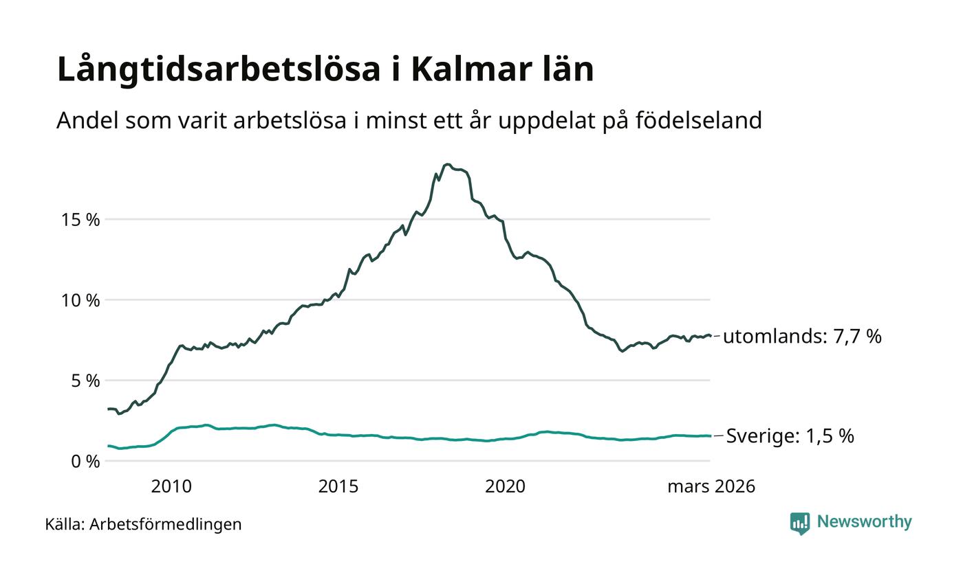 1 457 av de långtidsarbetslösa i Kalmar län är födda i Sverige och mellan 1 646 och 1 649 är födda utomlands. Det innebär att långtidsarbetslösheten bland Sverigefödda är 1,5 procent, medan den ligger på 7,7 procent för utlandsfödda.