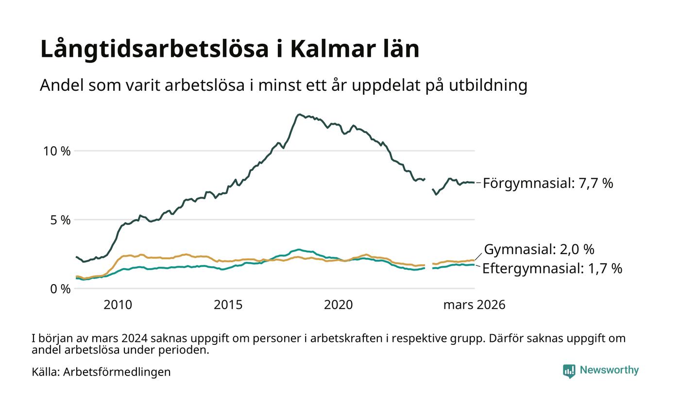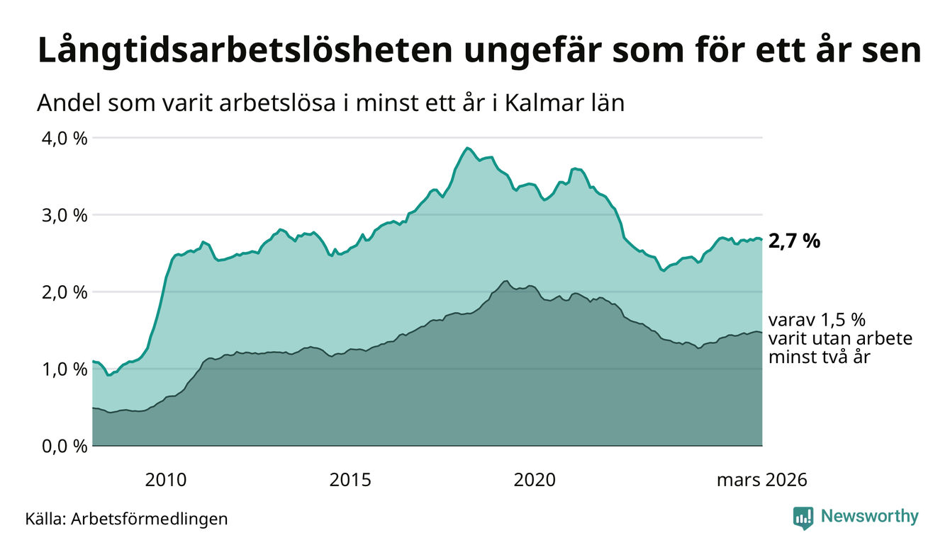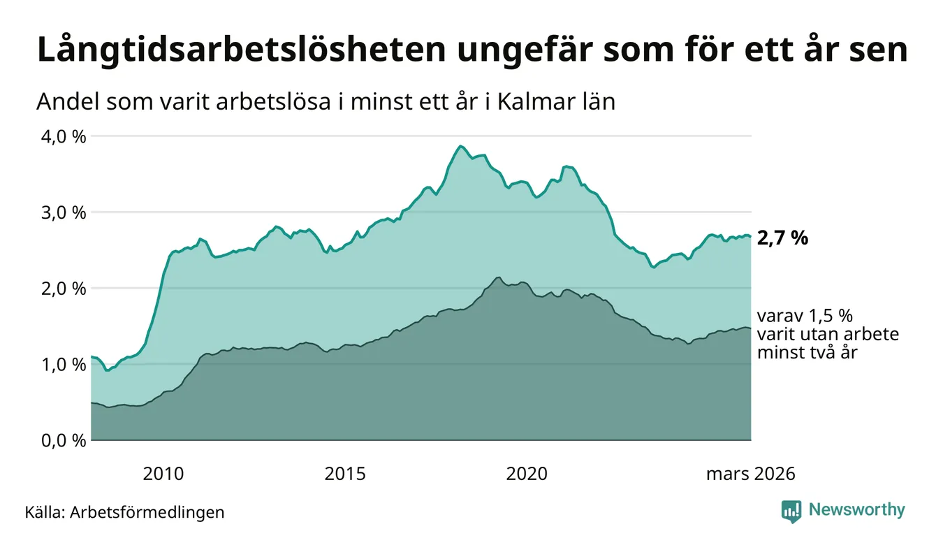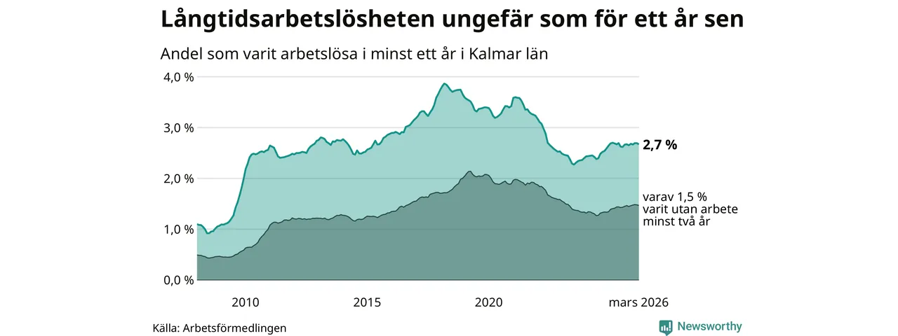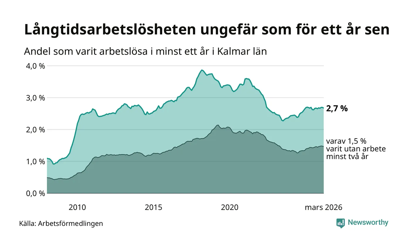 I mars hade 3 102 Kalmarbor varit arbetslösa i minst ett år, vilket är 28 färre än månaden innan. 3 102 personer motsvarar 2,7 procent av arbetskraften i länet – andelen långtidsarbetslösa är ungefär på samma nivå som för ett år sedan.