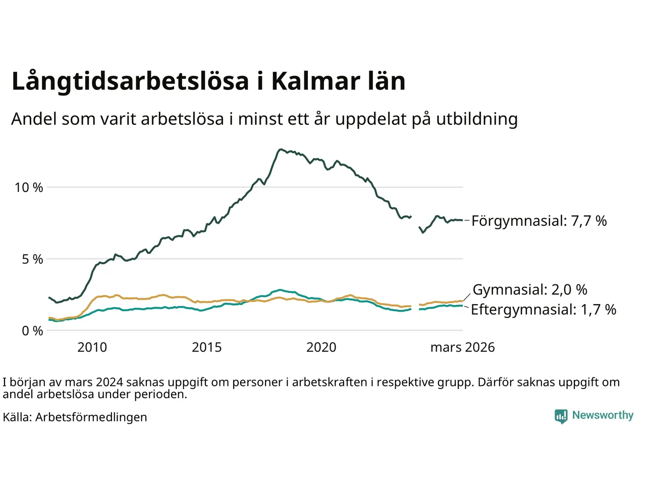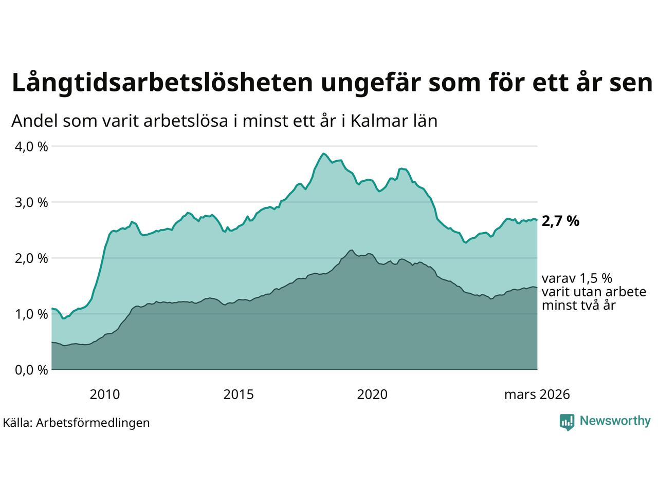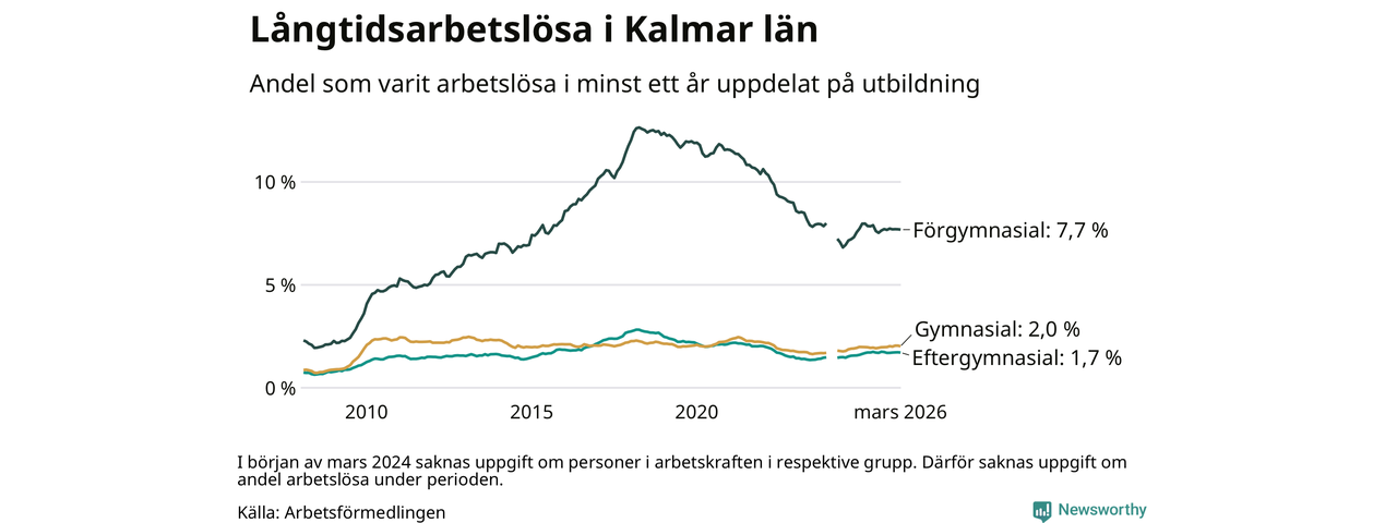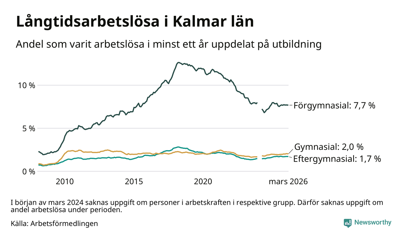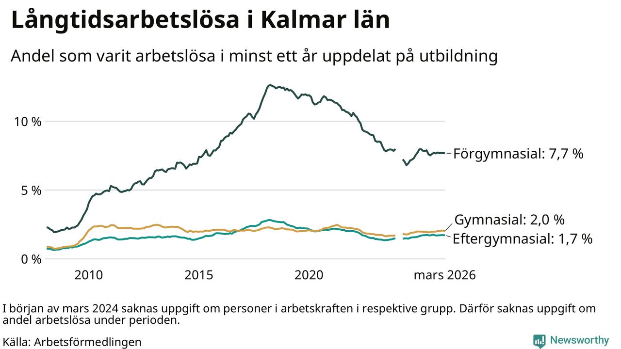 I mars hade 3 102 Kalmarbor varit arbetslösa i minst ett år, vilket är 28 färre än månaden innan. 3 102 personer motsvarar 2,7 procent av arbetskraften i länet – andelen långtidsarbetslösa är ungefär på samma nivå som för ett år sedan.