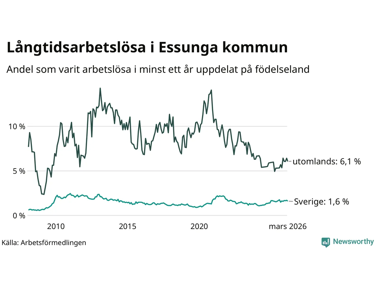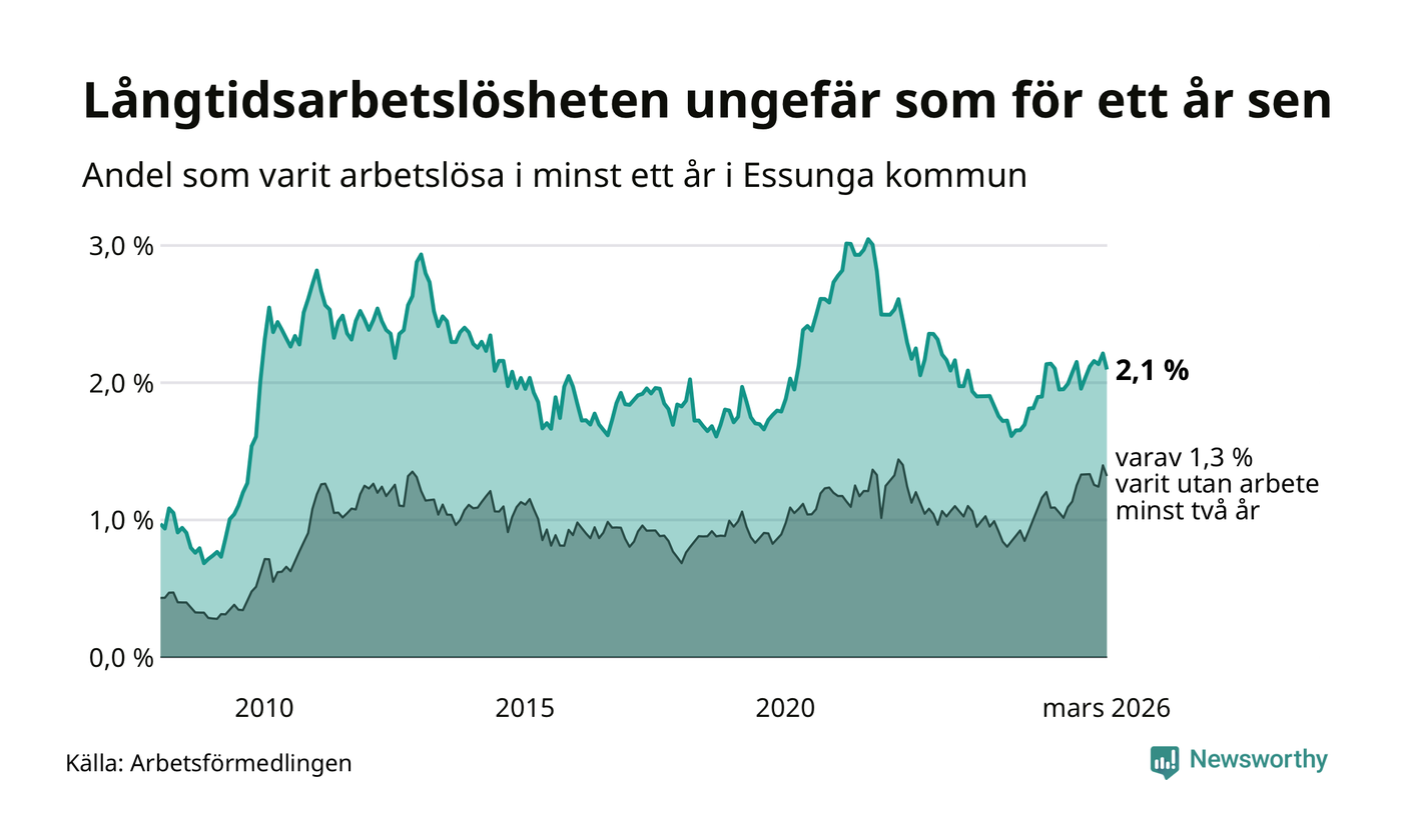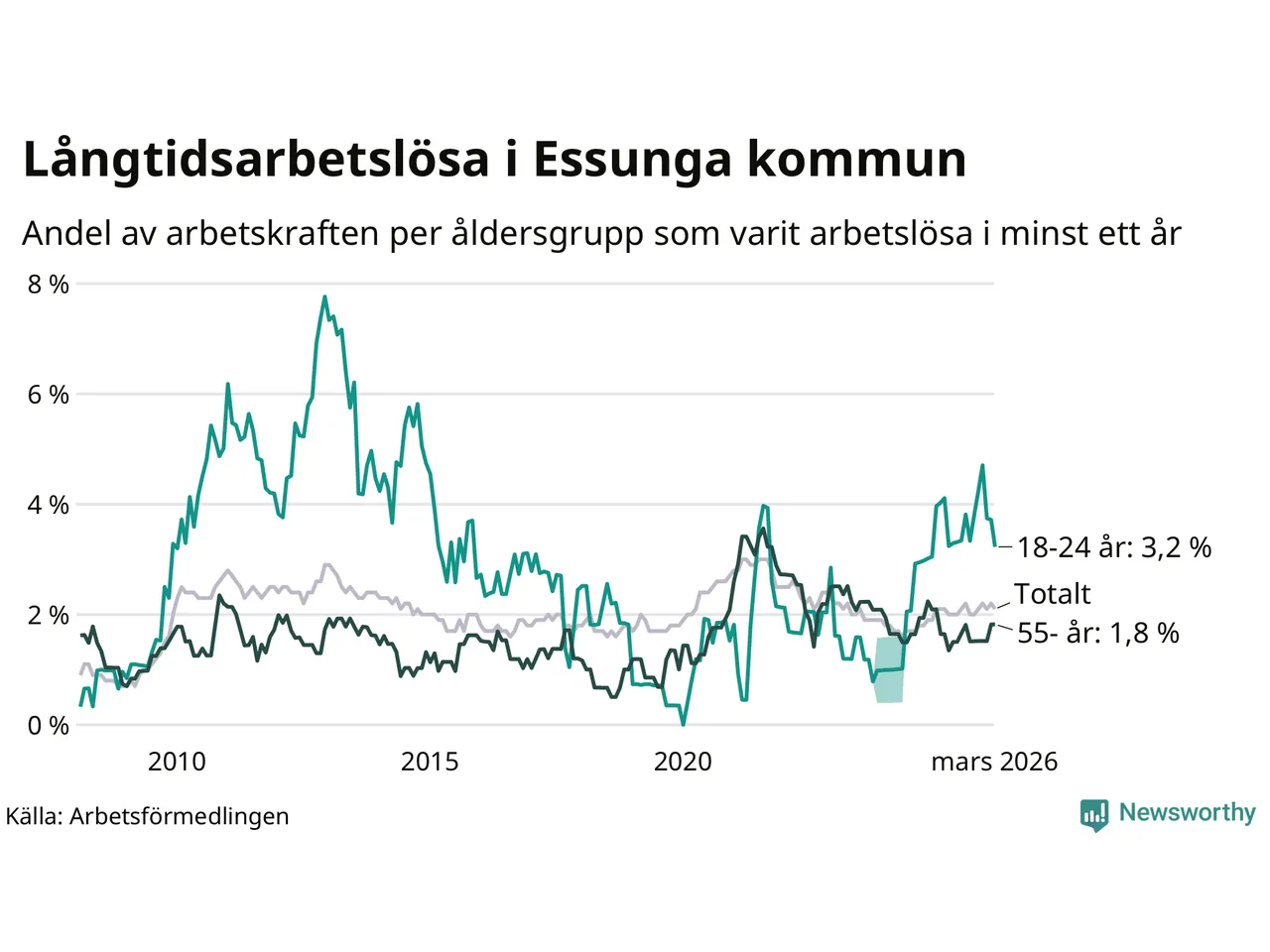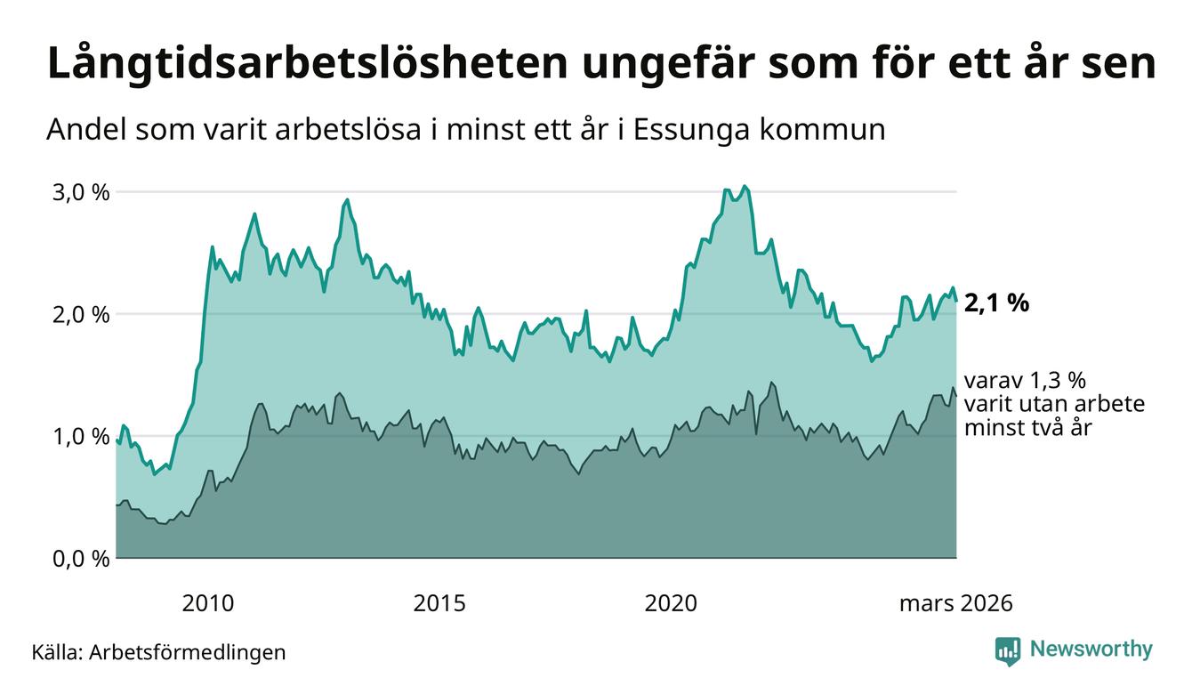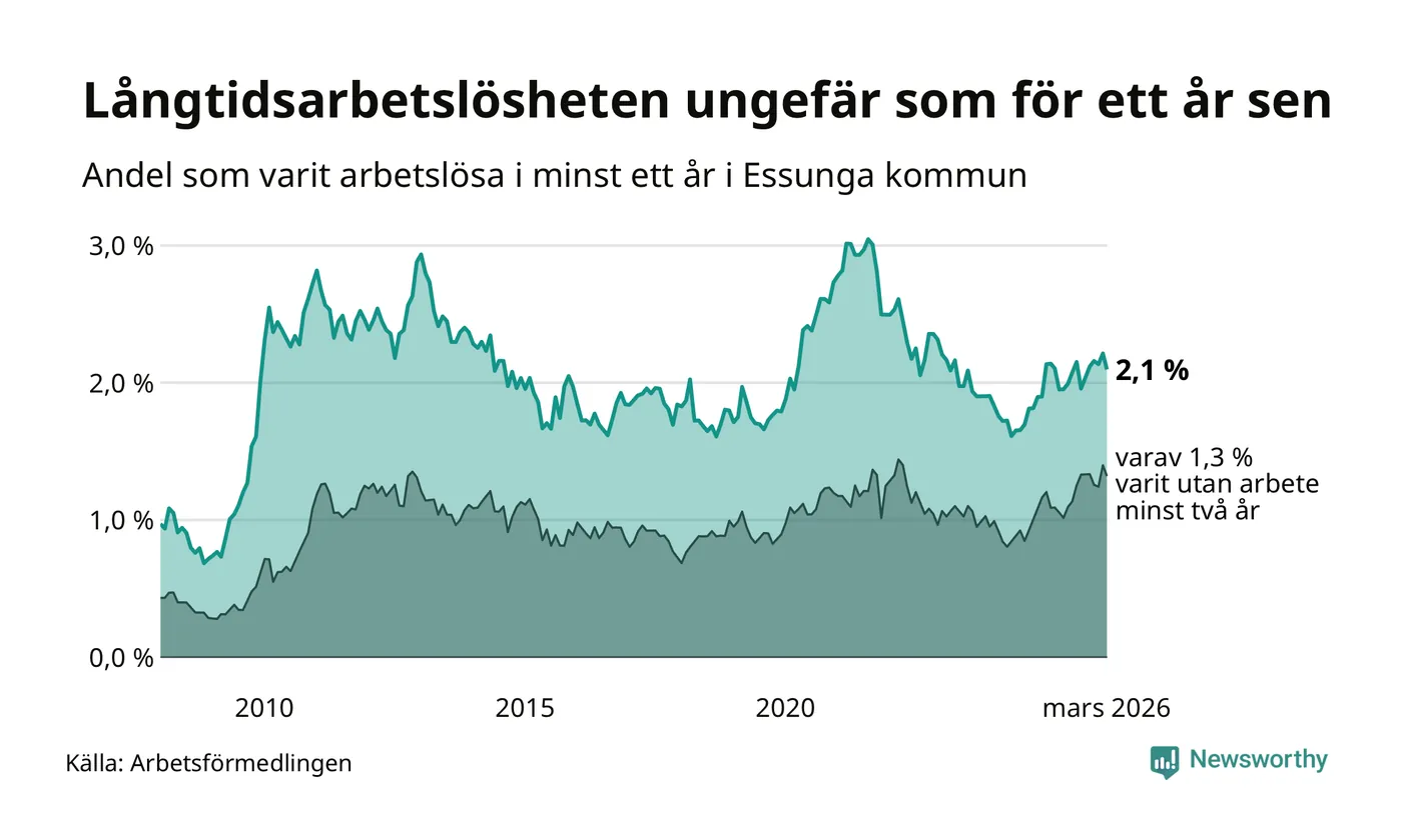 I mars hade 54 Essungabor varit arbetslösa i minst ett år, vilket är tre färre än månaden innan. Det är den första månaden sedan september 2025 som antalet arbetslösa minskar. 54 personer motsvarar 2,1 procent av arbetskraften i kommunen – andelen långtidsarbetslösa är ungefär på samma nivå som för ett år sedan.
