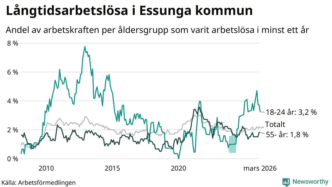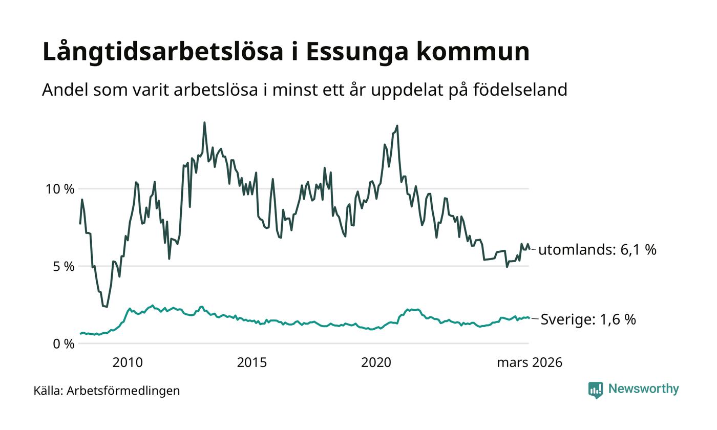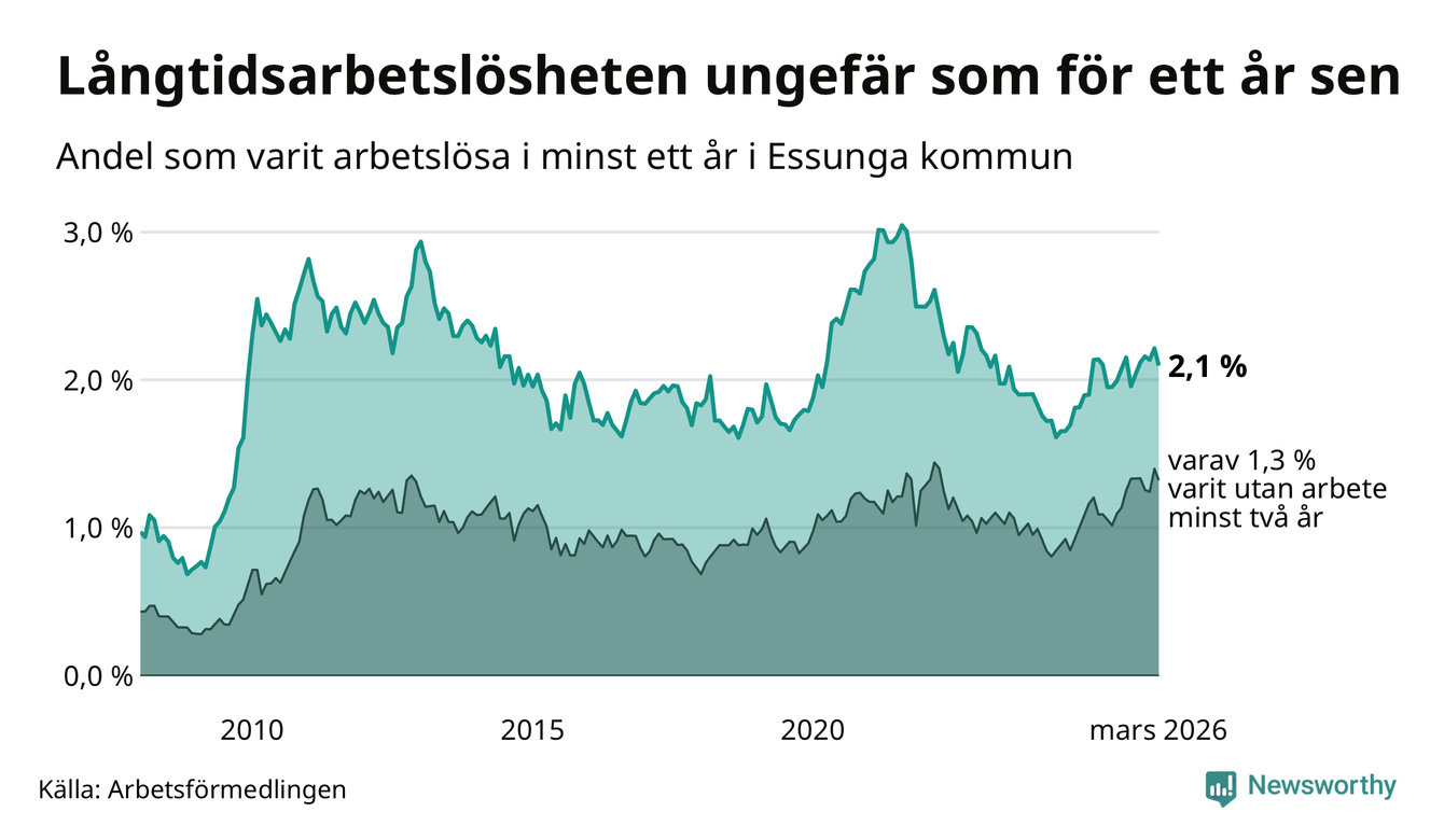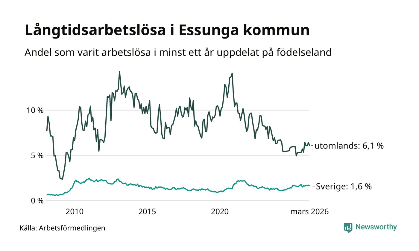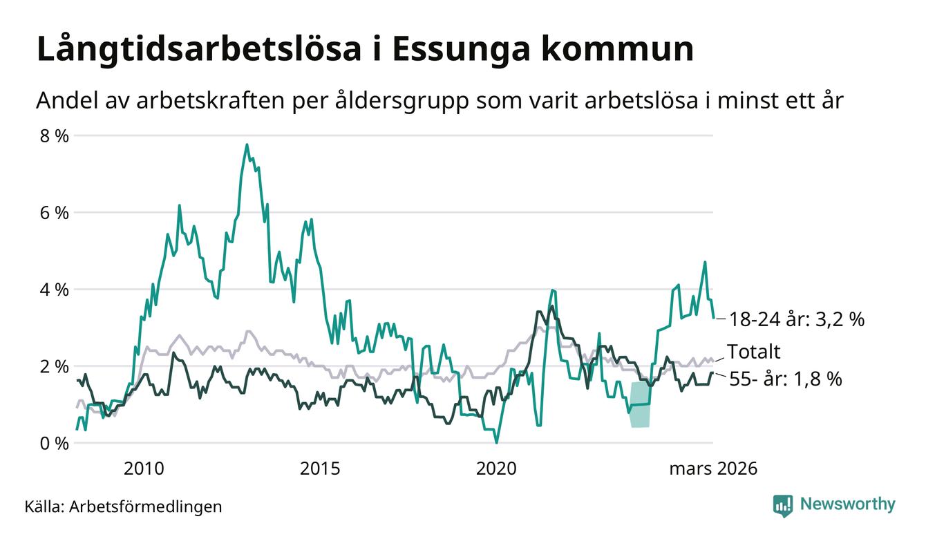 I mars hade 54 Essungabor varit arbetslösa i minst ett år, vilket är tre färre än månaden innan. Det är den första månaden sedan september 2025 som antalet arbetslösa minskar. 54 personer motsvarar 2,1 procent av arbetskraften i kommunen – andelen långtidsarbetslösa är ungefär på samma nivå som för ett år sedan.