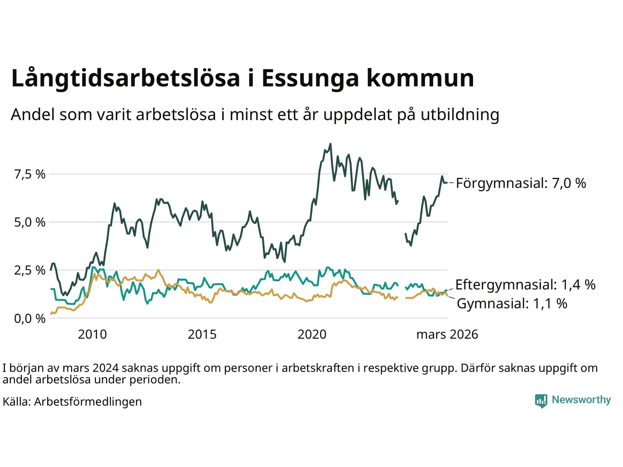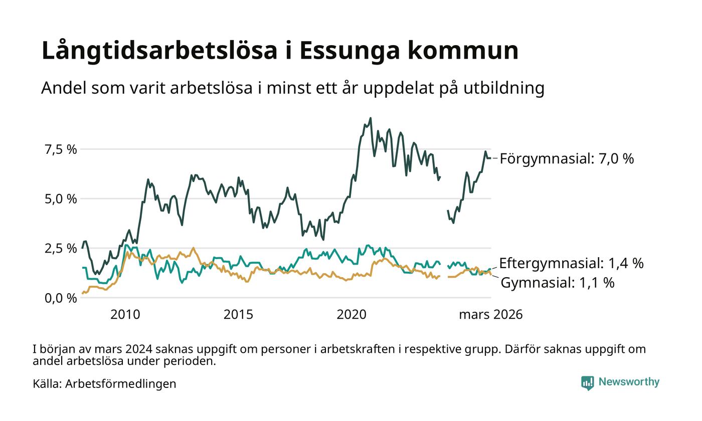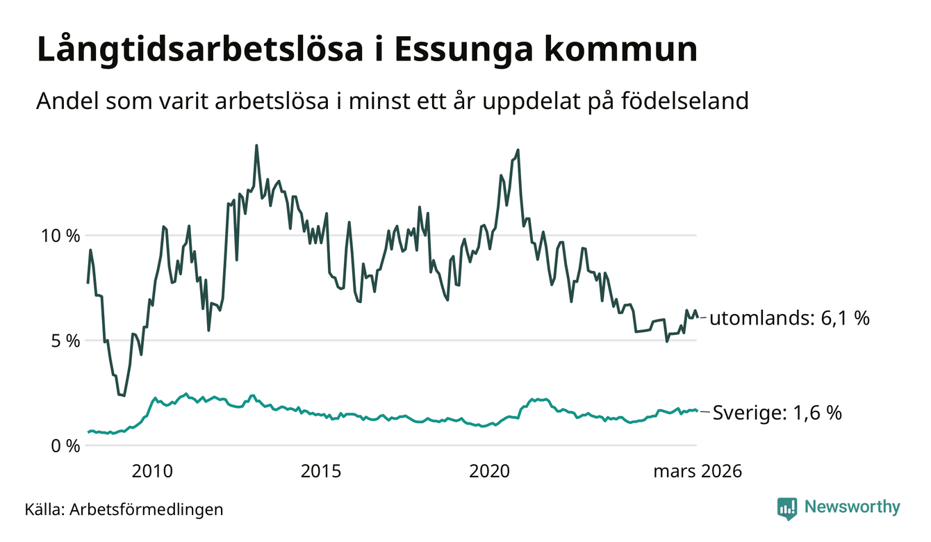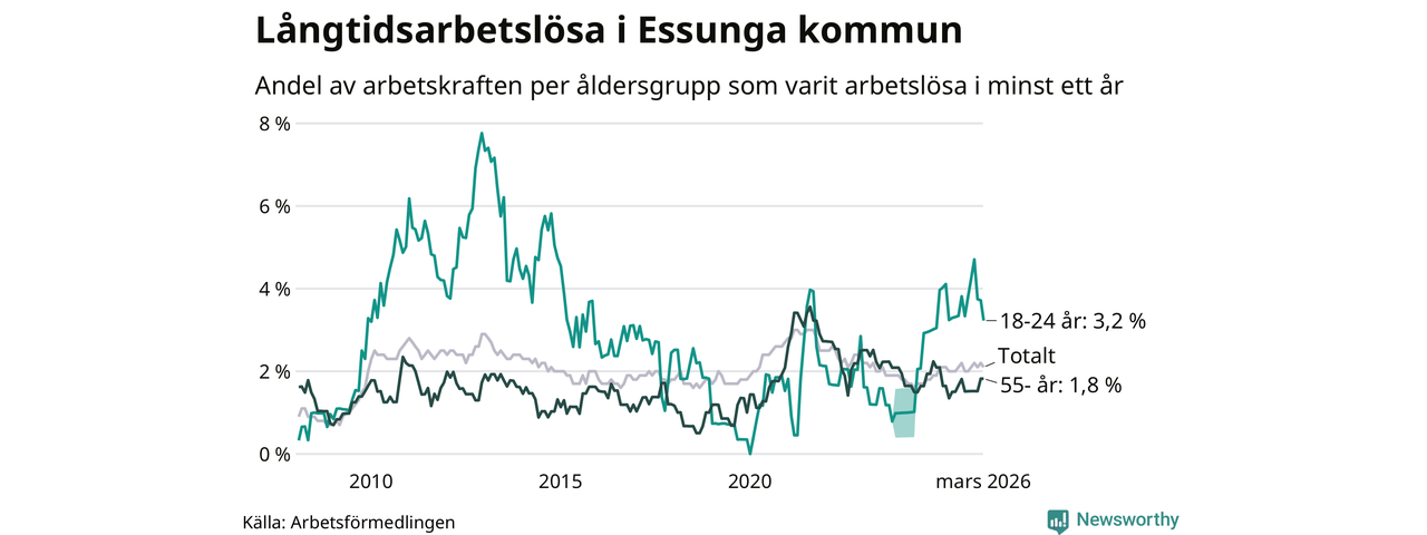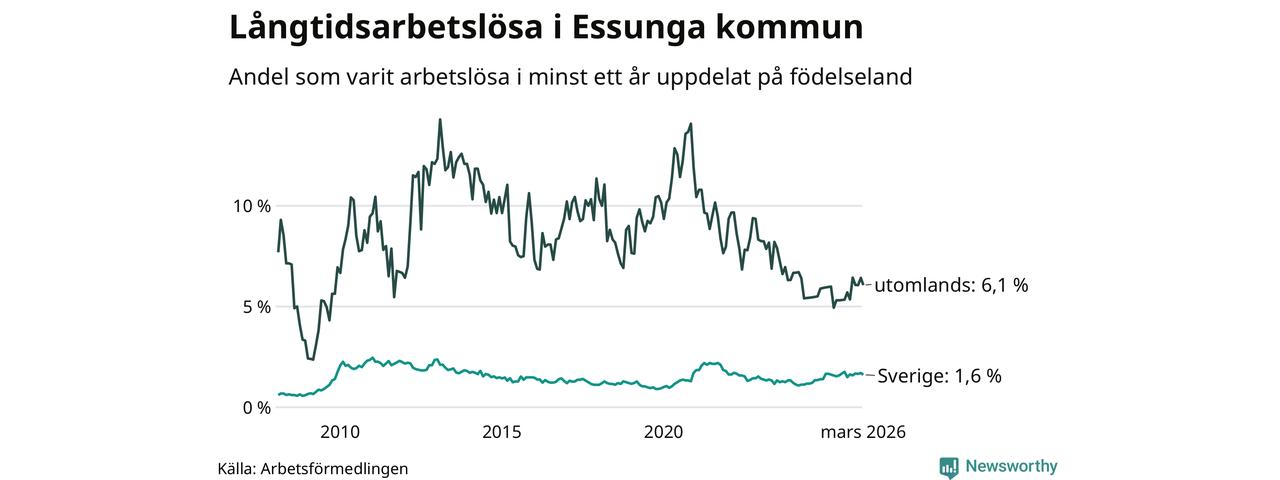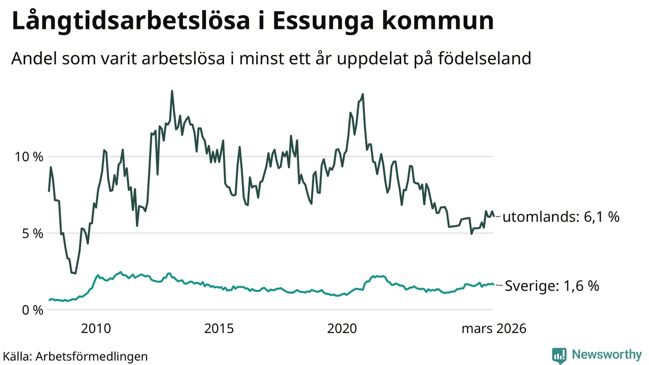I mars hade 54 Essungabor varit arbetslösa i minst ett år, vilket är tre färre än månaden innan. Det är den första månaden sedan september 2025 som antalet arbetslösa minskar. 54 personer motsvarar 2,1 procent av arbetskraften i kommunen – andelen långtidsarbetslösa är ungefär på samma nivå som för ett år sedan.