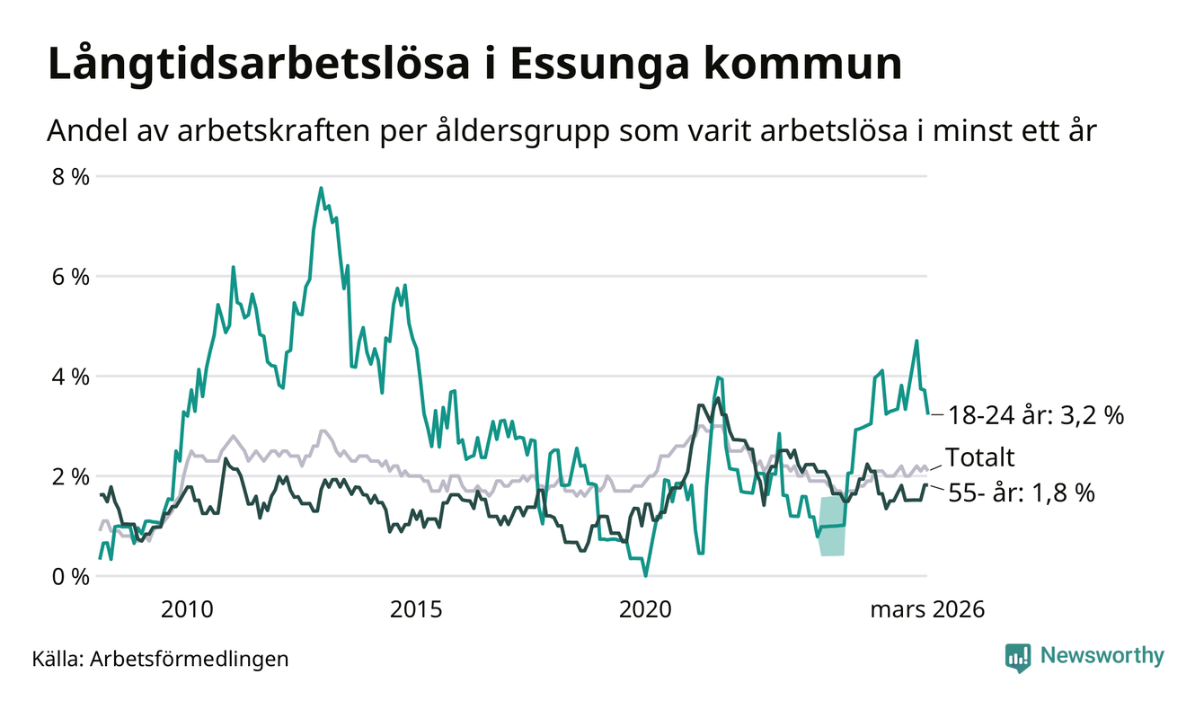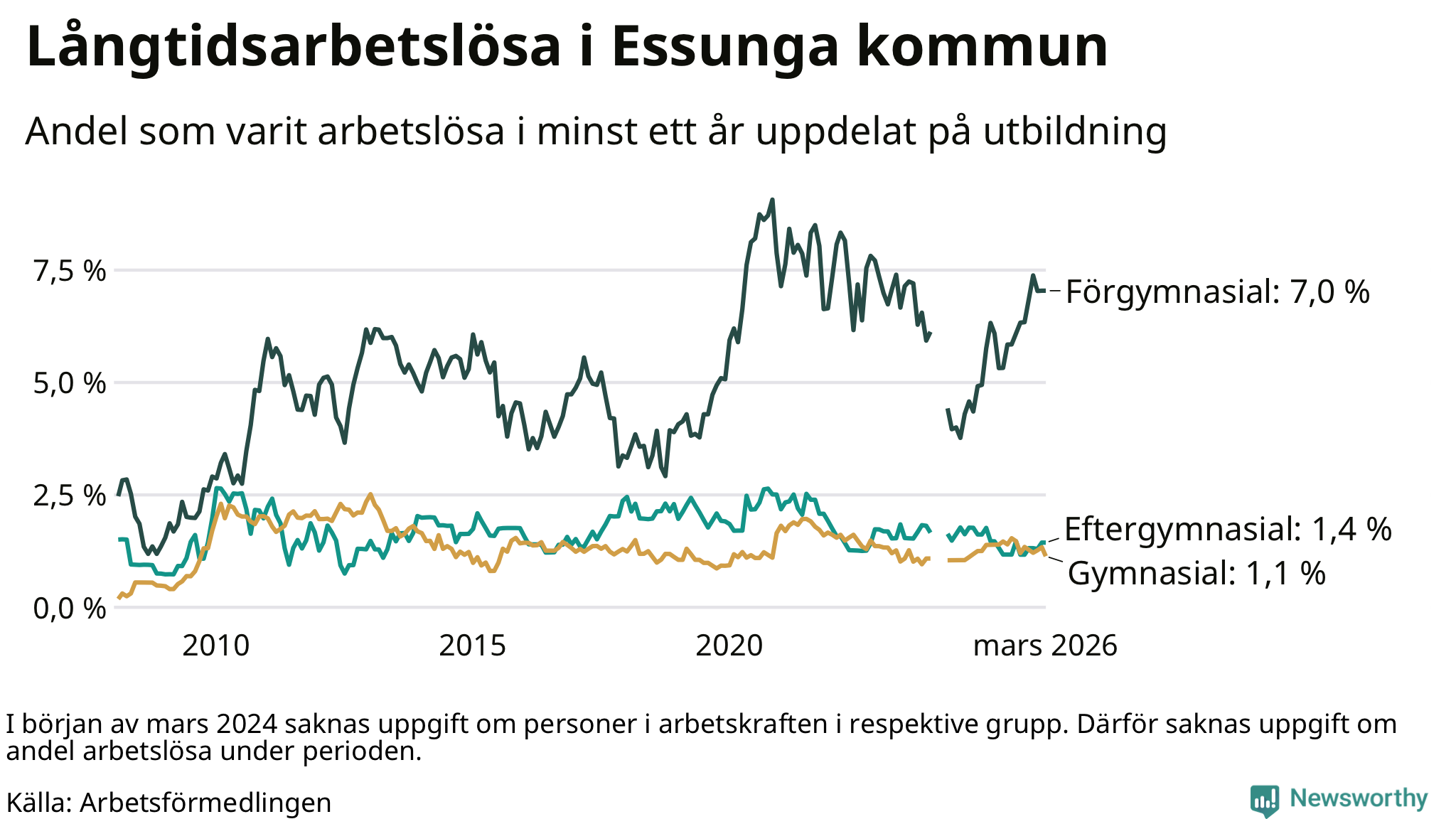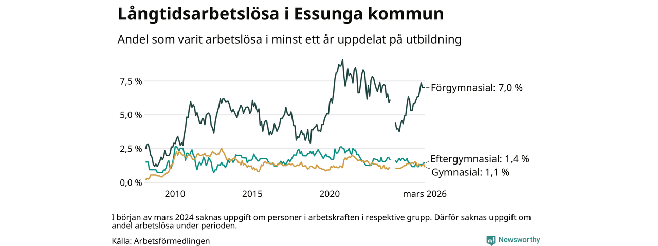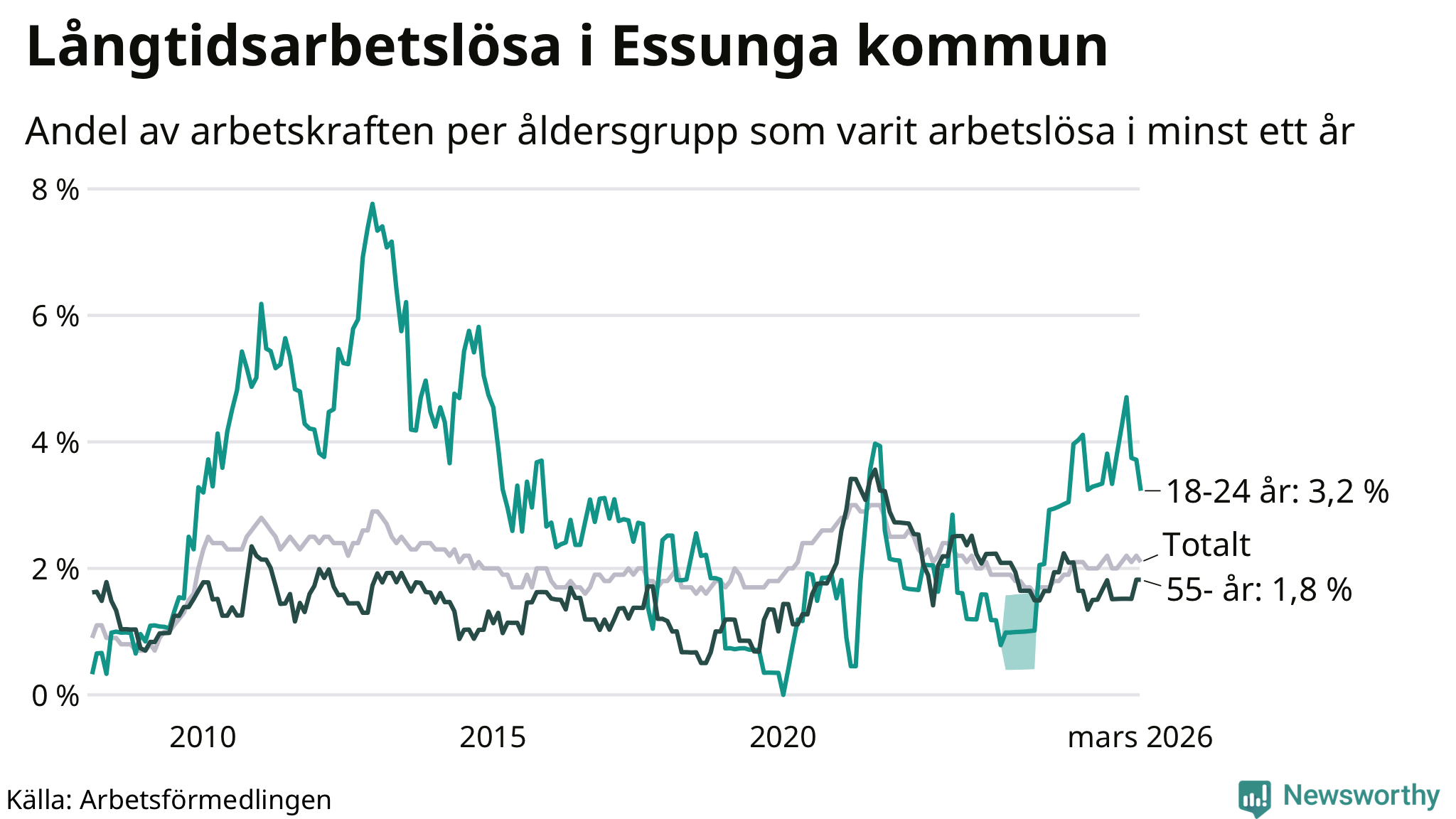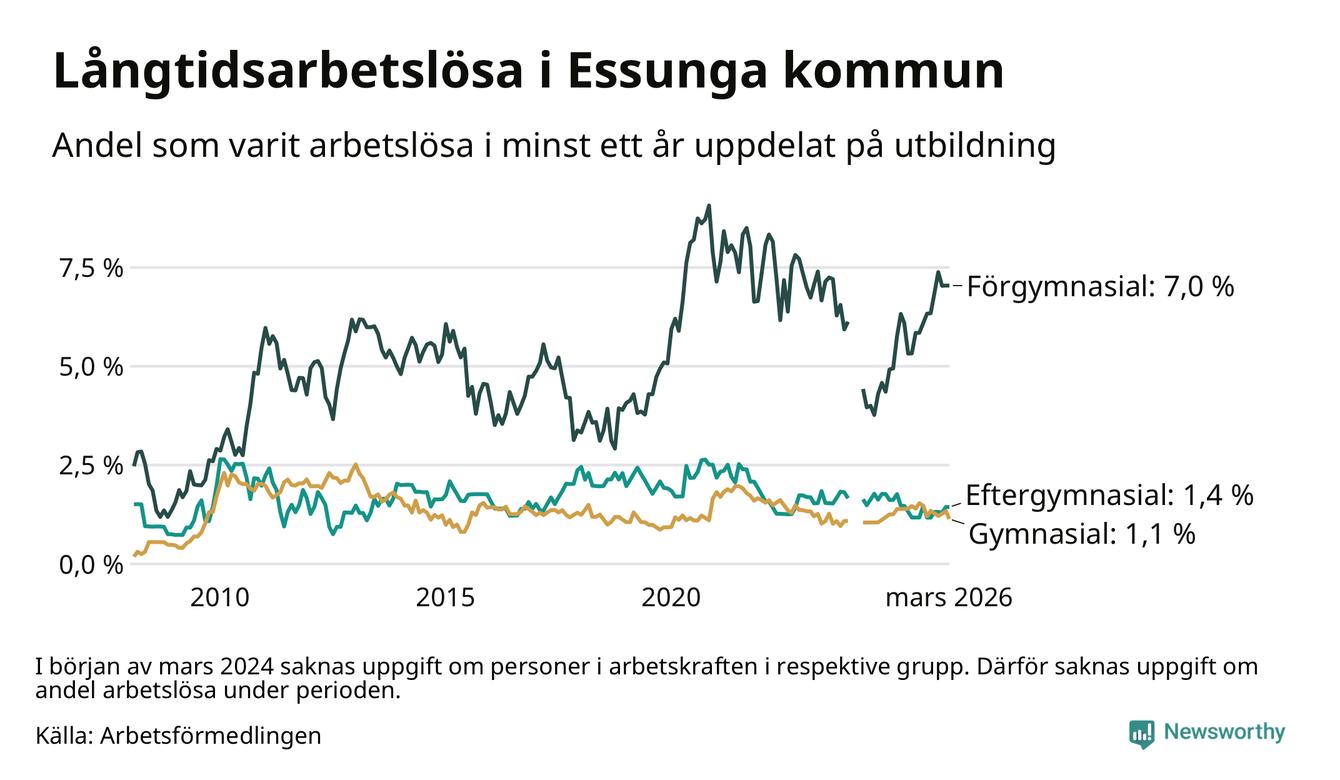 I mars hade 54 Essungabor varit arbetslösa i minst ett år, vilket är tre färre än månaden innan. Det är den första månaden sedan september 2025 som antalet arbetslösa minskar. 54 personer motsvarar 2,1 procent av arbetskraften i kommunen – andelen långtidsarbetslösa är ungefär på samma nivå som för ett år sedan.