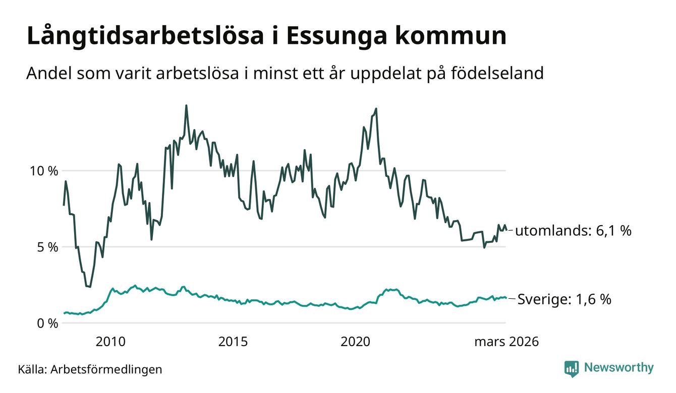 37 av de långtidsarbetslösa i Essunga är födda i Sverige, medan 17 är födda utomlands. Det innebär att långtidsarbetslösheten bland Sverigefödda är 1,6 procent, medan den är fyra gånger så hög – 6,1 procent – bland födda utomlands. Även i riket som helhet är arbetslösheten högre bland utrikesfödda.