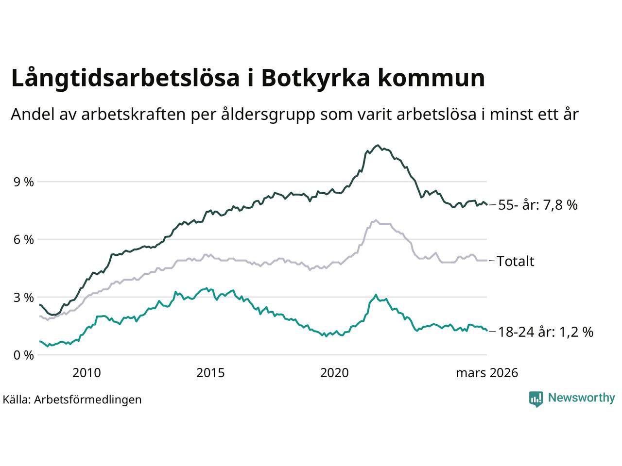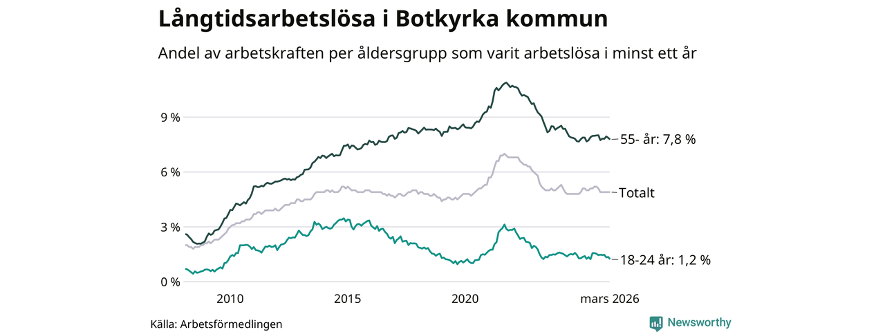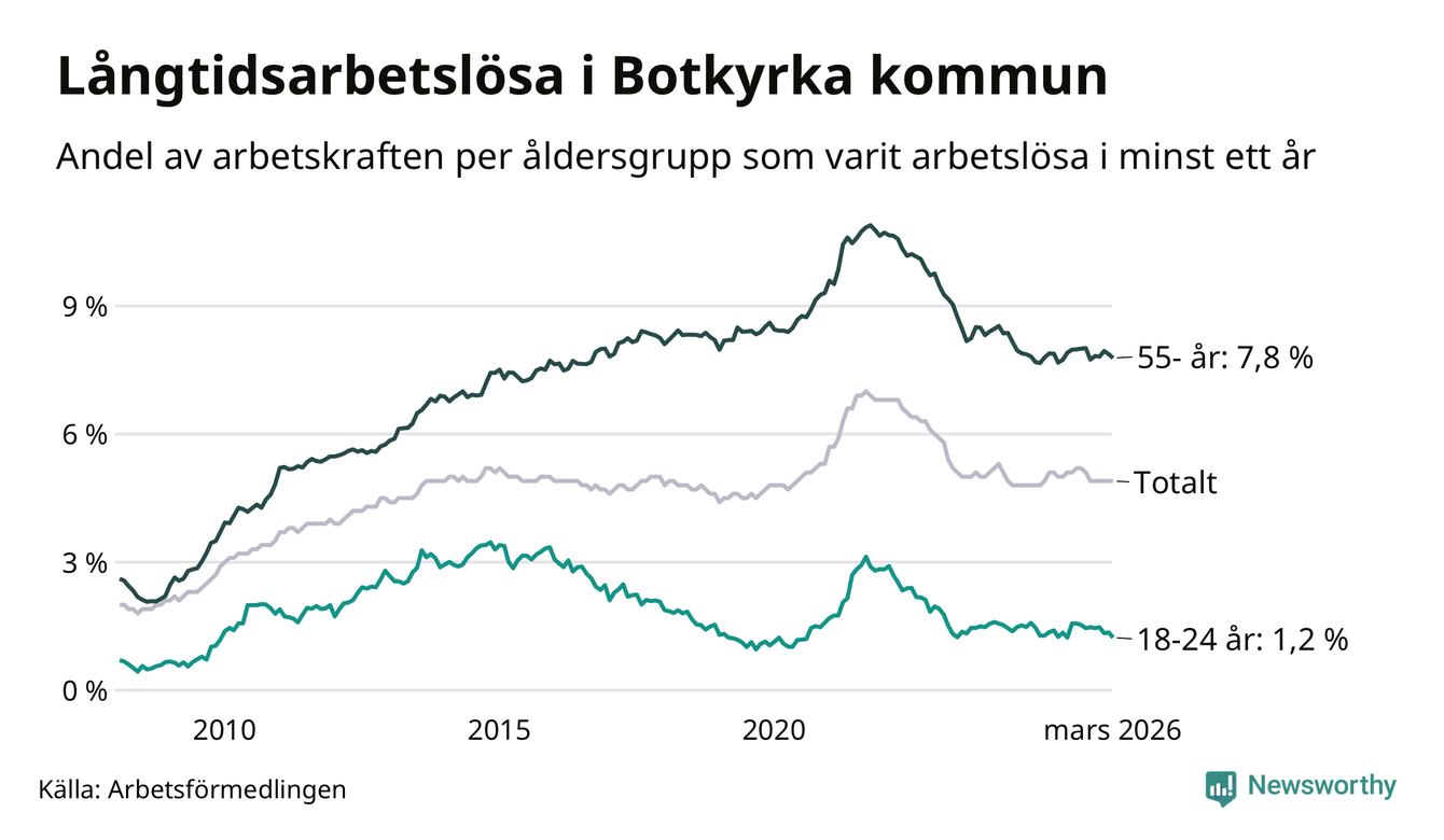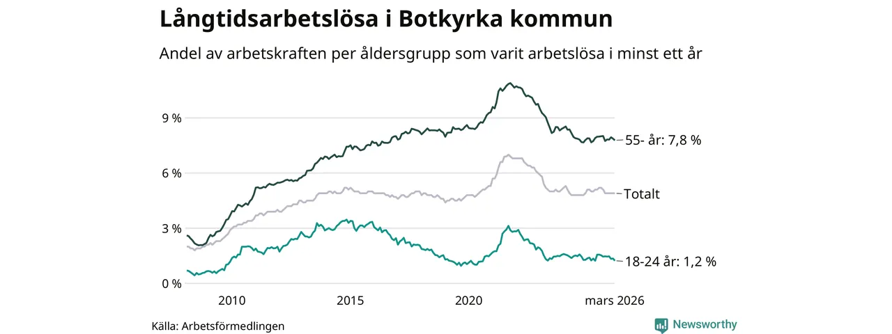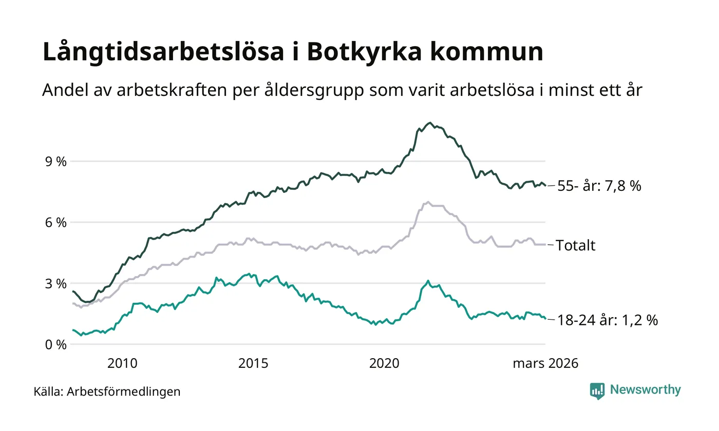 Av de 2 413 personerna som varit arbetslösa i mer än ett år i Botkyrka kommun är 741 personer mellan 55 och 661 år och 64 är mellan 18 och 24 år. För den äldre gruppen är andelen arbetslösa 7,8 procent medan den i den yngre gruppen är 1,2 procent. Även i riket som helhet är långtidsarbetslösheten högre i gruppen äldre.