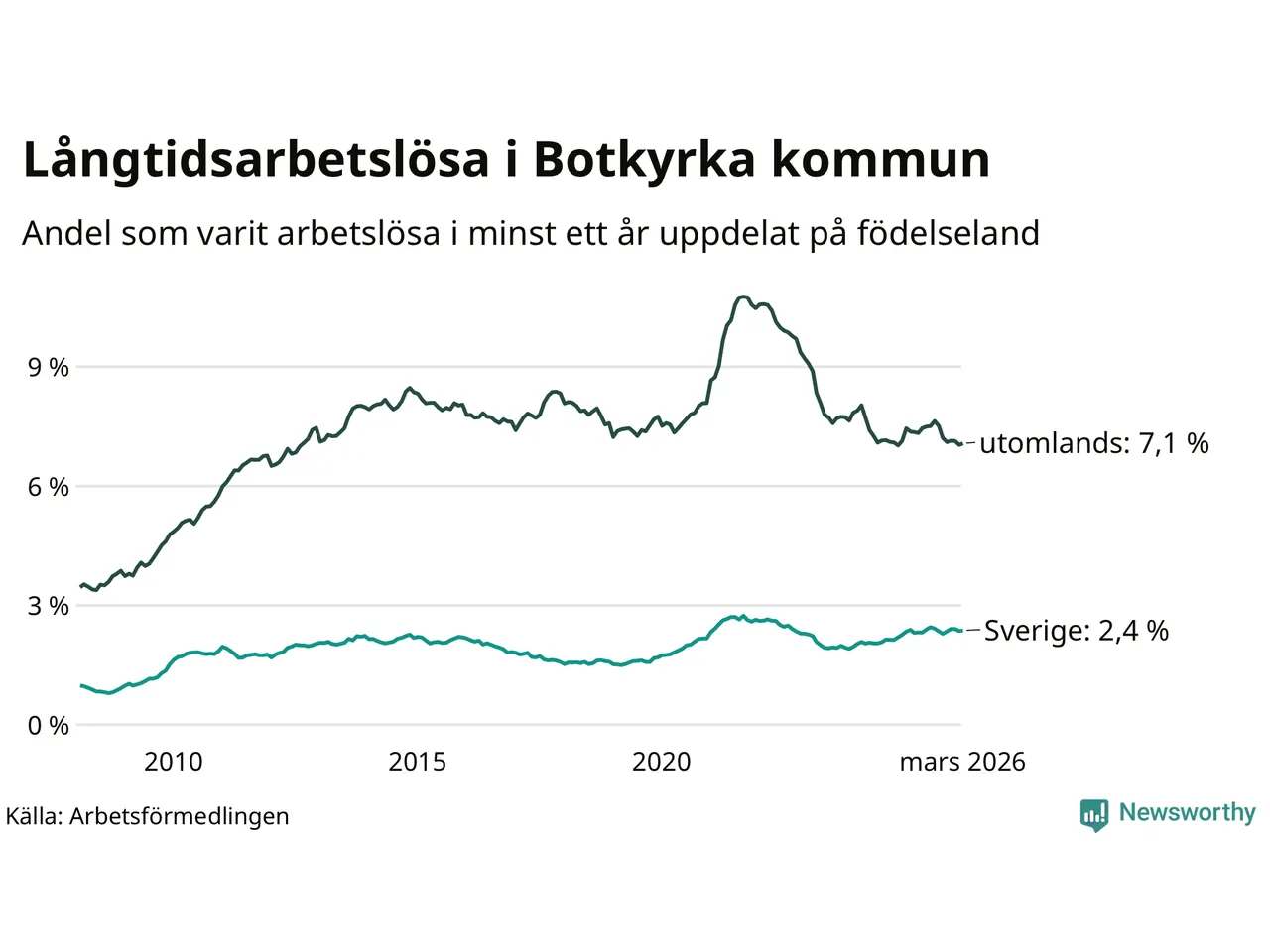 543 av de långtidsarbetslösa i Botkyrka är födda i Sverige, medan 1 870 är födda utomlands. Det innebär att långtidsarbetslösheten bland Sverigefödda är 2,4 procent, medan den är tre gånger så hög – 7,1 procent – bland födda utomlands. Även i riket som helhet är arbetslösheten högre bland utrikesfödda.