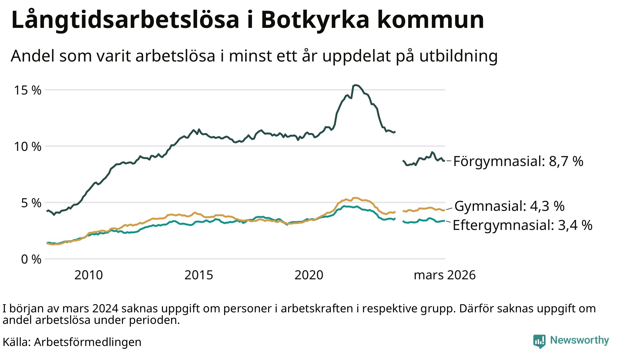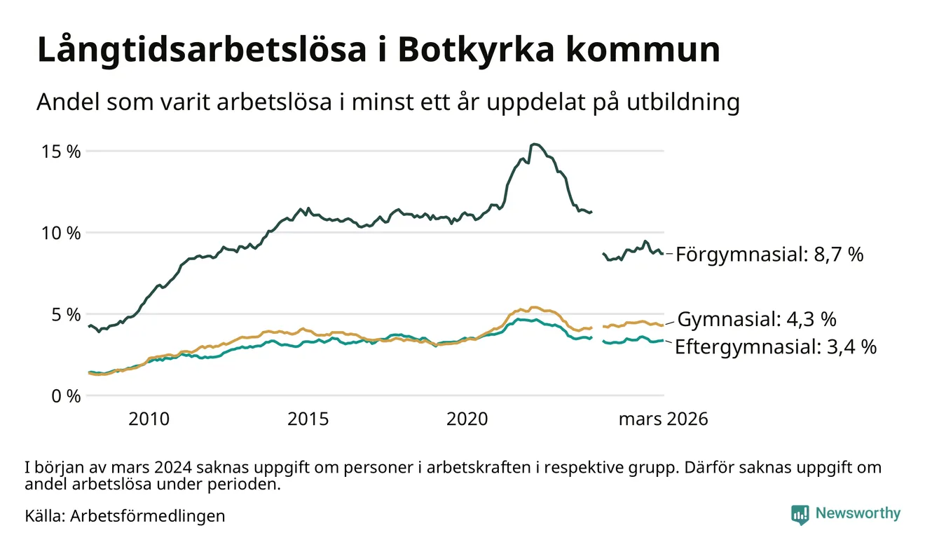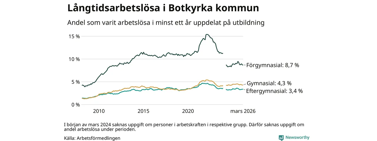 Totalt i riket hade omkring 152 000 personer varit utan arbete i minst ett år i mars. Det motsvarar 2,9 procent av arbetskraften, vilket är ungefär lika stor andel som för ett år sedan.