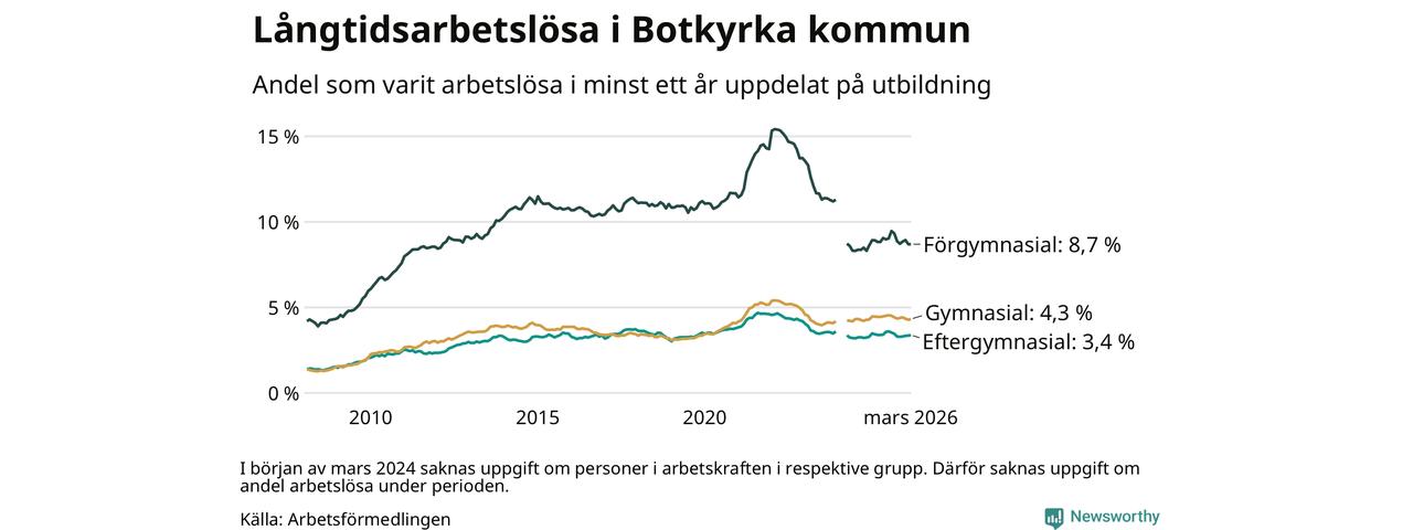 I mars hade 2 413 Botkyrkabor varit arbetslösa i minst ett år, vilket är 15 fler än månaden innan. 2 413 personer motsvarar 4,9 procent av arbetskraften i kommunen – andelen långtidsarbetslösa är ungefär på samma nivå som för ett år sedan. Botkyrka tillhör de kommuner som har högst andel långtidsarbetslösa i hela landet just nu.