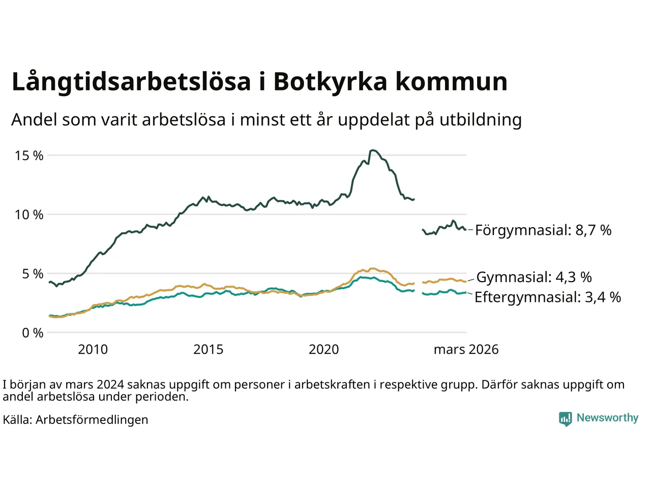 | Bland dem med gymnasieutbildning | 4,3 % | 2,8 % | 2,4 % |