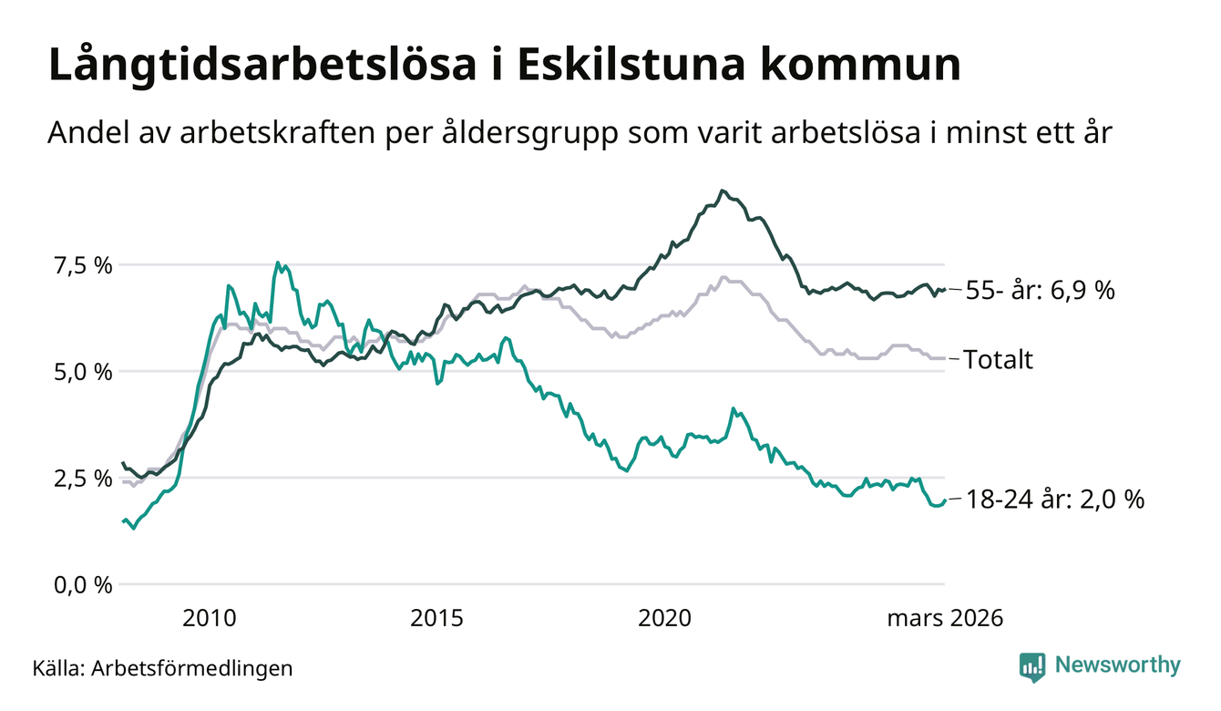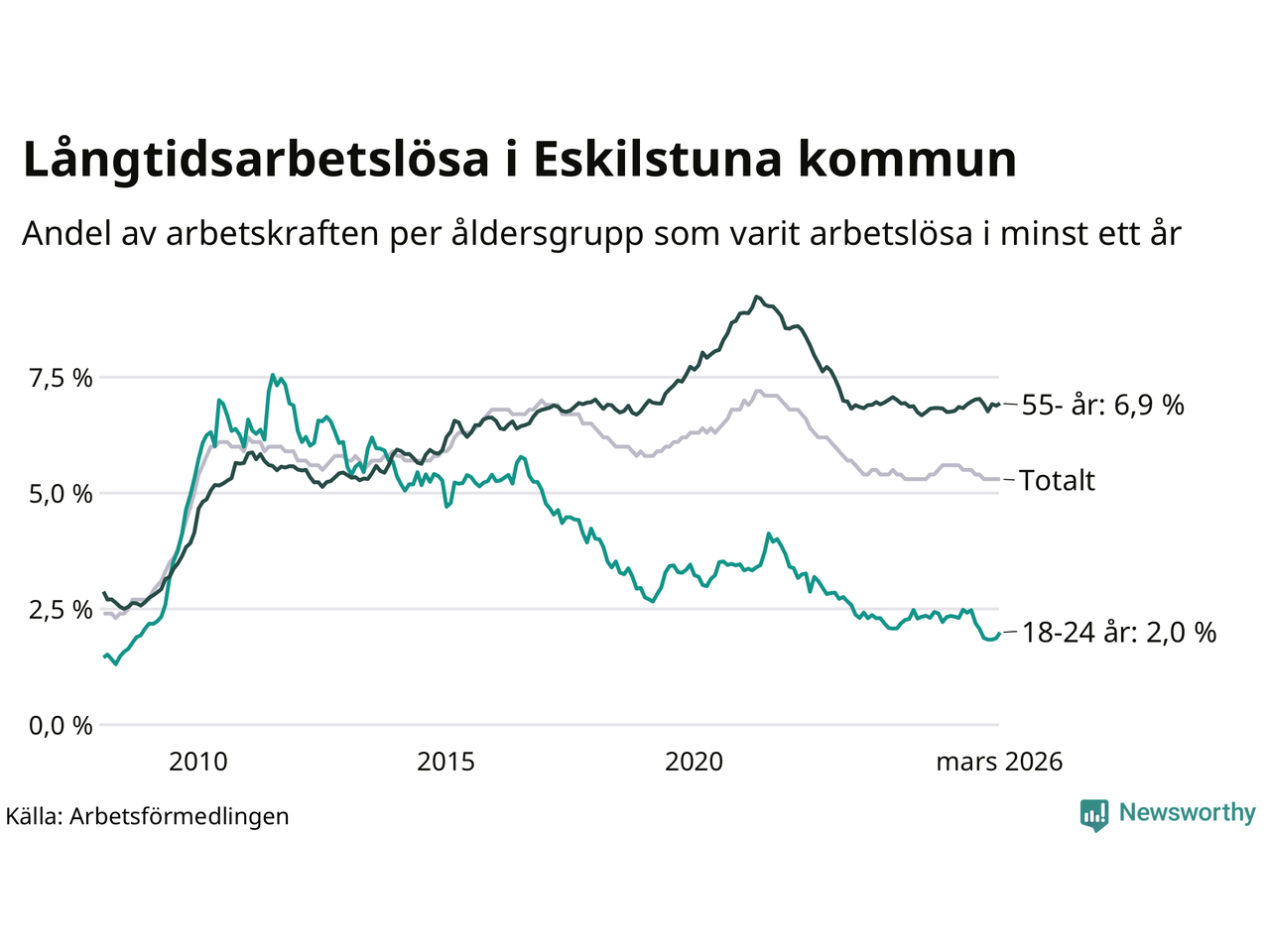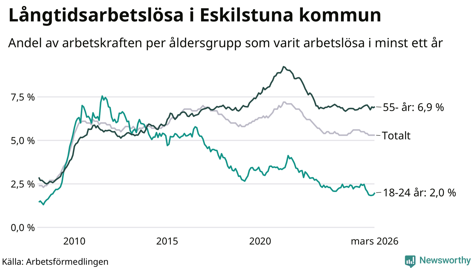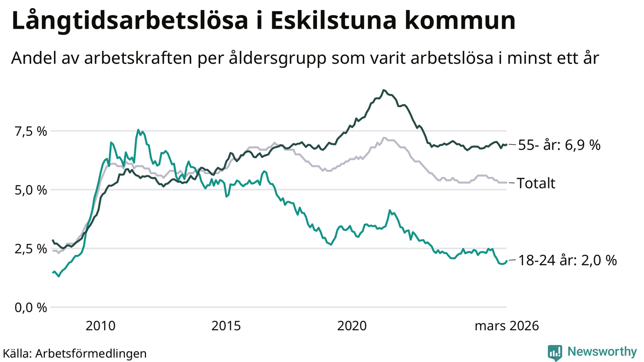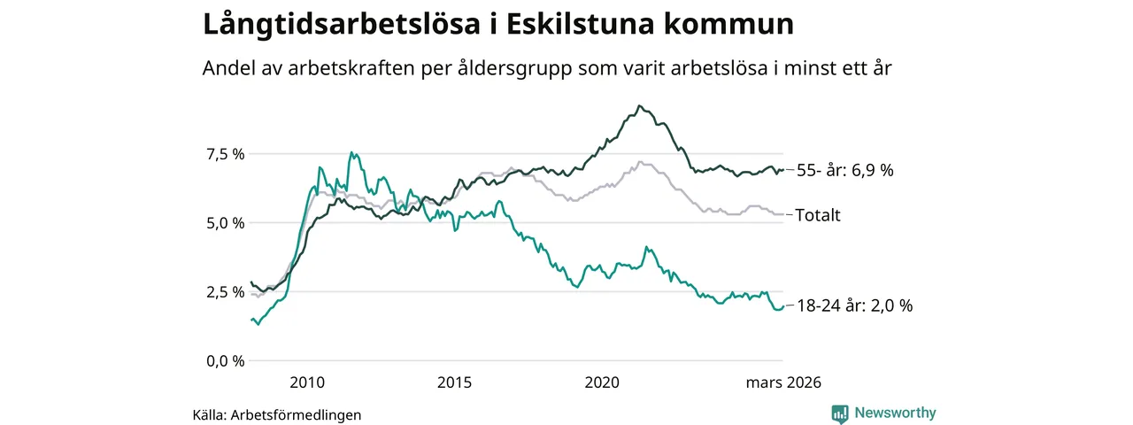 Av de 2 789 personerna som varit arbetslösa i mer än ett år i Eskilstuna kommun är 803 personer mellan 55 och 661 år och 113 är mellan 18 och 24 år. För den äldre gruppen är andelen arbetslösa 6,9 procent medan den i den yngre gruppen är 2,0 procent. Även i riket som helhet är långtidsarbetslösheten högre i gruppen äldre.