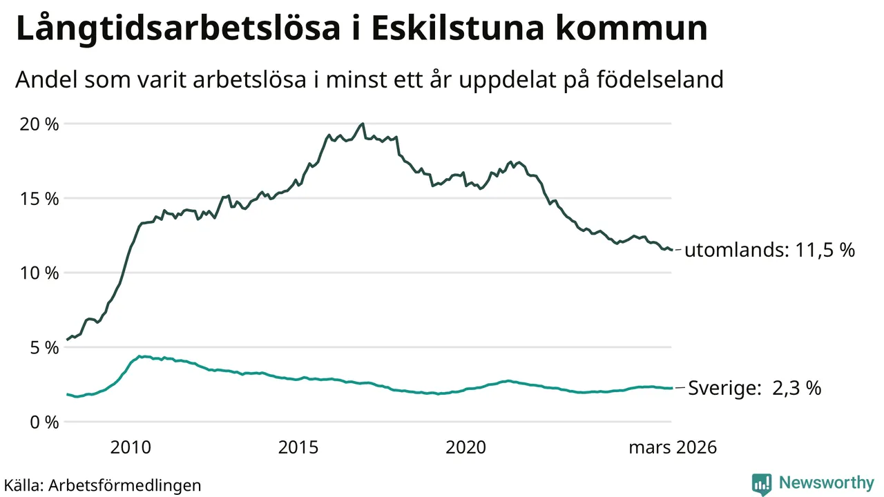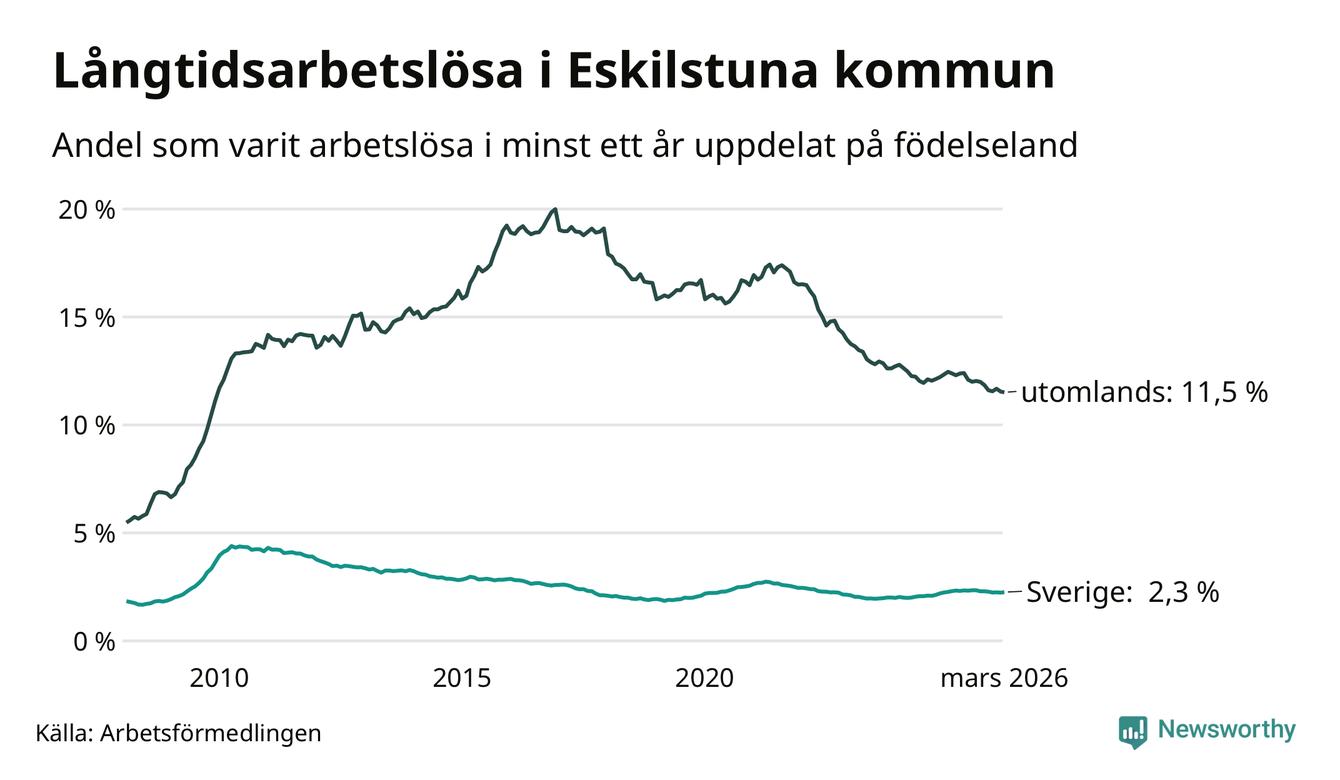808 av de långtidsarbetslösa i Eskilstuna är födda i Sverige, medan 1 981 är födda utomlands. Det innebär att långtidsarbetslösheten bland Sverigefödda är 2,3 procent, medan den är fem gånger så hög – 11,5 procent – bland födda utomlands. Även i riket som helhet är arbetslösheten högre bland utrikesfödda.