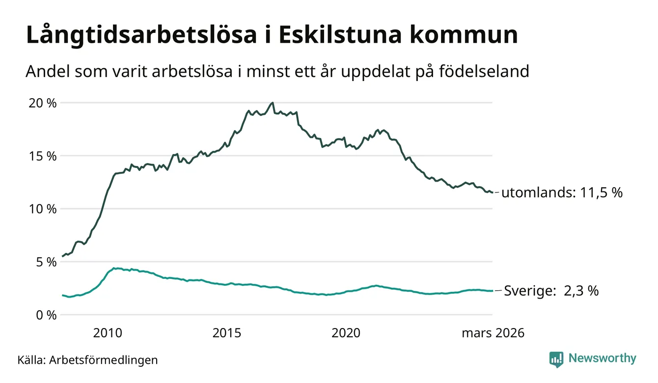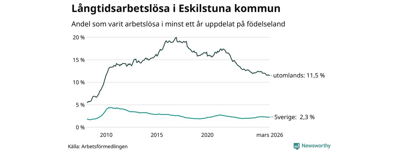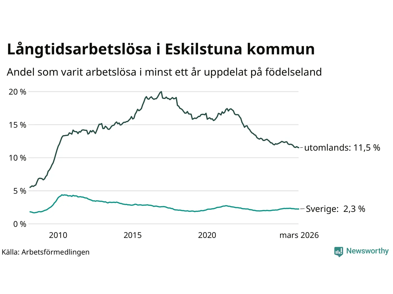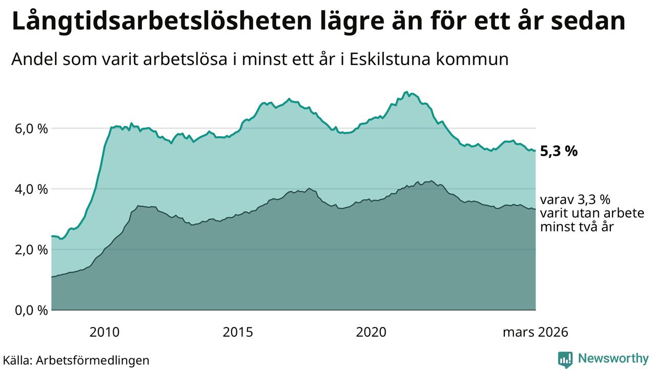 I mars hade 2 789 Eskilstunabor varit arbetslösa i minst ett år, vilket är två fler än månaden innan. 2 789 personer motsvarar 5,3 procent av arbetskraften i kommunen – andelen långtidsarbetslösa är 0,3 procentenheter lägre än samma månad för ett år sedan. Eskilstuna tillhör de kommuner som har högst andel långtidsarbetslösa i hela landet just nu.