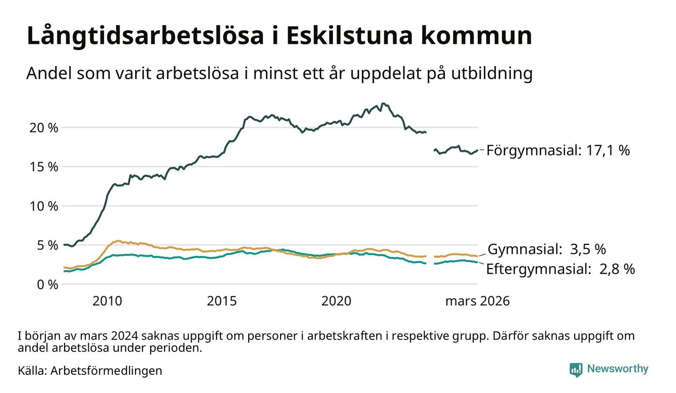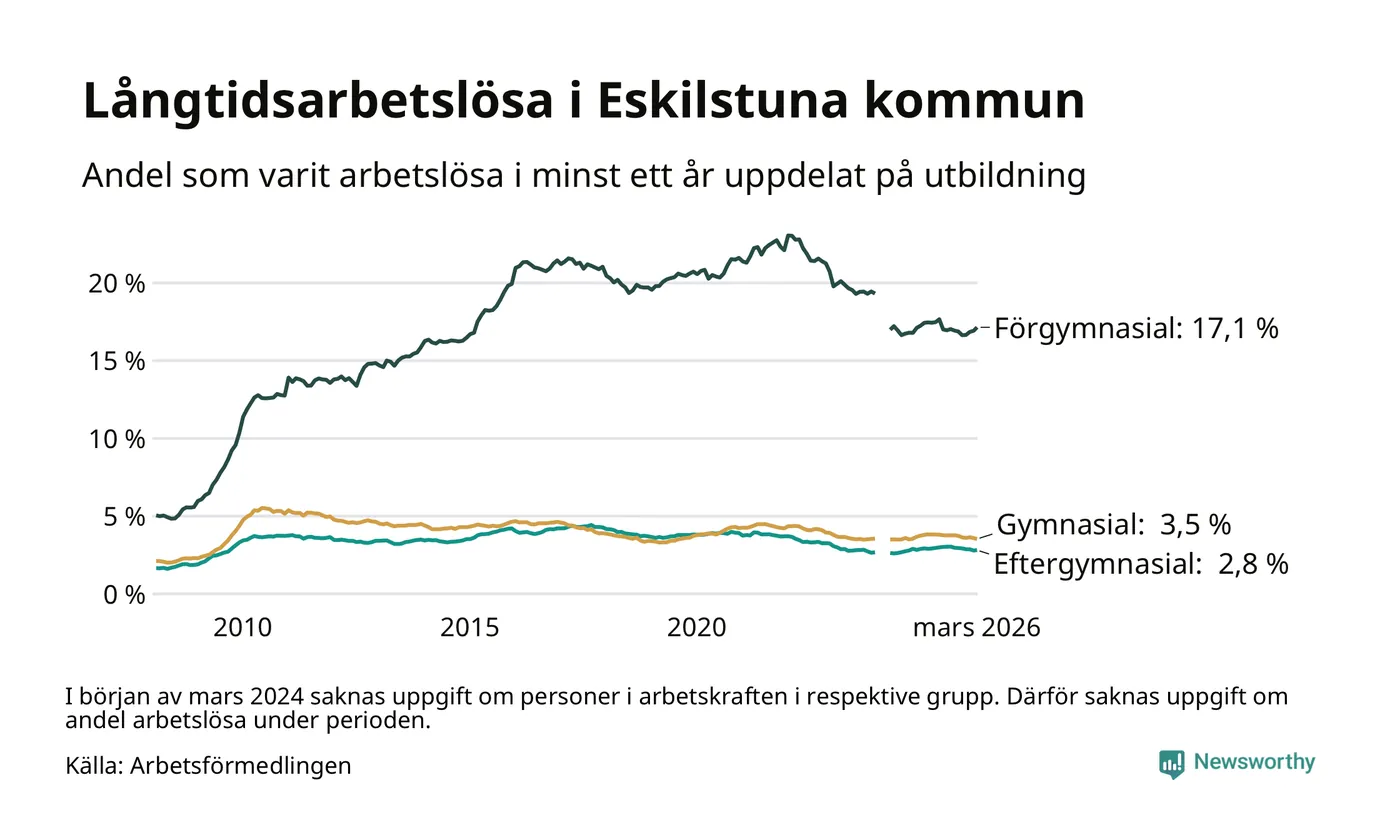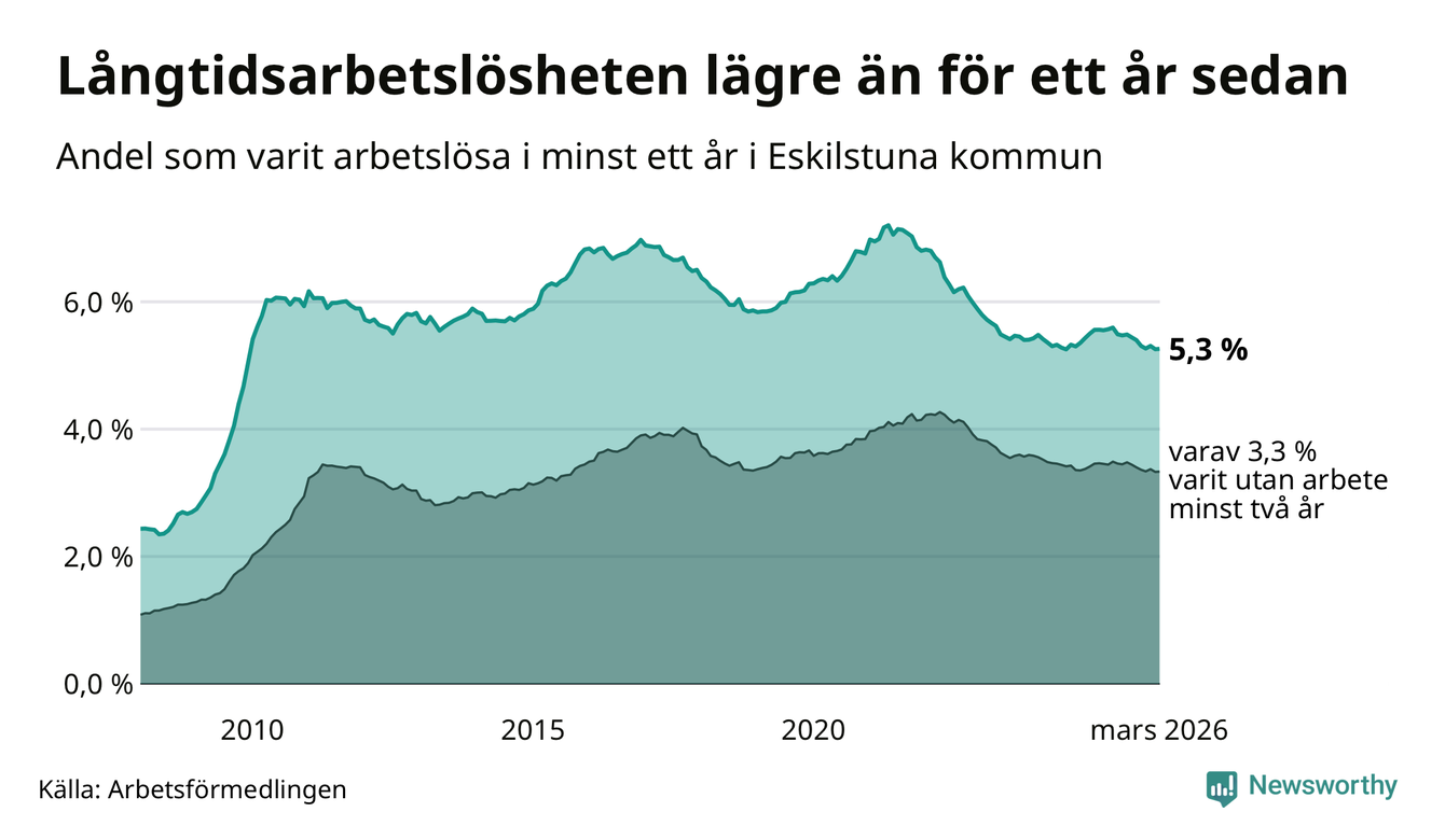 I mars hade 2 789 Eskilstunabor varit arbetslösa i minst ett år, vilket är två fler än månaden innan. 2 789 personer motsvarar 5,3 procent av arbetskraften i kommunen – andelen långtidsarbetslösa är 0,3 procentenheter lägre än samma månad för ett år sedan. Eskilstuna tillhör de kommuner som har högst andel långtidsarbetslösa i hela landet just nu.