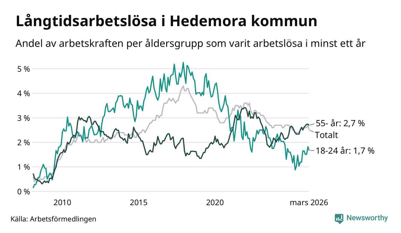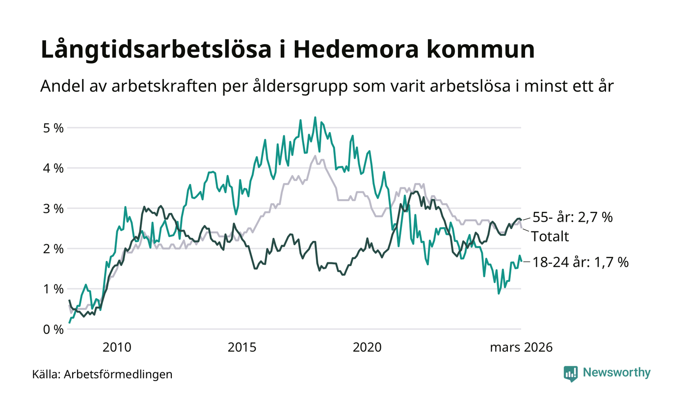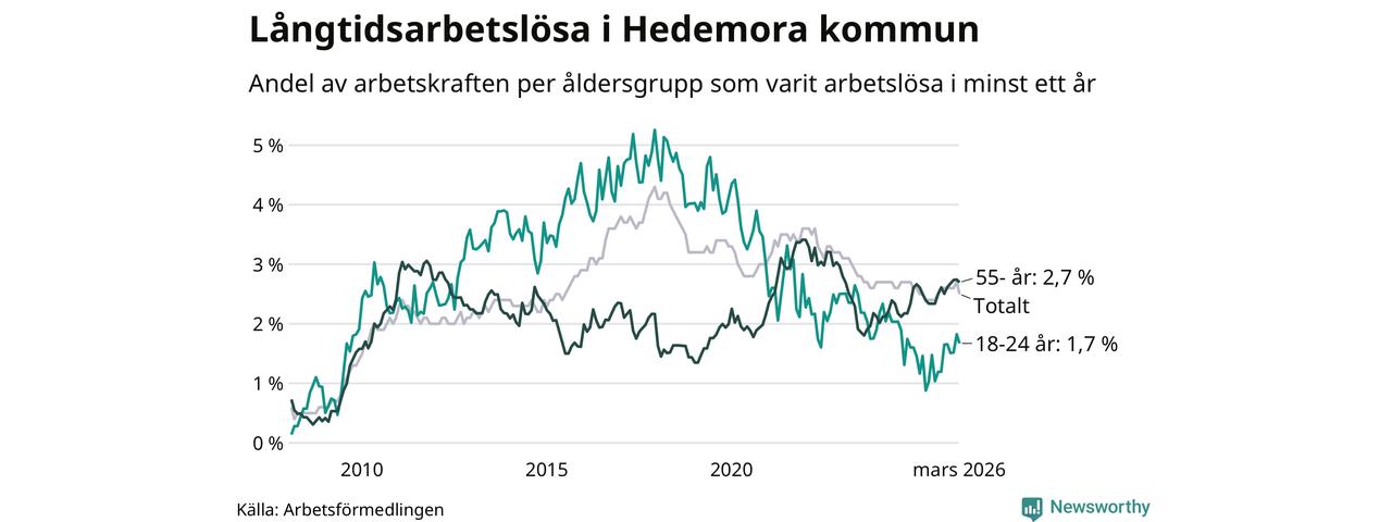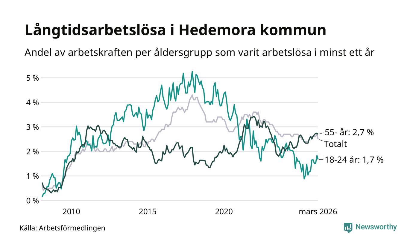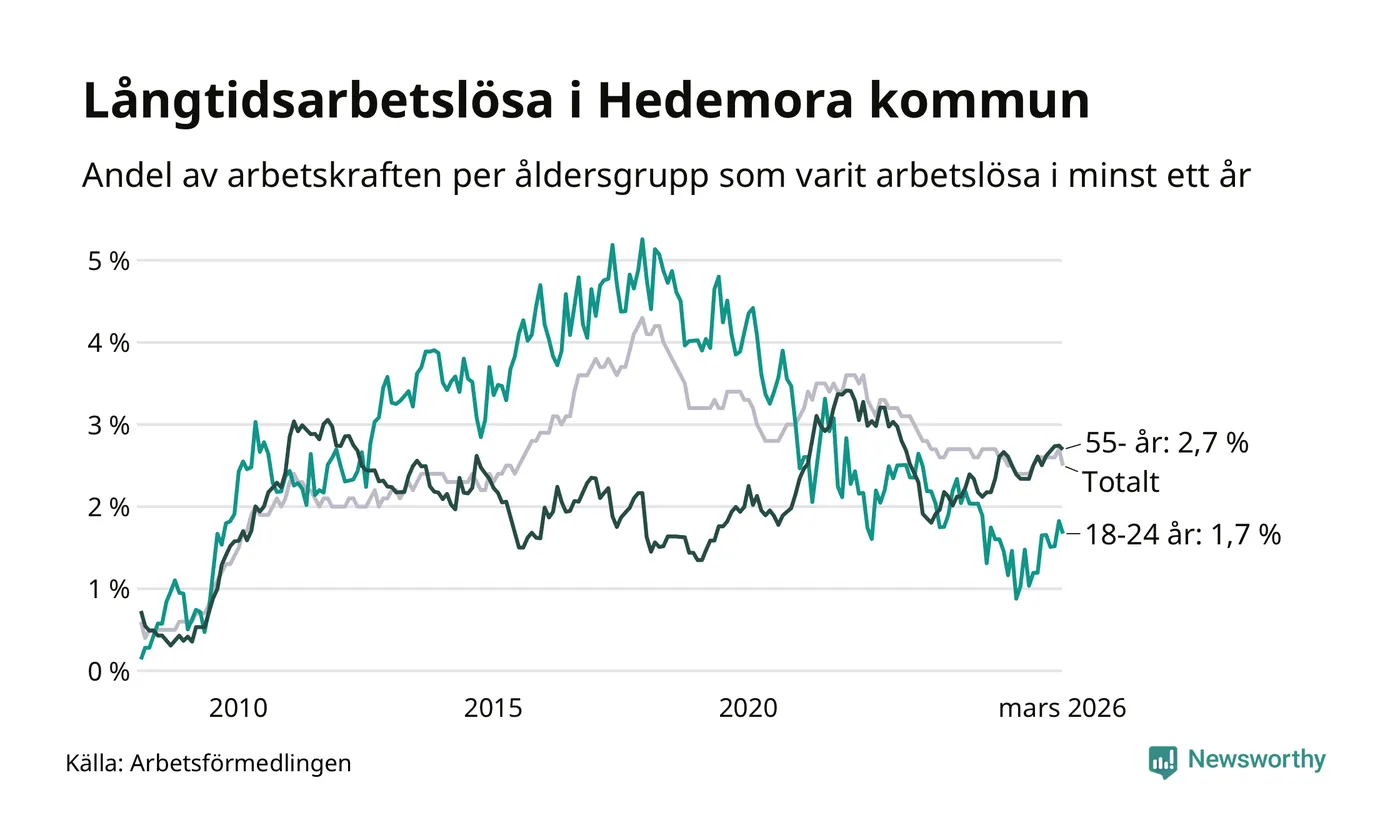 I mars hade 173 Hedemorabor varit arbetslösa i minst ett år, vilket är tolv färre än månaden innan. 173 personer motsvarar 2,5 procent av arbetskraften i kommunen – andelen långtidsarbetslösa är ungefär på samma nivå som för ett år sedan.
