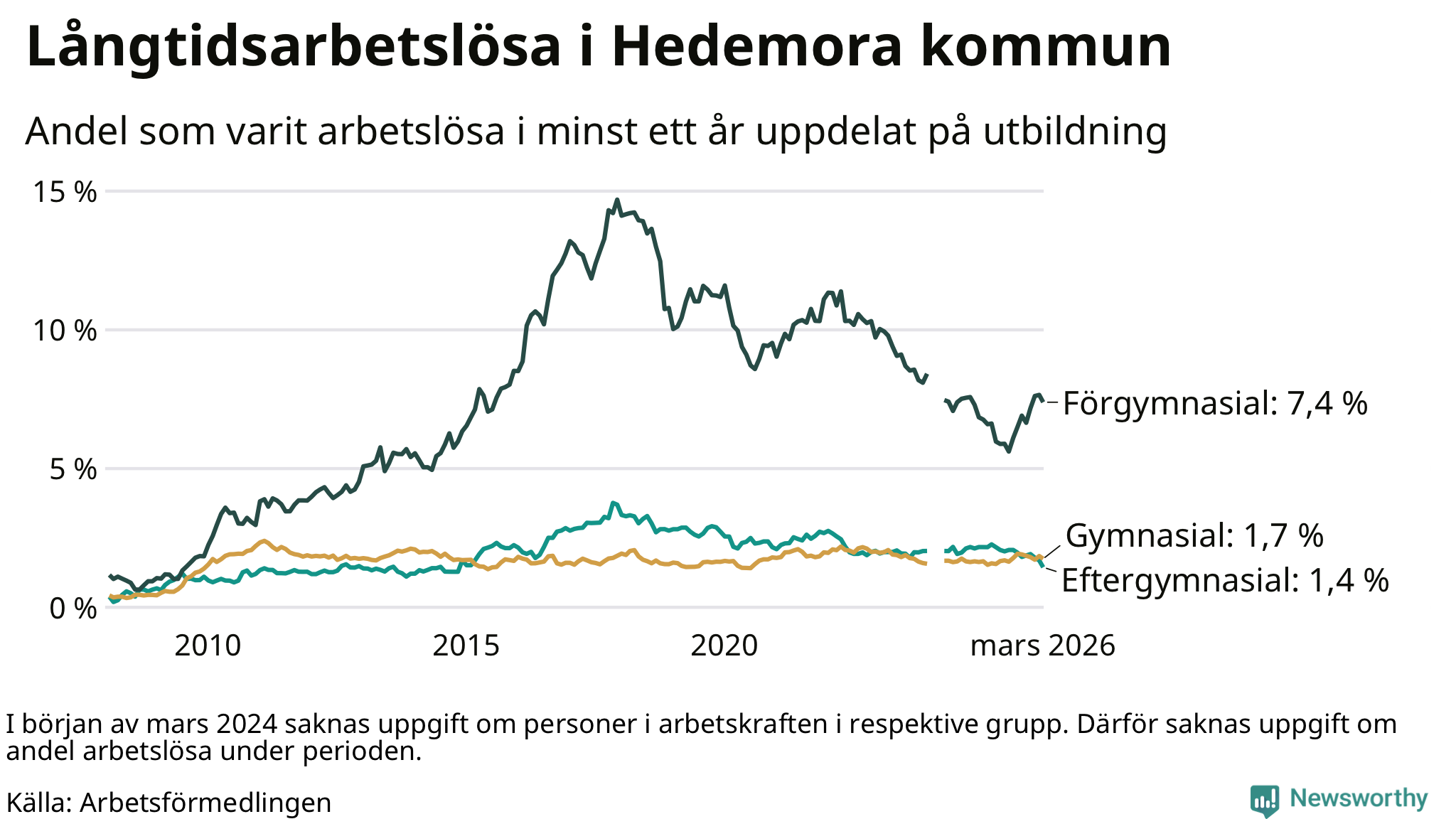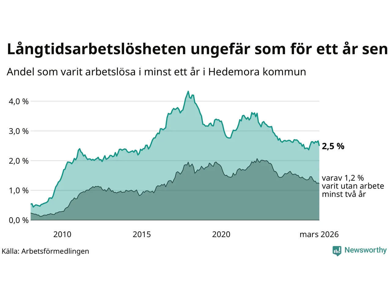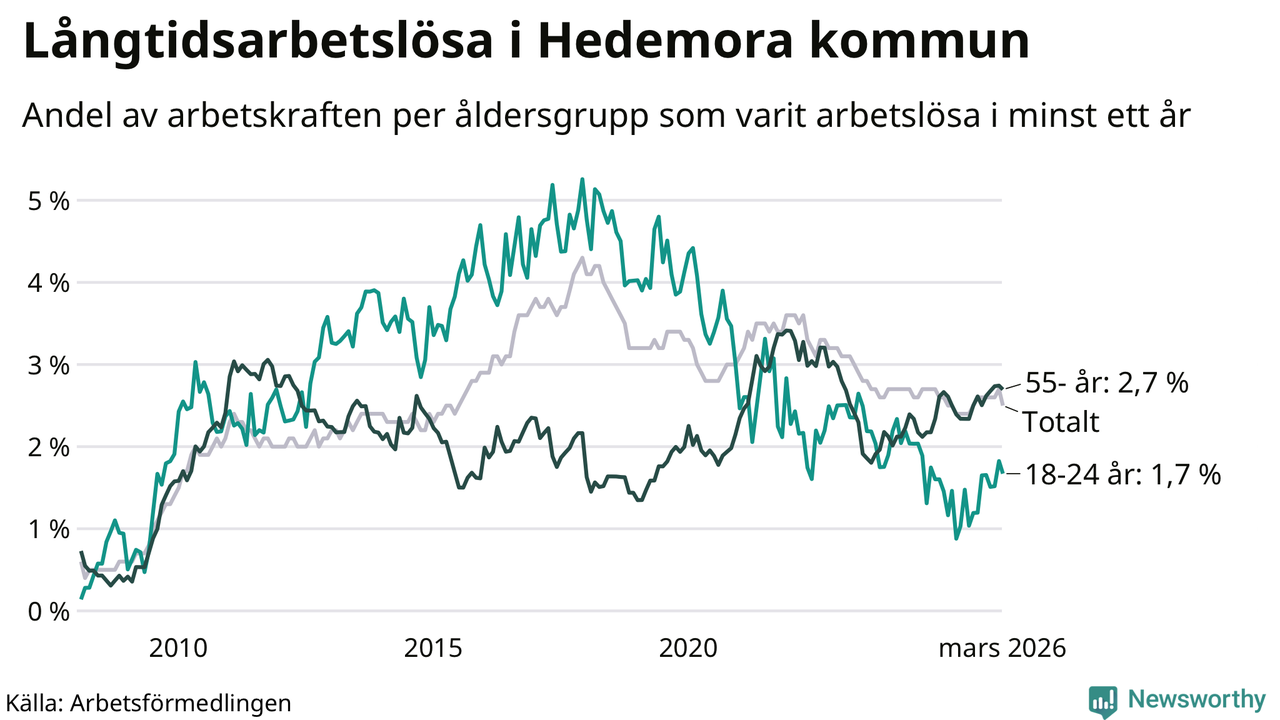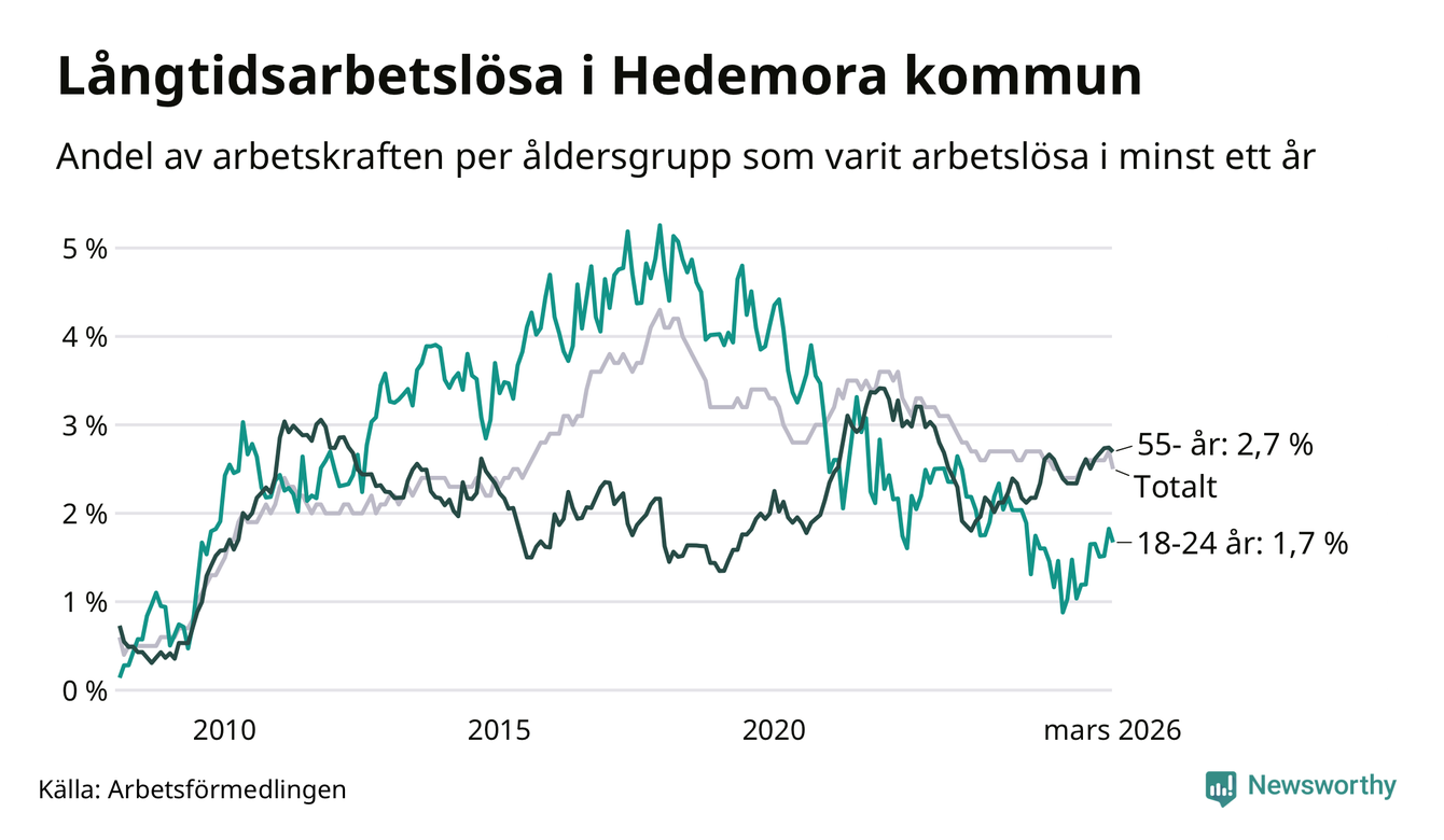 I mars hade 173 Hedemorabor varit arbetslösa i minst ett år, vilket är tolv färre än månaden innan. 173 personer motsvarar 2,5 procent av arbetskraften i kommunen – andelen långtidsarbetslösa är ungefär på samma nivå som för ett år sedan.