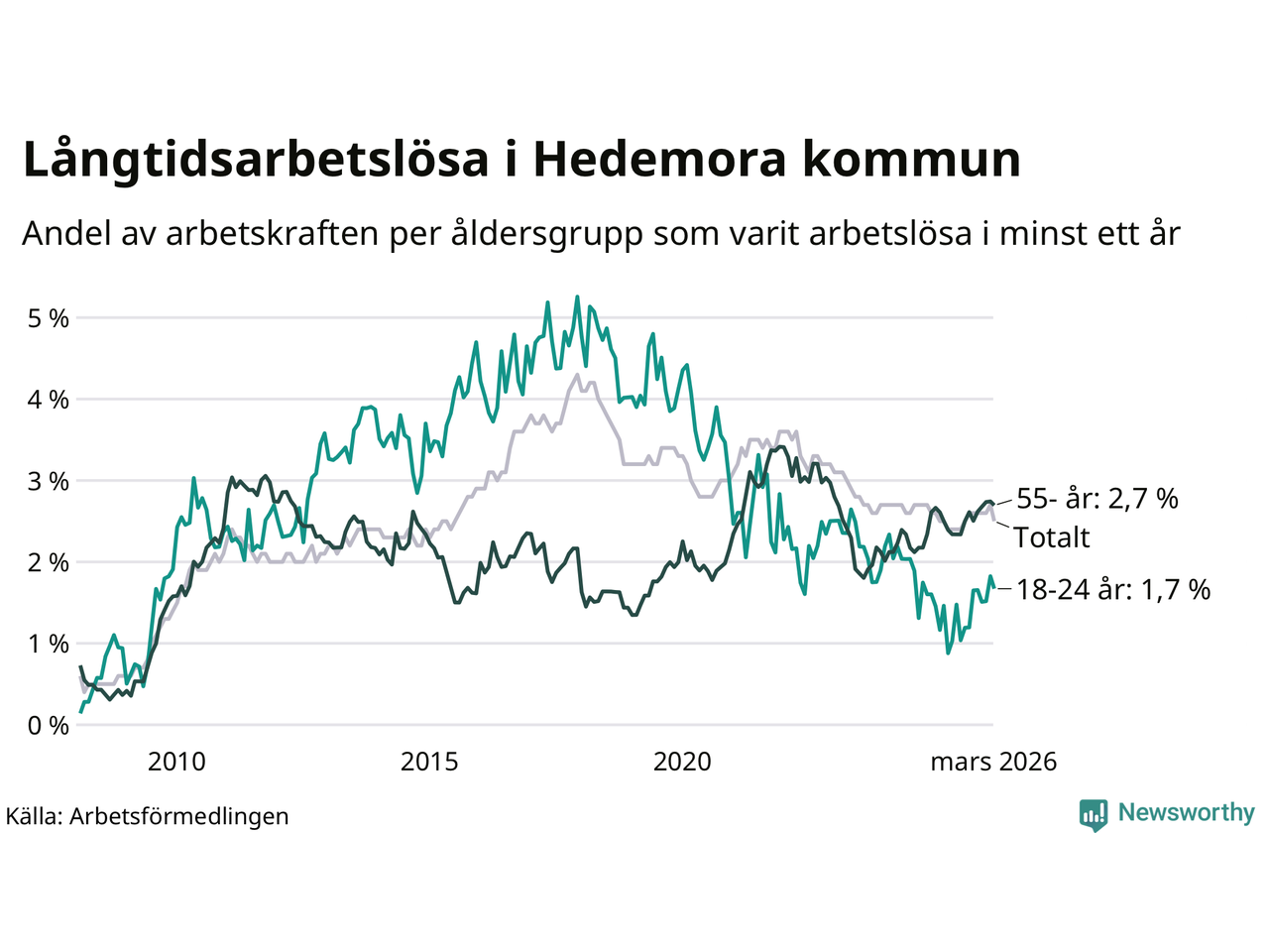 Graf: Andel arbetslösa uppdelat i åldersgrupper i Hedemora