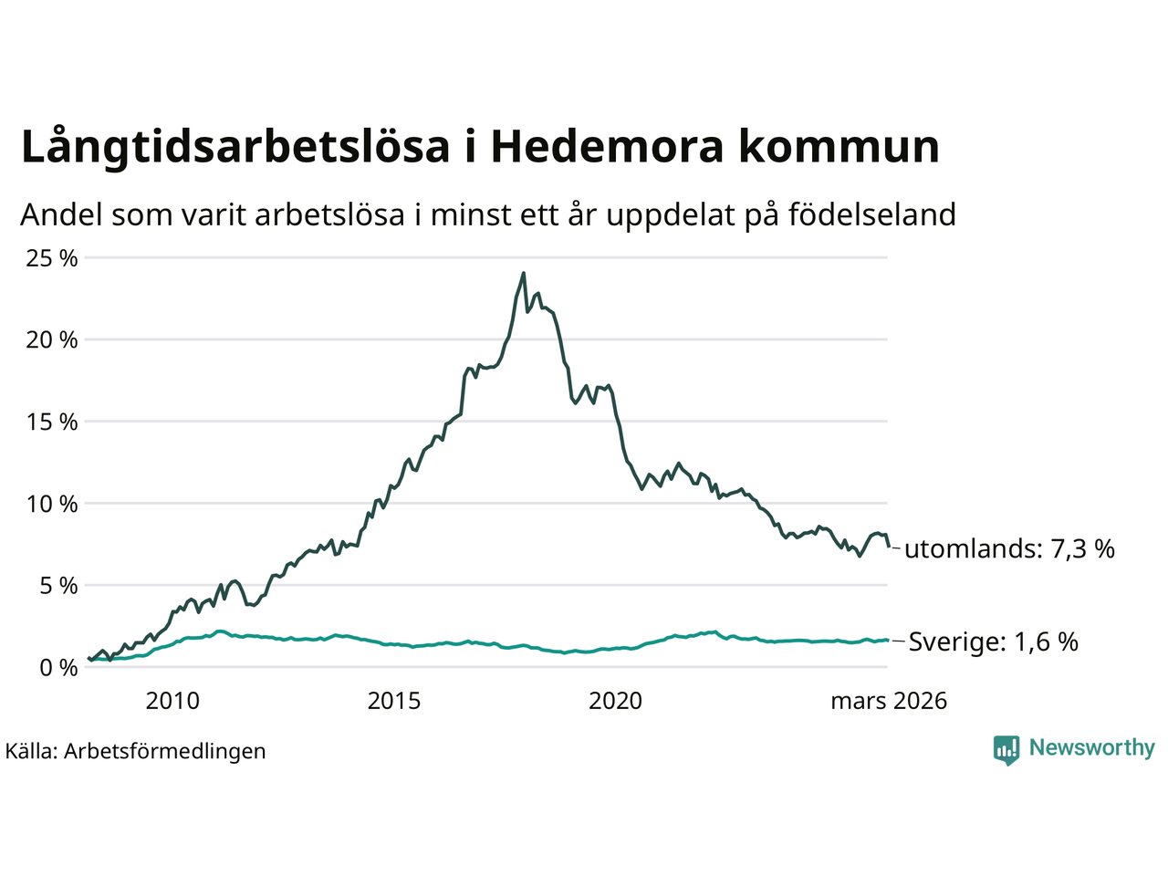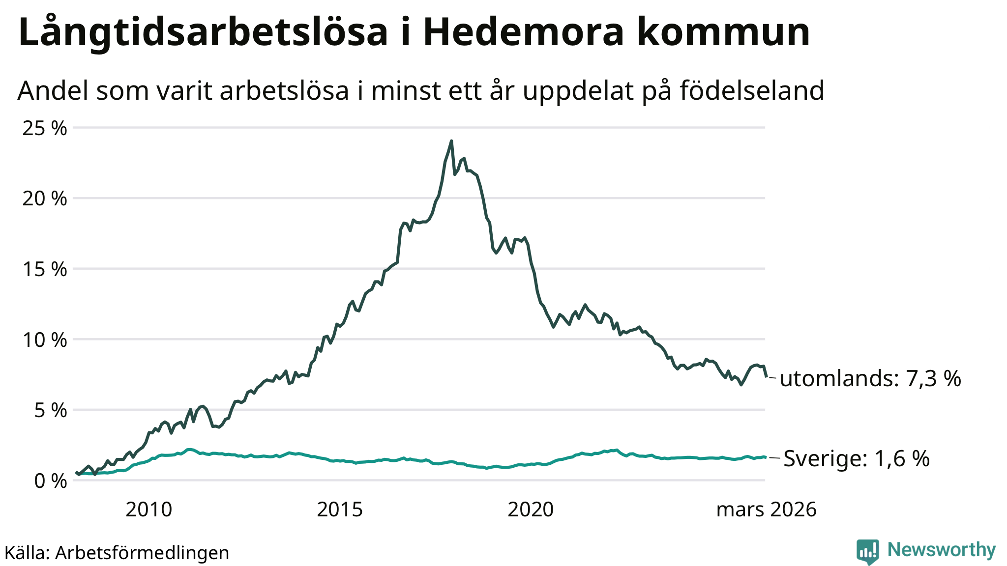 Graf: Andel arbetslösa uppdelat på födelseland i Hedemora
