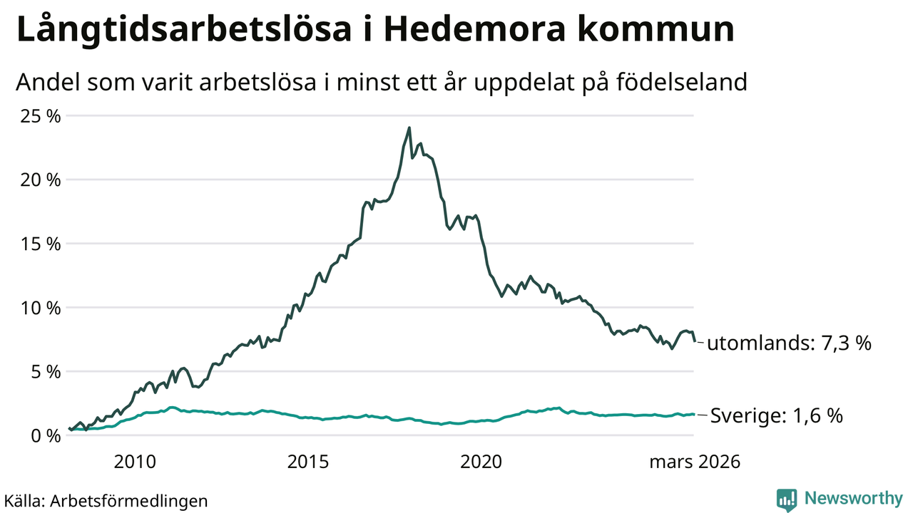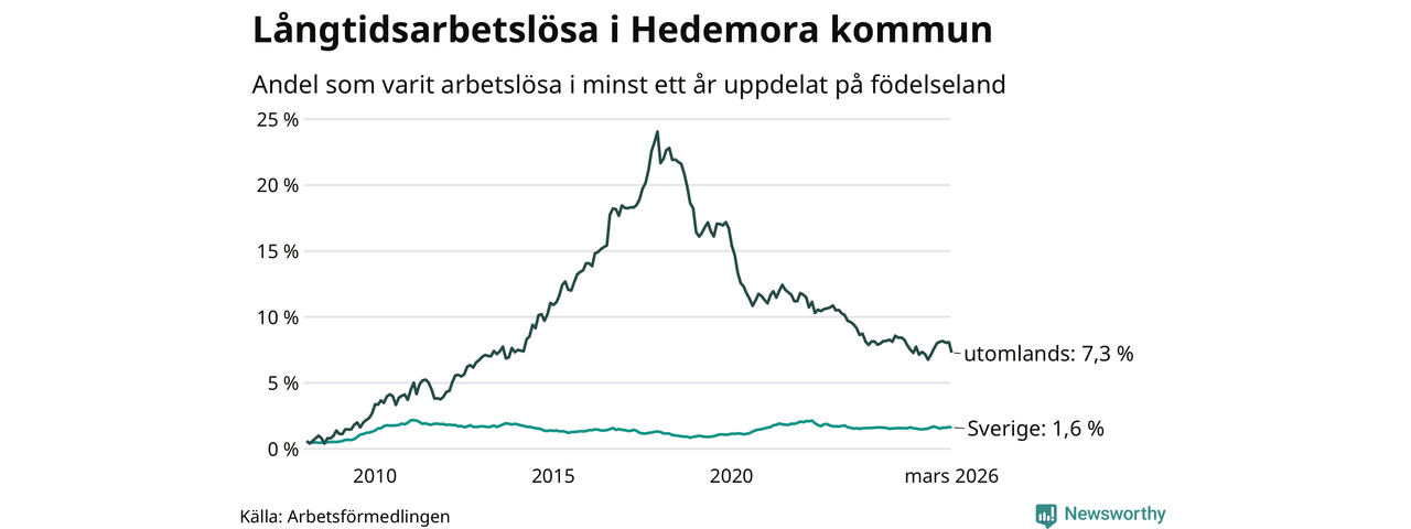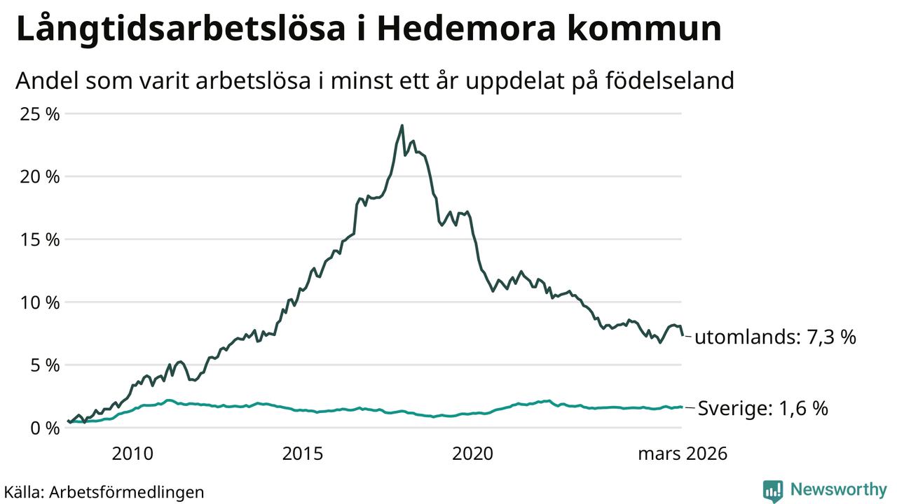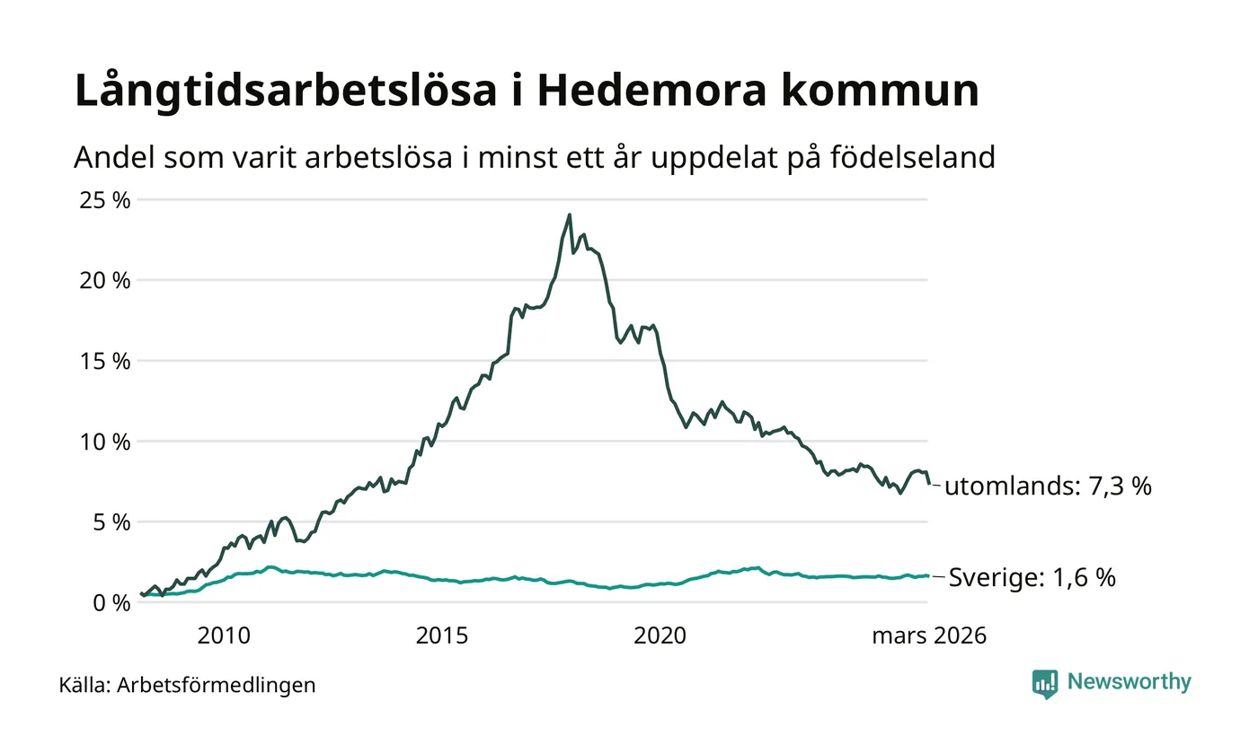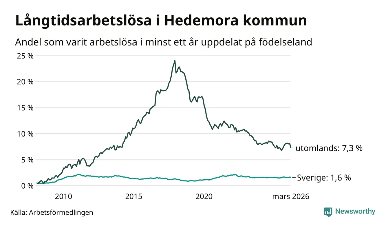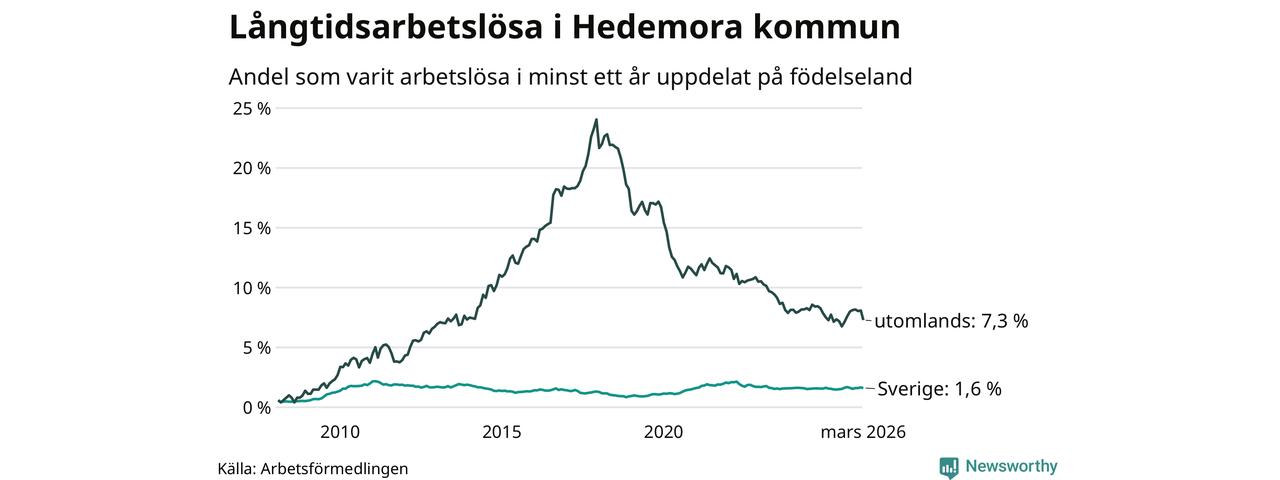 94 av de långtidsarbetslösa i Hedemora är födda i Sverige, medan 79 är födda utomlands. Det innebär att långtidsarbetslösheten bland Sverigefödda är 1,6 procent, medan den är fem gånger så hög – 7,3 procent – bland födda utomlands. Även i riket som helhet är arbetslösheten högre bland utrikesfödda.