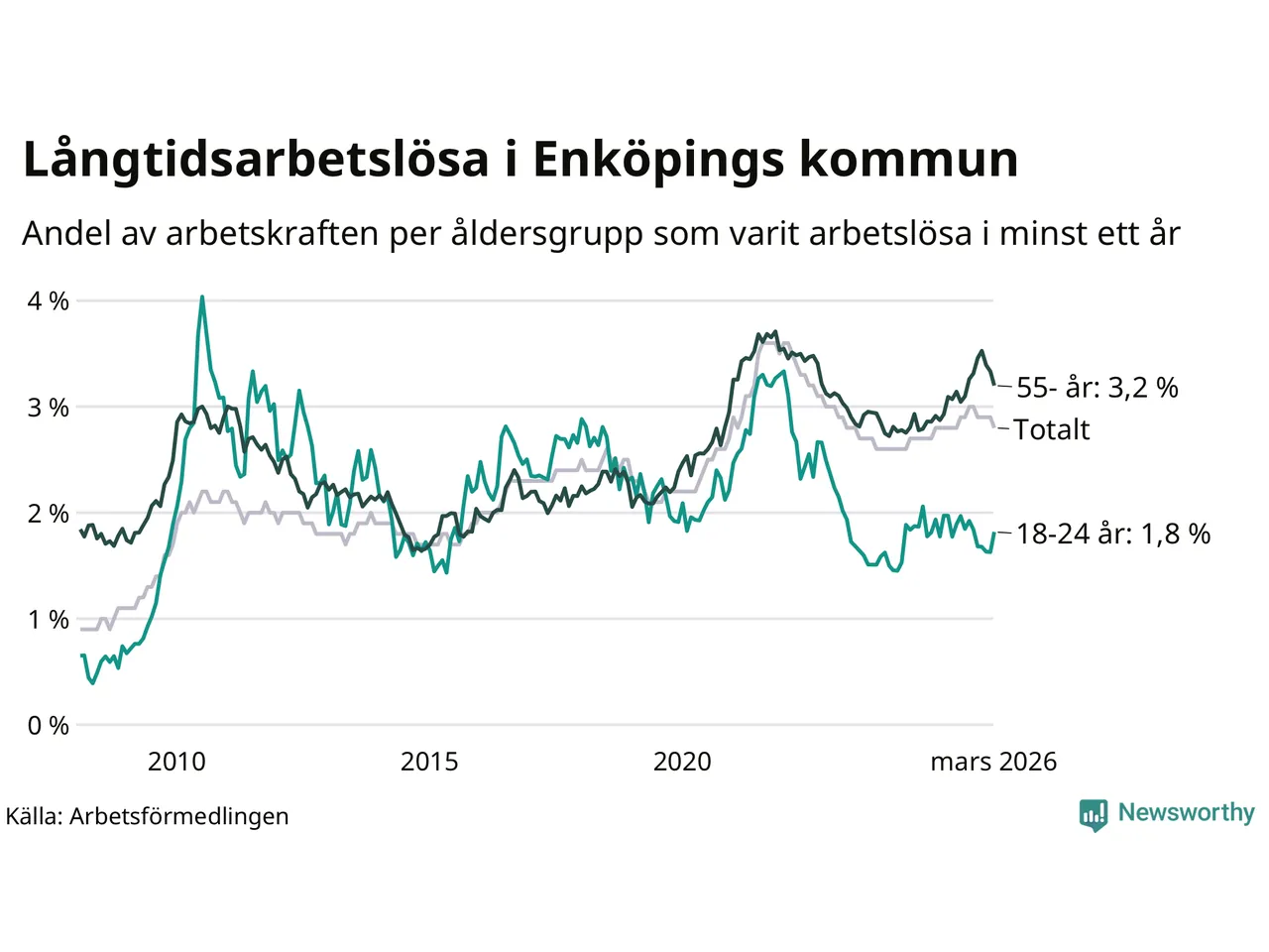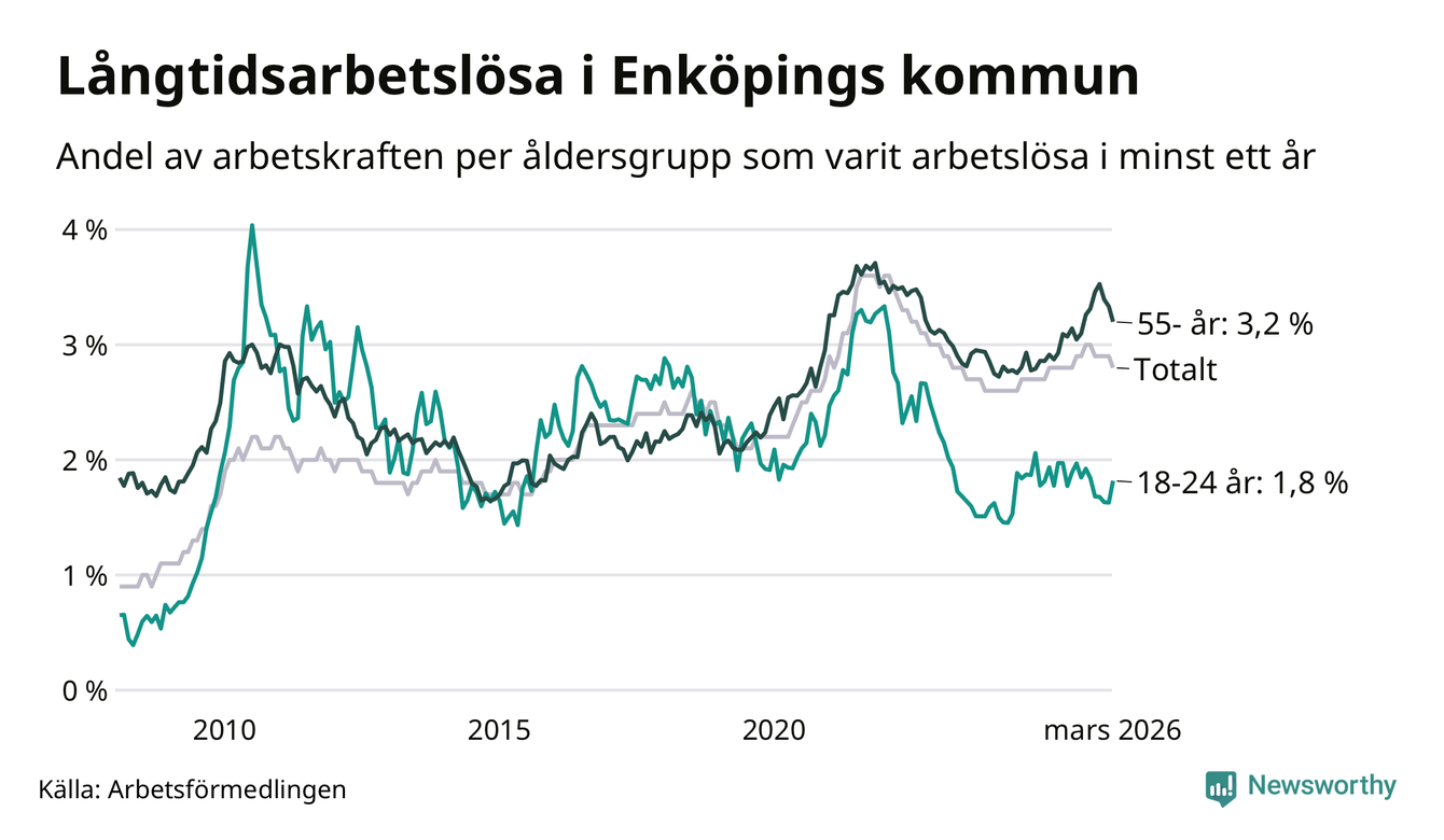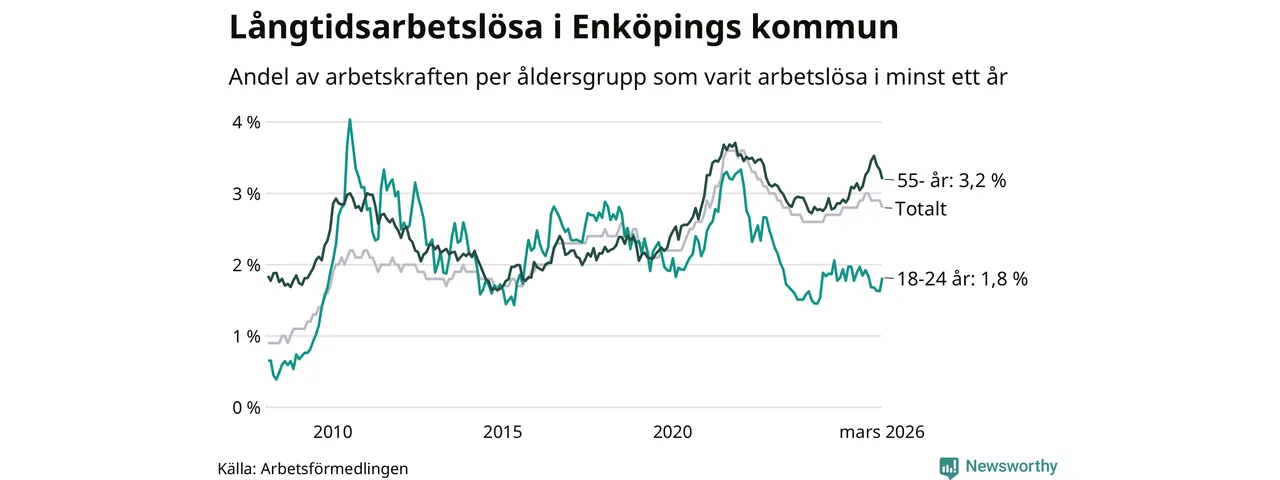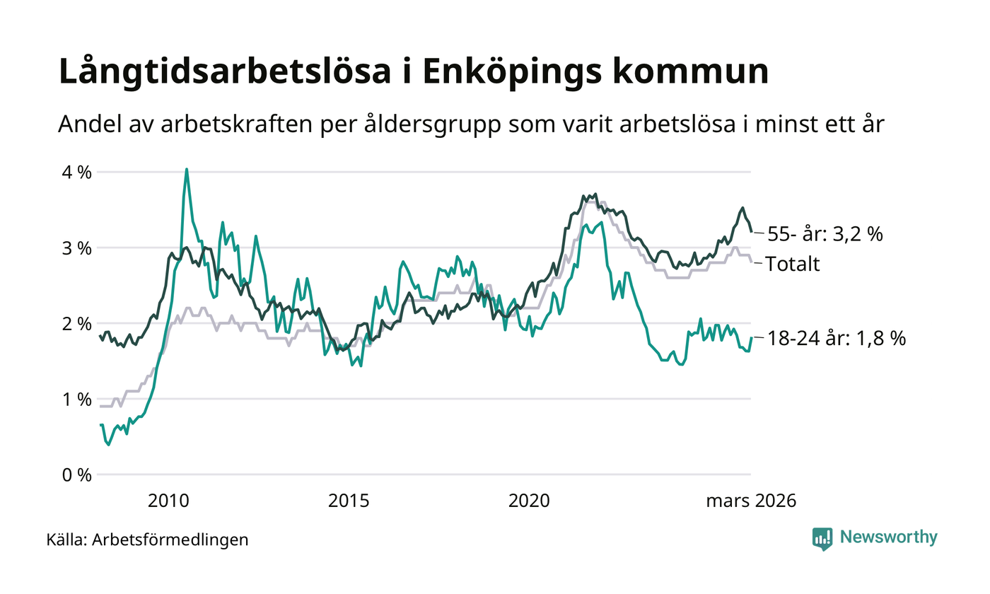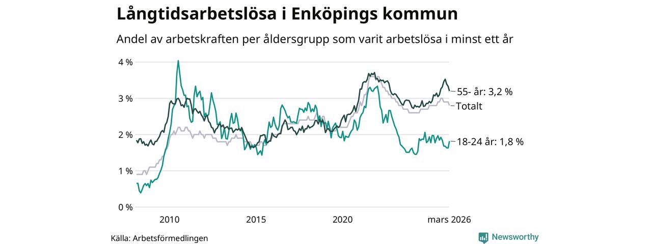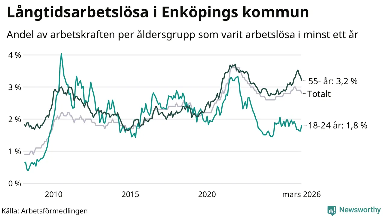 Av de 689 personerna som varit arbetslösa i mer än ett år i Enköpings kommun är 174 personer mellan 55 och 661 år och 47 är mellan 18 och 24 år. För den äldre gruppen är andelen arbetslösa 3,2 procent medan den i den yngre gruppen är 1,8 procent. Även i riket som helhet är långtidsarbetslösheten högre i gruppen äldre.