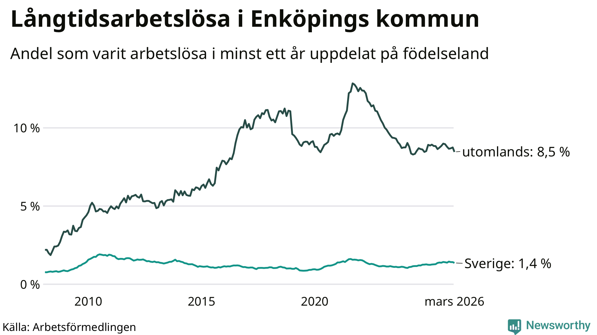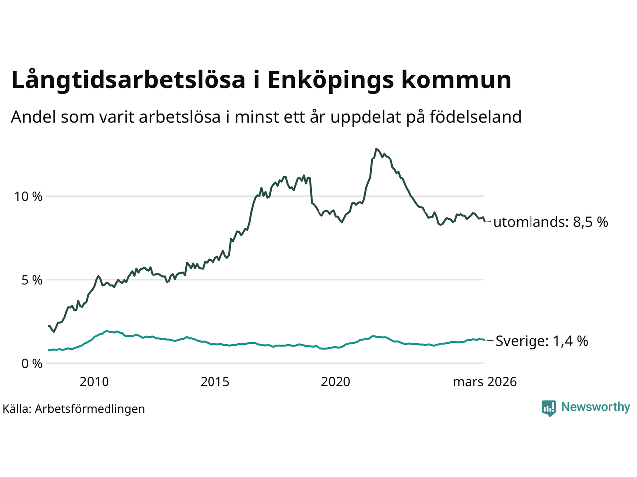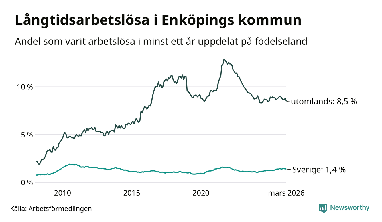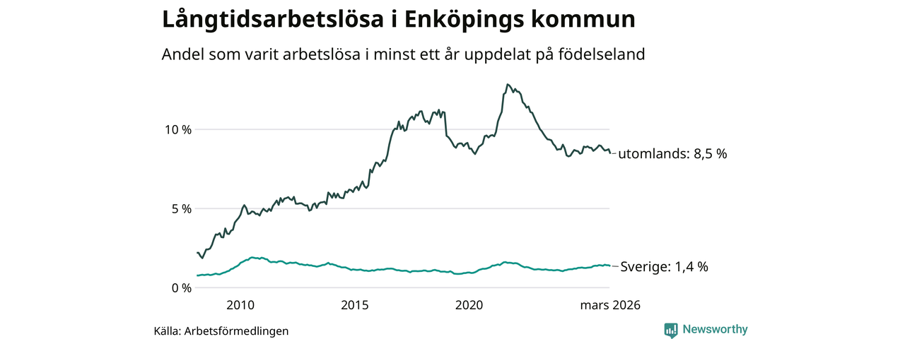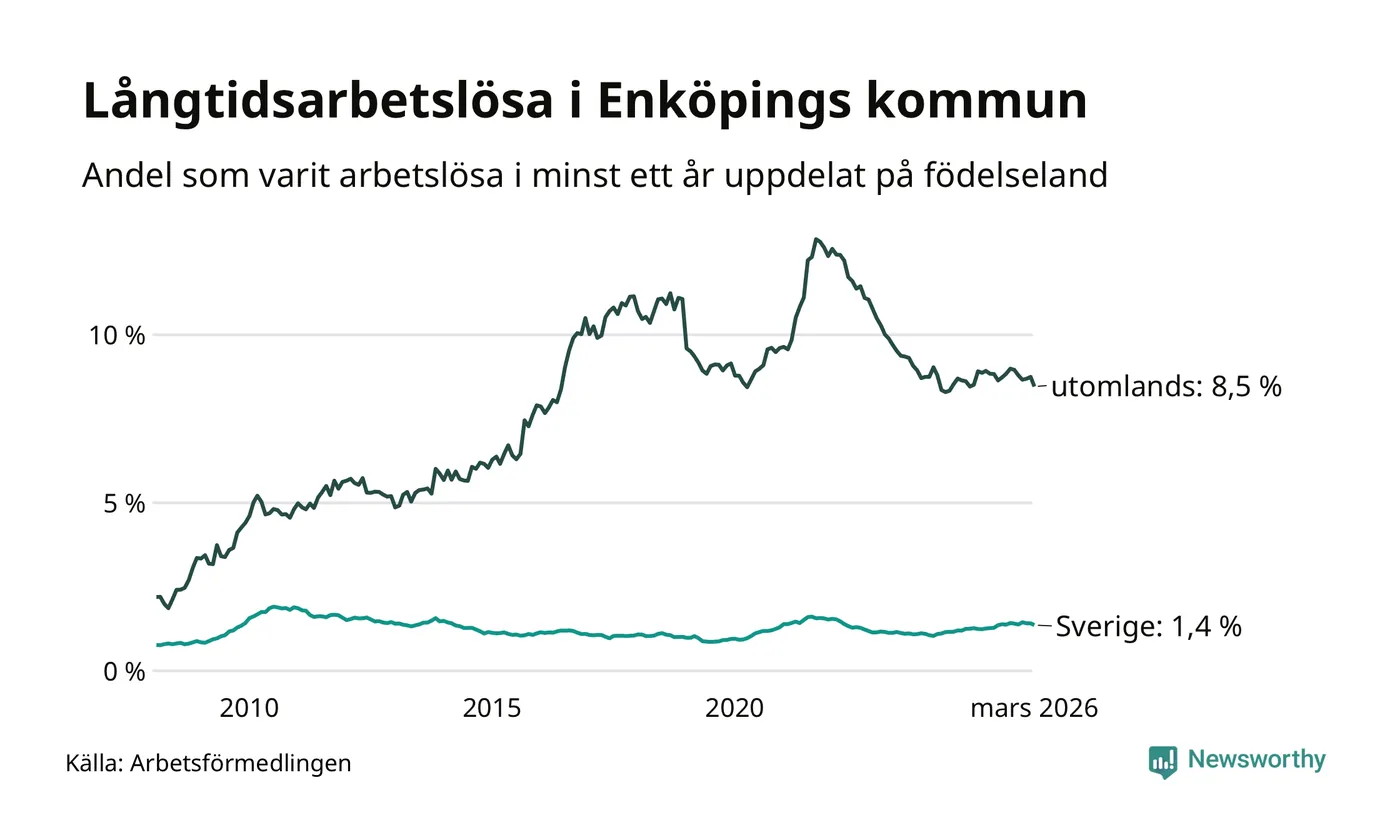 265 av de långtidsarbetslösa i Enköping är födda i Sverige, medan 424 är födda utomlands. Det innebär att långtidsarbetslösheten bland Sverigefödda är 1,4 procent, medan den är sex gånger så hög – 8,5 procent – bland födda utomlands. Även i riket som helhet är arbetslösheten högre bland utrikesfödda.